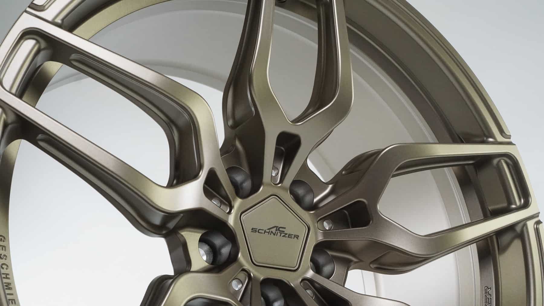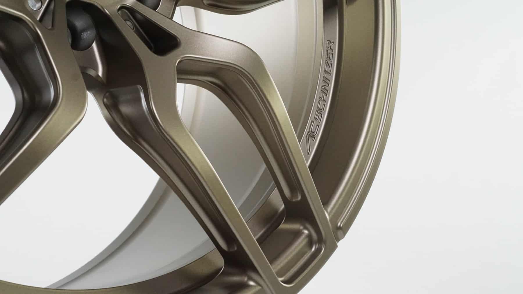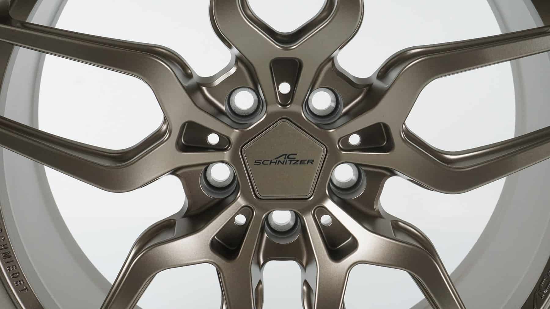 The one-piece wheel comes with a so-called Techgold eye-grabbing finish featuring a clear lacquer and a spoke design said to take after the rotor blades of a helicopter. AC Schnitzer fits a pentagonal hub cap as a nod to past wheels offered by the aftermarket specialist.