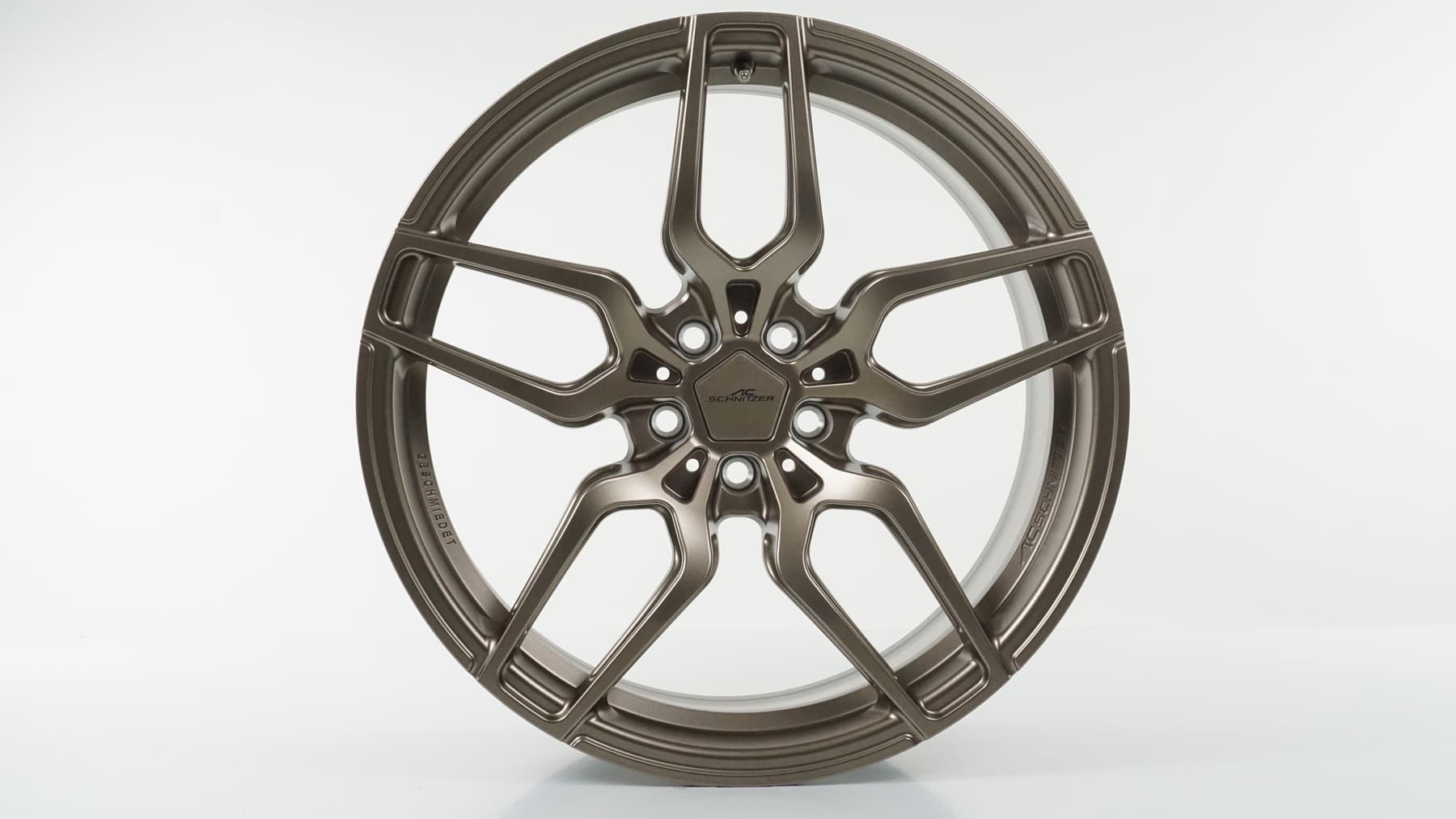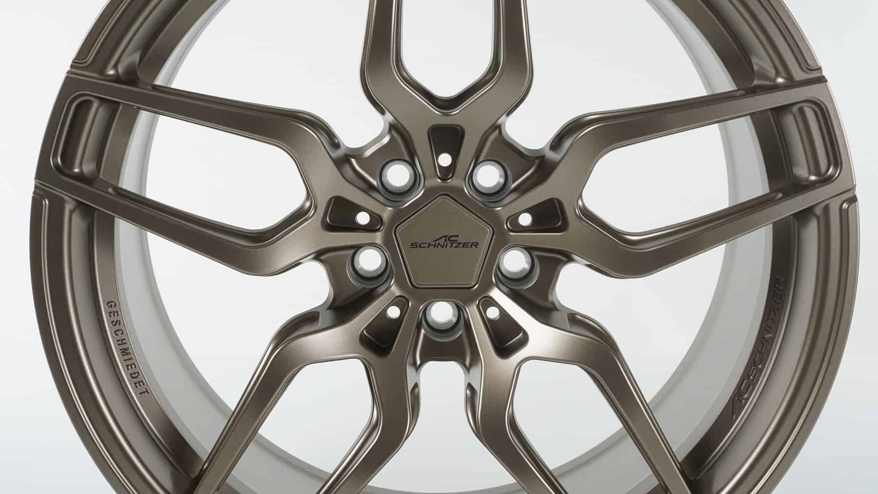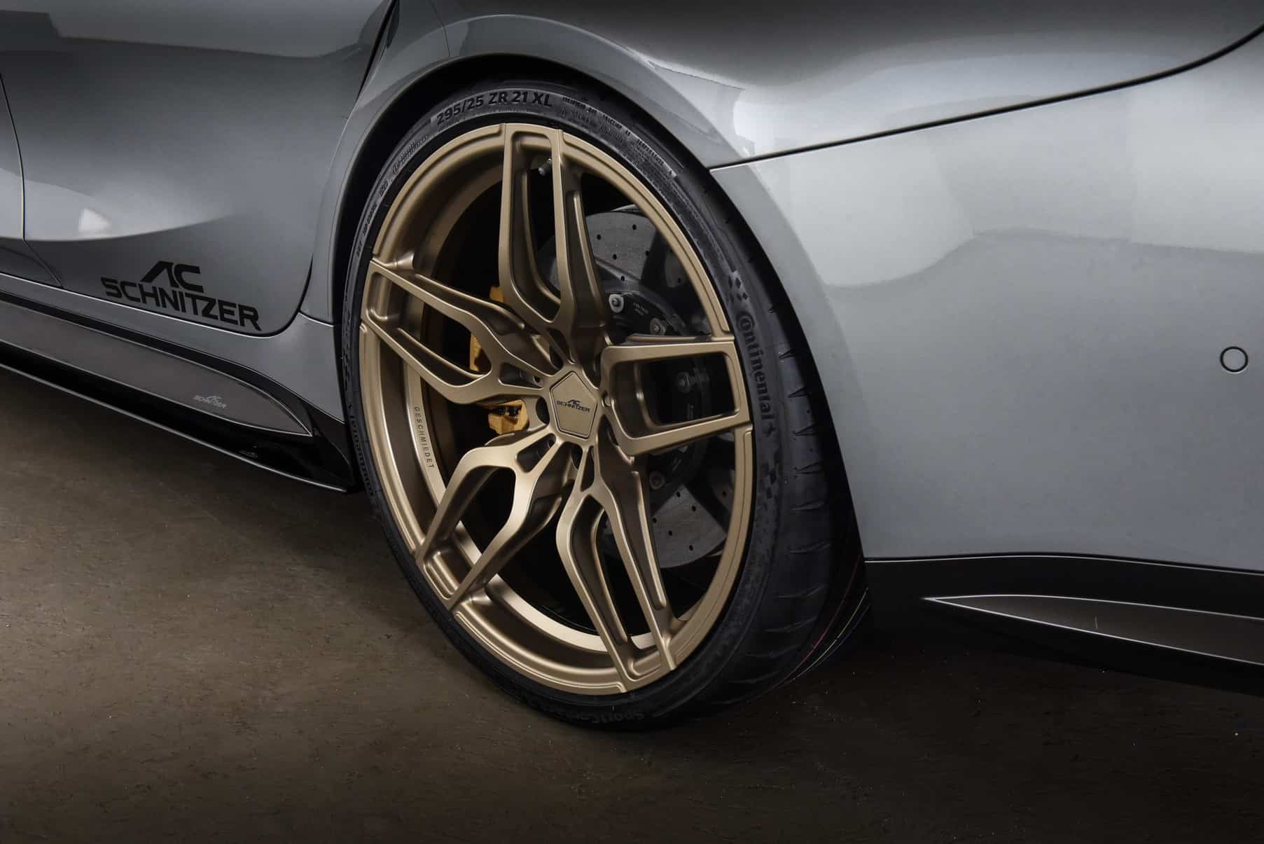 The one-piece wheel comes with a so-called Techgold eye-grabbing finish featuring a clear lacquer and a spoke design said to take after the rotor blades of a helicopter. AC Schnitzer fits a pentagonal hub cap as a nod to past wheels offered by the aftermarket specialist.