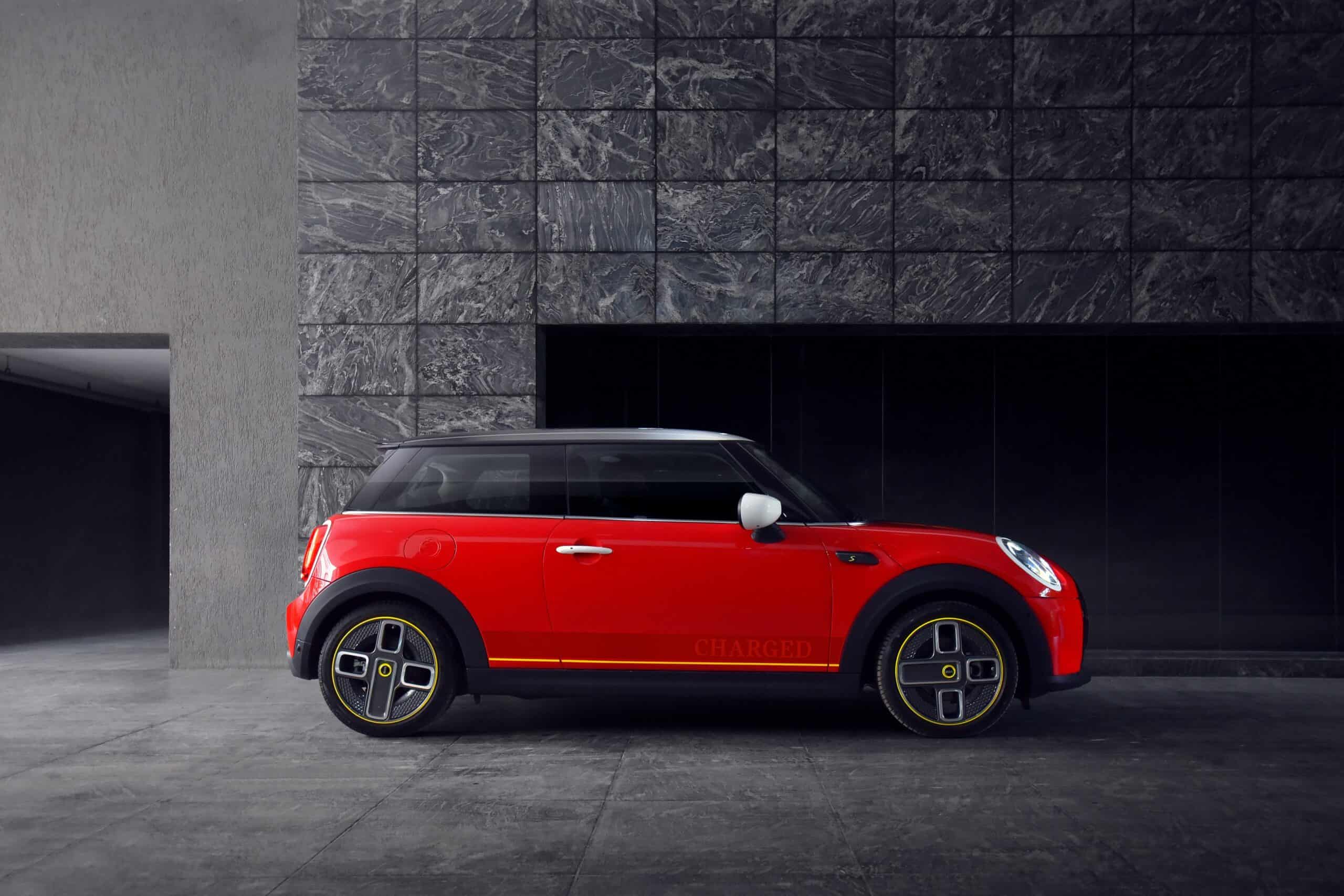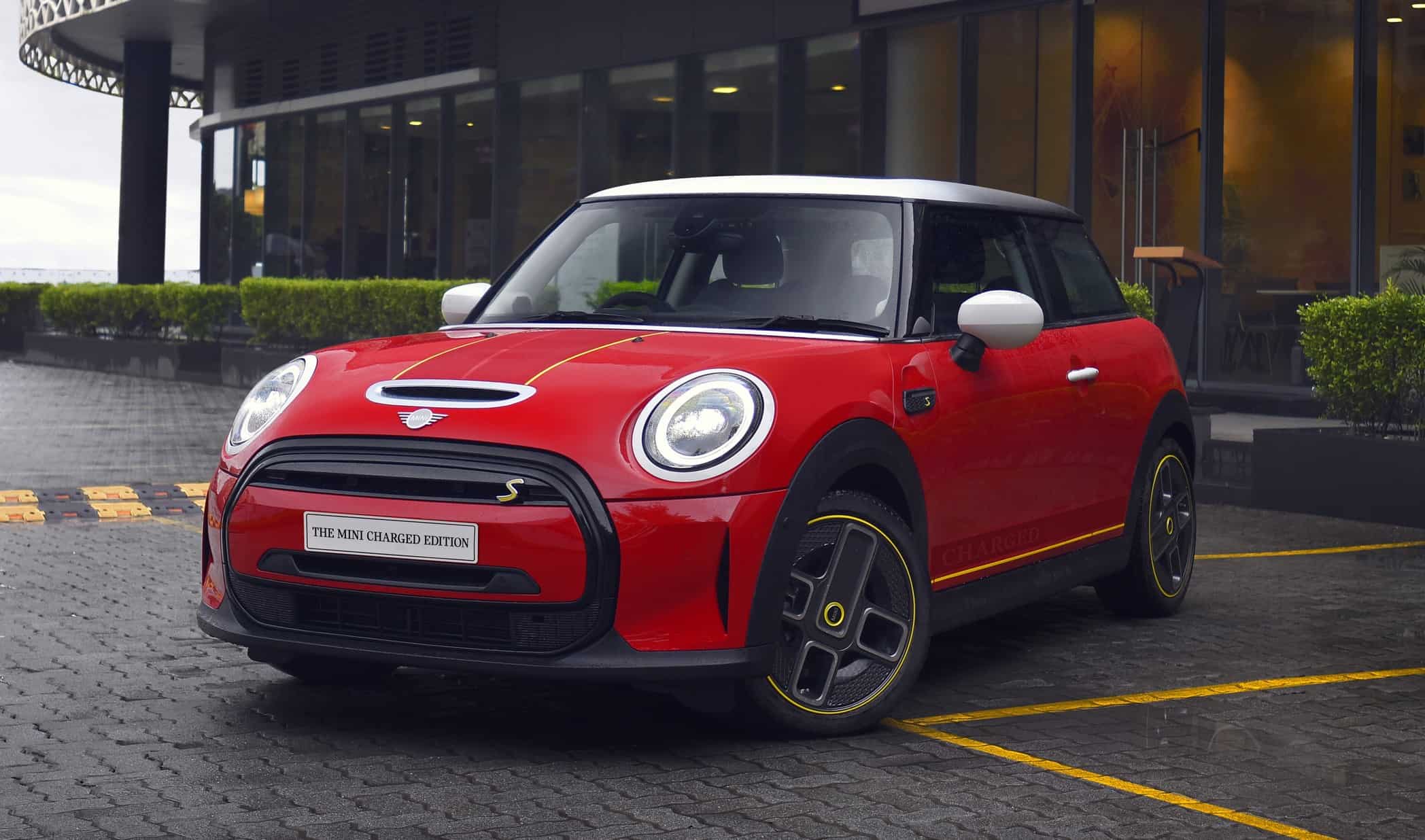 Painted in Chili Red, the zero-emission hatchback gets a white roof and matching side mirror caps. The Aspen White accents are also noticeable on the door handles, badges, and around the headlight and taillights. To further set it apart from the regular Cooper SE, MINI has added Frozen Red stripes running along the bottom of the profile. The yellow accents on the hood, sides, rear, and wheels are also hard to miss.
