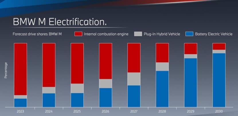 BMW M boss Frank van Meel stated earlier today that 2023 will be the most successful year in the 51 years history of the sportscar division. The M chief is projecting over 200,000 units sold in 2023. Of course, the sales number includes both full M cars (M2, M3, M4 etc.) and M-lite cars (M240, M340i, i4 M50 etc.). In comparison, the M brand sold 177,300 cars in 2022. Naturally, the combustion M cars are still making up a majority of the overall sales. But a sales projection chart shows that by 2027, the M division expects nearly a 50-50 distribution between combustion M cars, and plug-in hybrids and battery electric models. By 2030, the electric M cars will account for a majority of the overall sales.