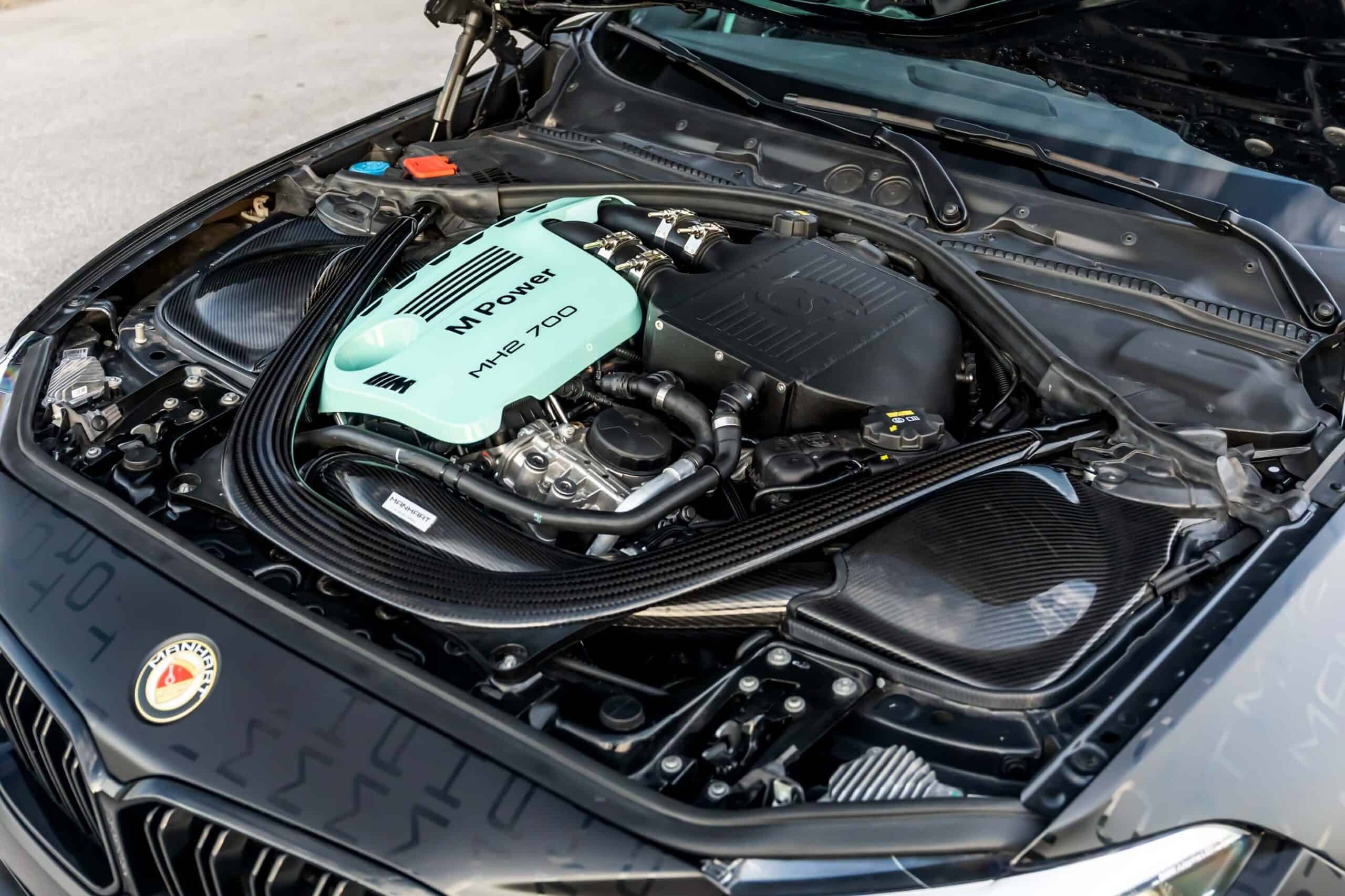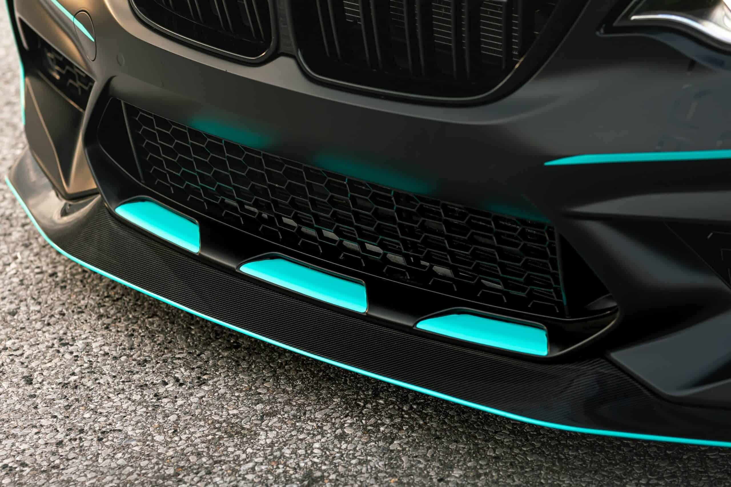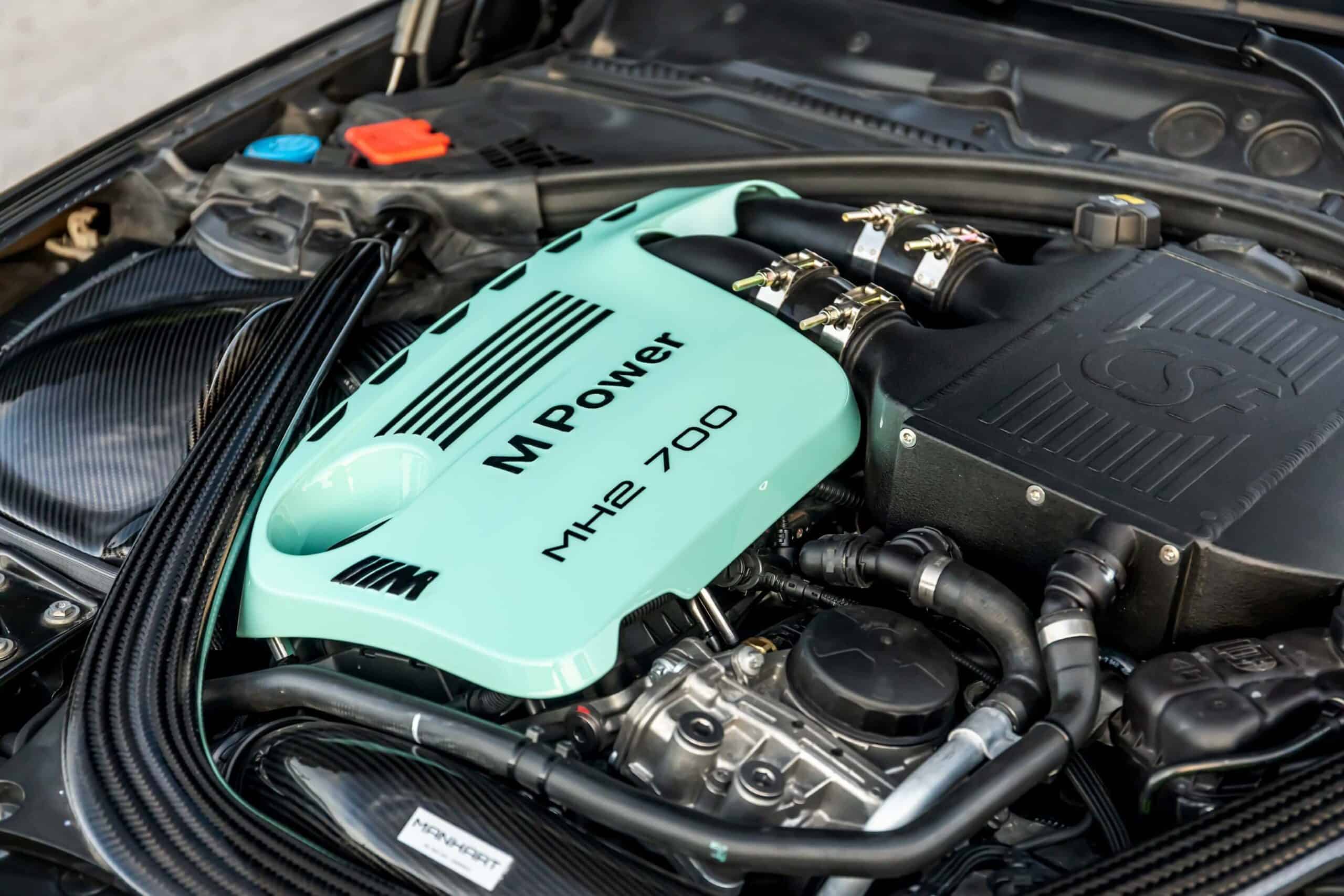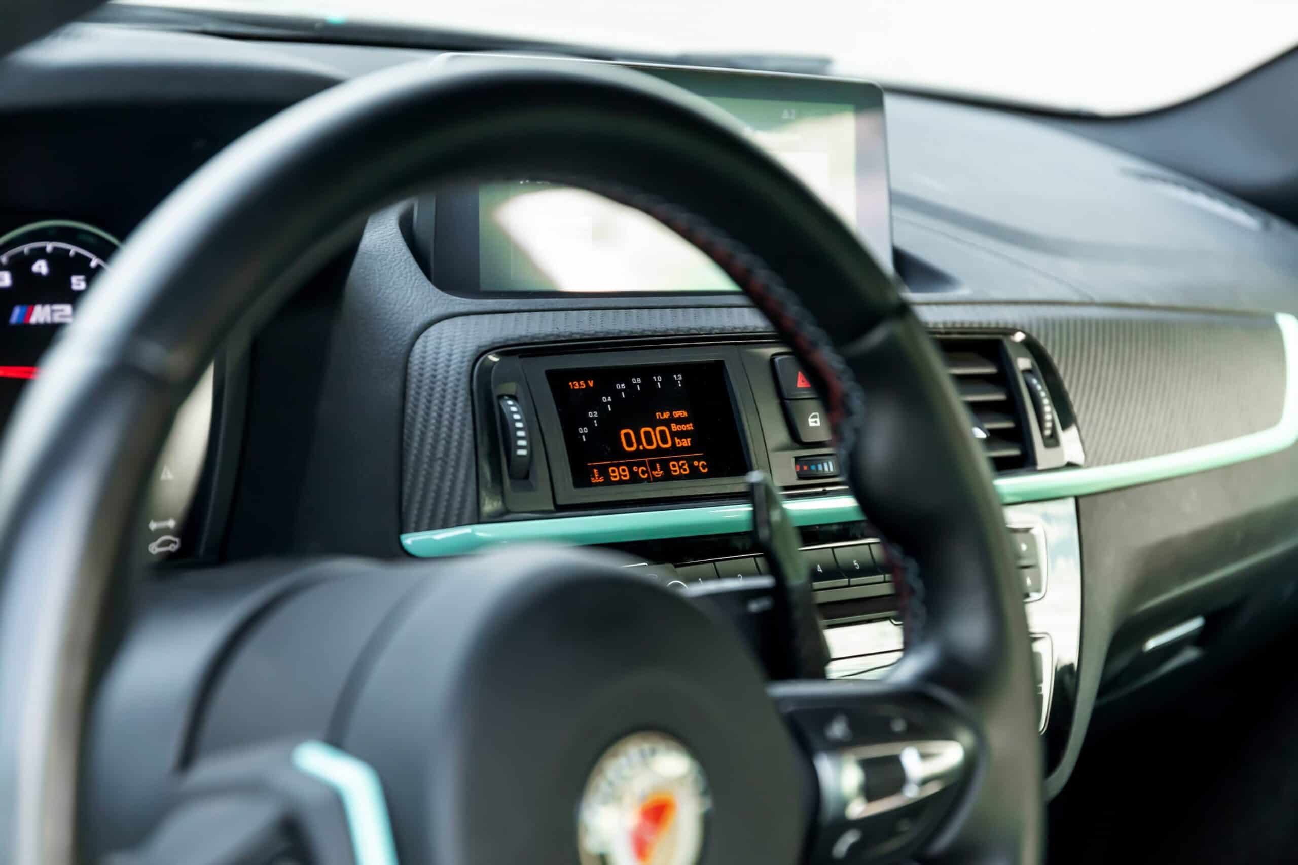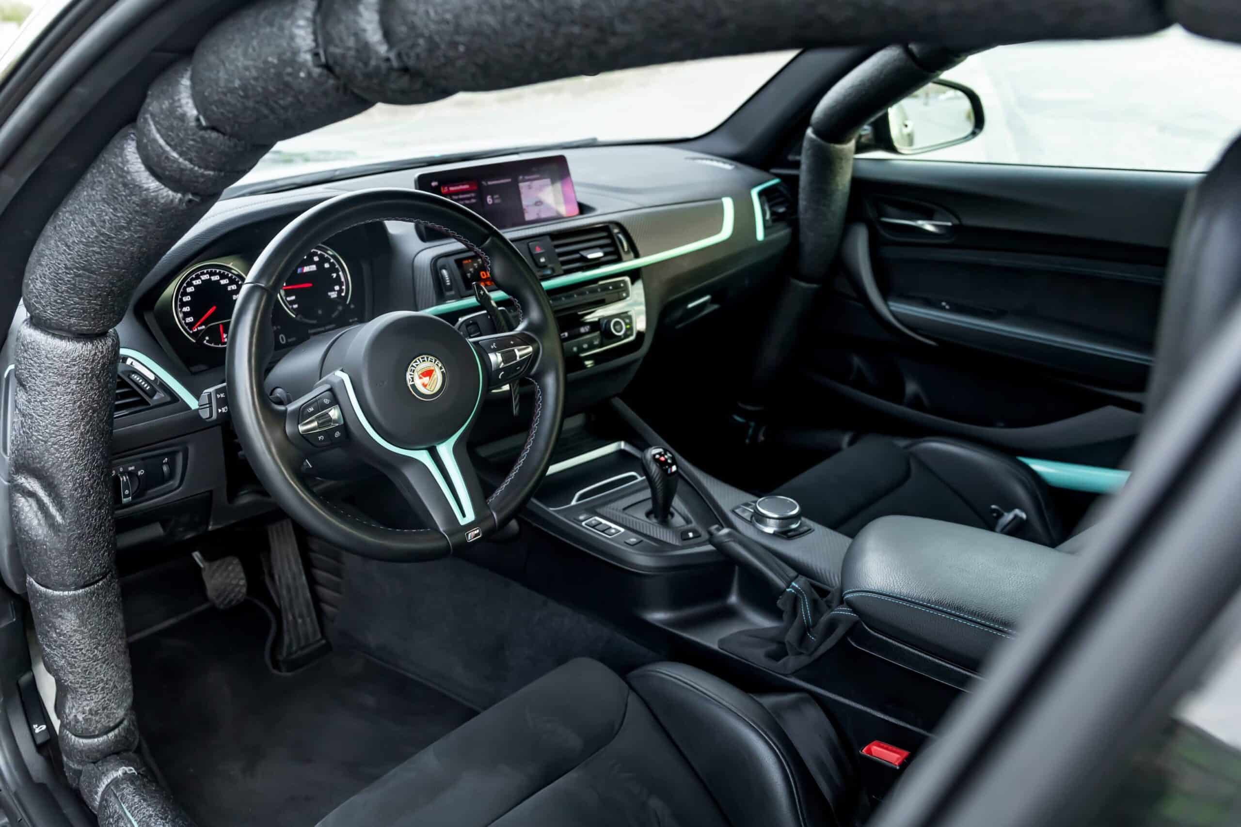 Yes, this previous-generation M2 is a hardcore two-seater that has had its twin-turbo 3.0-liter engine dialed to an absurd 715 horsepower. The inline-six S55 delivers a mountain-moving 815 Newton-meters (601 pound-feet) of torque following several hardware changes. The aftermarket specialist installed upgraded turbos, a custom intercooler, a carbon intake, and aluminum charge pipes. In addition, there’s now a stainless-steel exhaust with valve control and quad 100-mm tips with a matte black finish.
