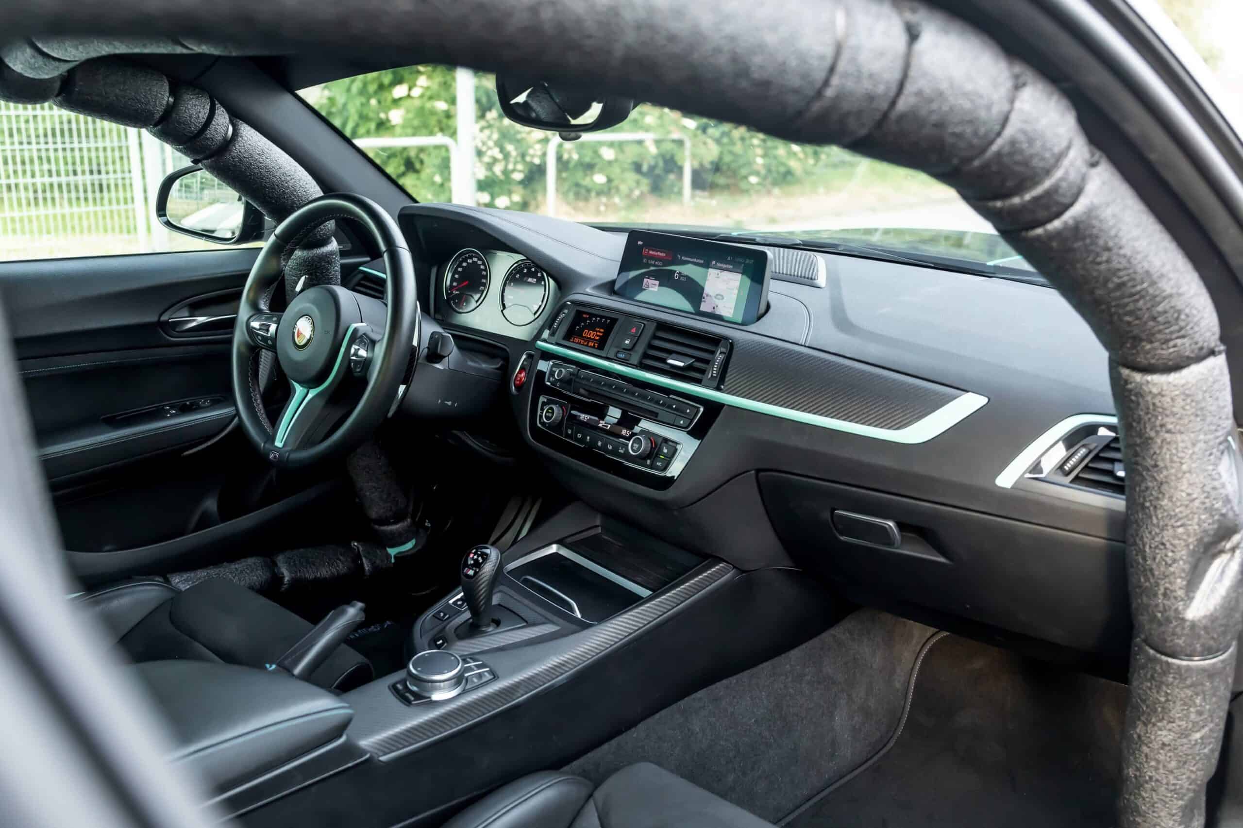Stepping inside, the BMW M2 Competition modified by Manhart boasts Recaro Sportster CS bucket seats with a roll cage finished in mint green to complement the exterior details. An Awron auxiliary display has replaced the central air vent on the driver’s side while a rear inscription where the bench used to be denotes it’s a one-of-one project.