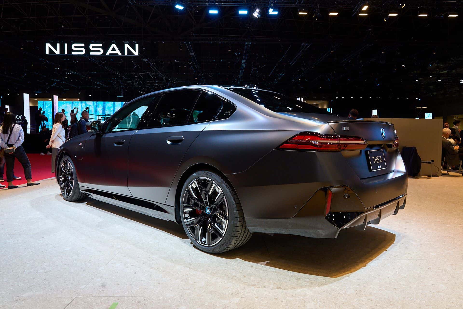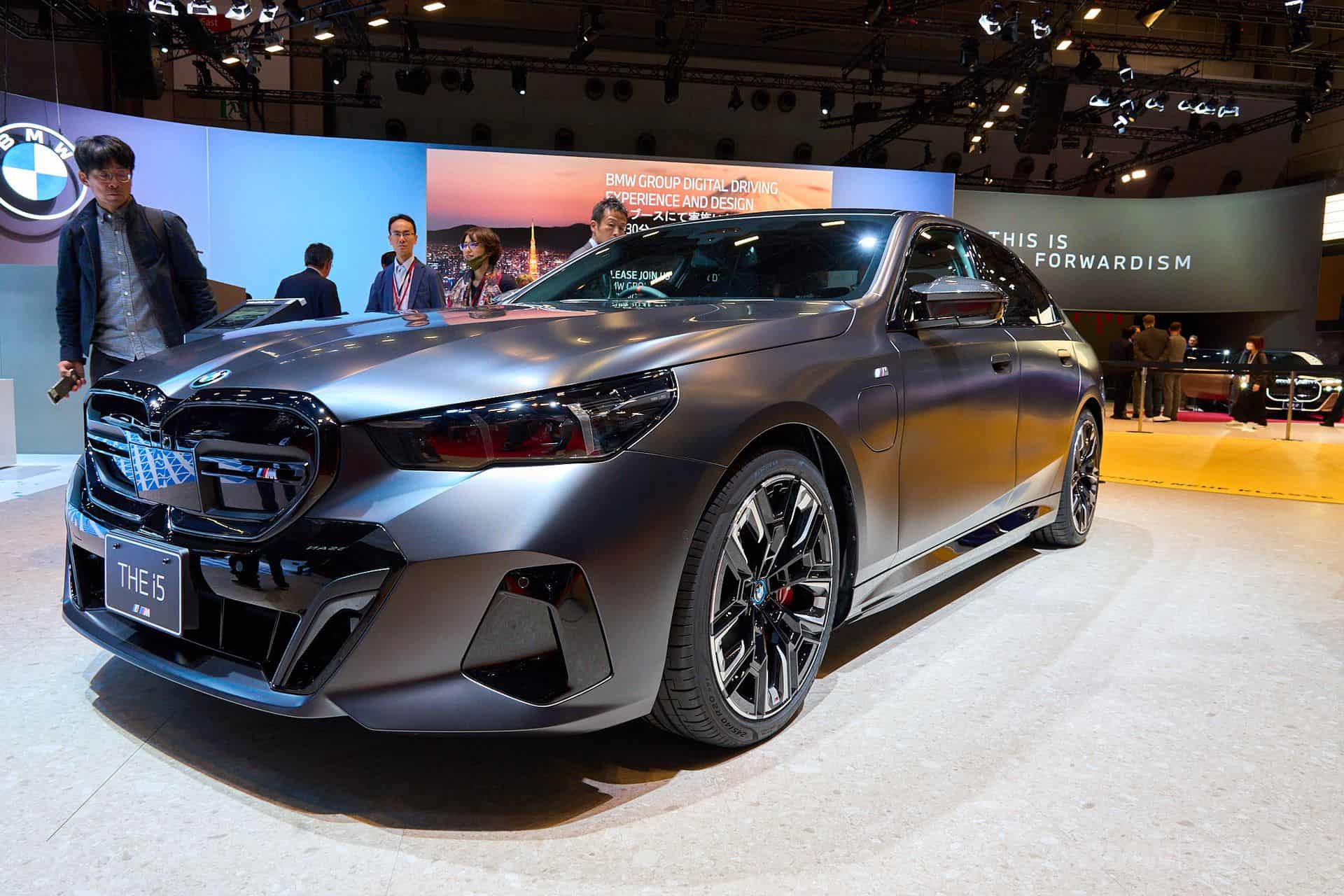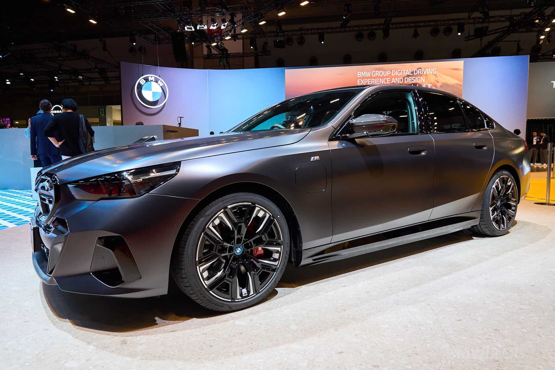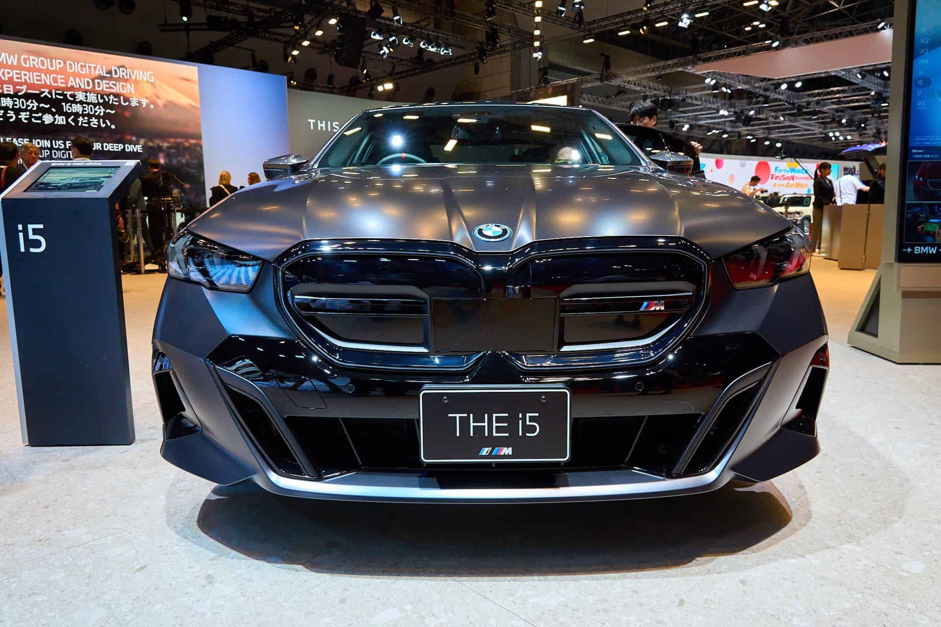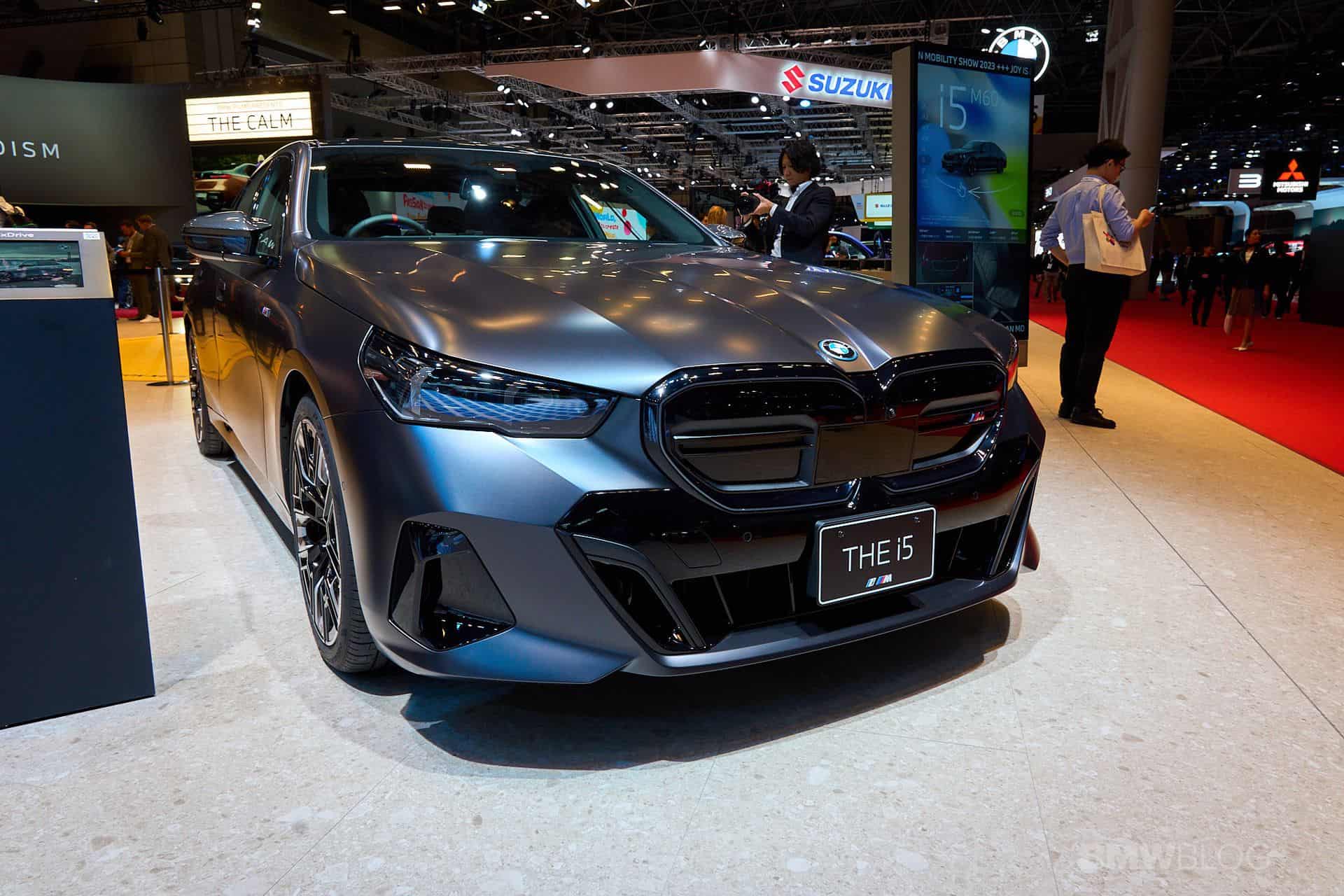 With the i5 M60, BMW wants you to forget all about the gasoline-fueled M550i and its brawny twin-turbo 4.4-liter V8 engine and opt instead for the purely electric M Performance version. The new 5 Series has arrived at the 2023 Japan Mobility Show with matte paint, dual motors, and plenty of carbon fiber goodies. It’s dressed to impress in Pure Frozen Grey from the Individual catalog and has the optional Shadowline headlights with darkened lenses for a meaner look.