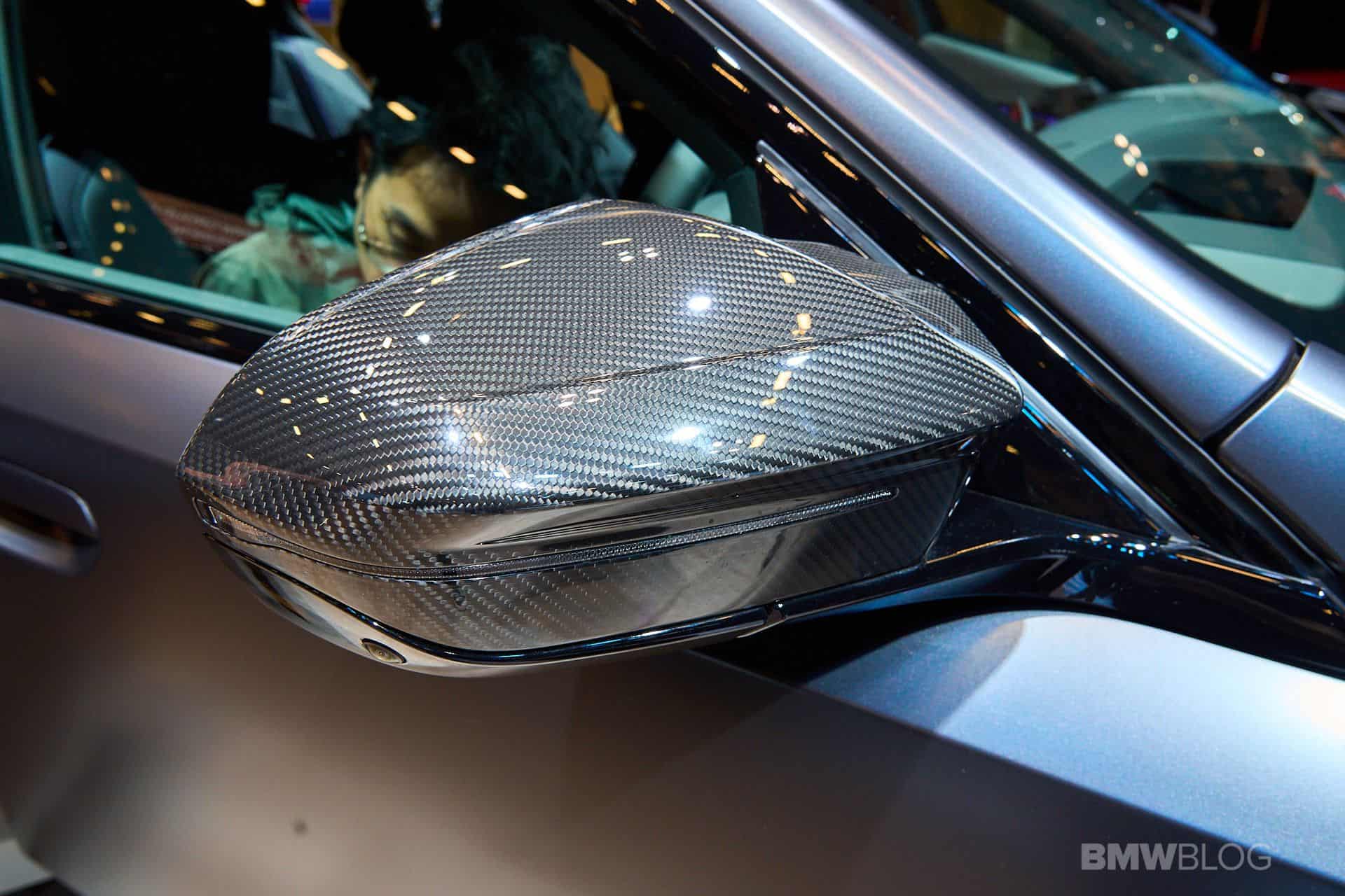 Shown here in right-hand drive, the BMW i5 M60 partially foreshadows the full-fat M5 coming next year since that aggressive kidney grille with horizontal slats is coming to the flagship version. It might not be identical, but it won’t be all that different either. The carbon fiber side mirror caps with their M-specific shape also bring the electric M Performance model closer to the actual M5, as does the trunk lid spoiler made from the same lightweight material.