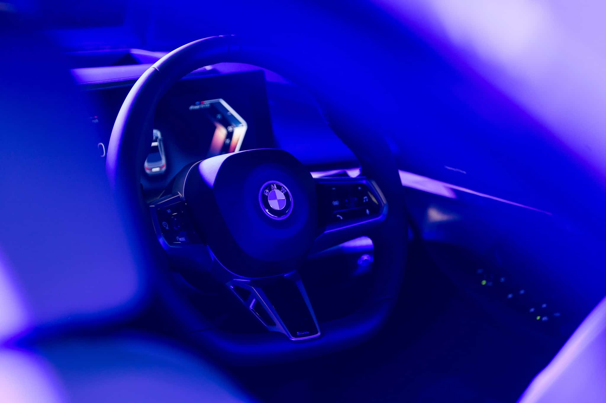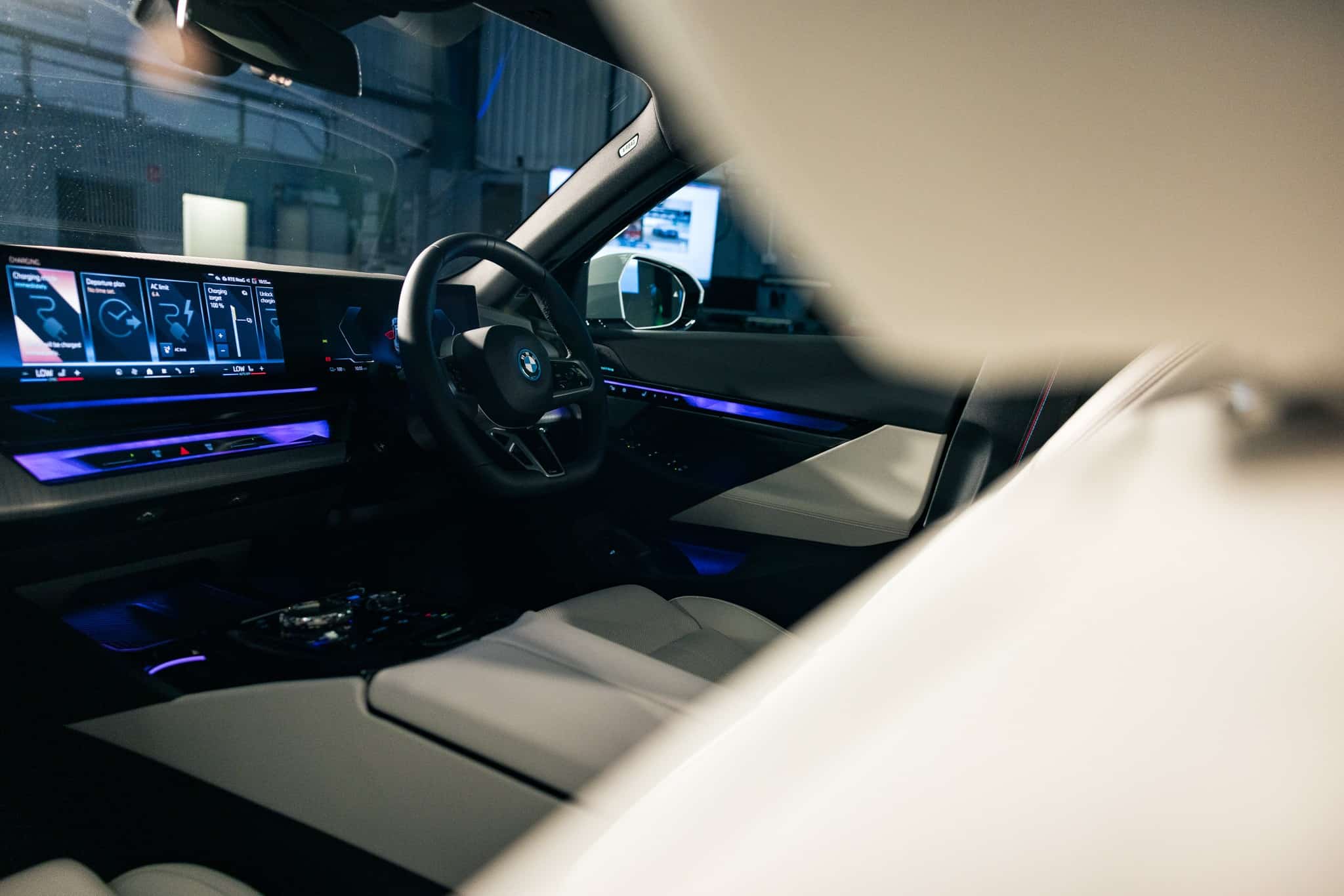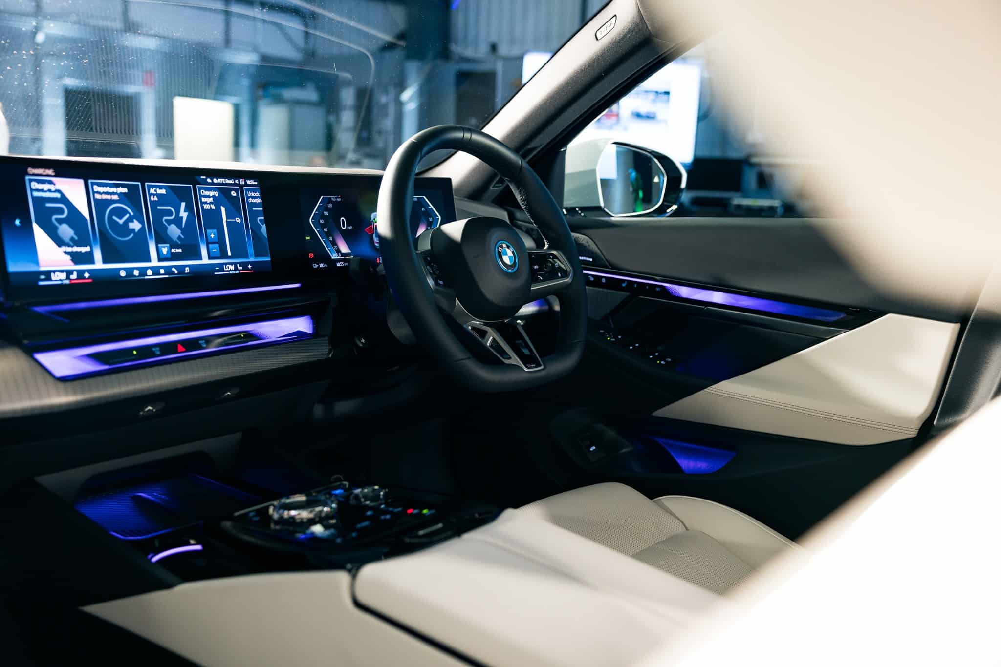 As for the interior, BMW Ireland opted to showcase the 2024 i5 eDrive40 with vegan leather in a Smoke White color. The new 5 Series is the company’s first production model to offer a fully vegan interior, which is also coming to some of the new MINI models. This right-hand-drive car has a flat-bottomed steering wheel and Aluminium Rhombicle trim adorning the dashboard.