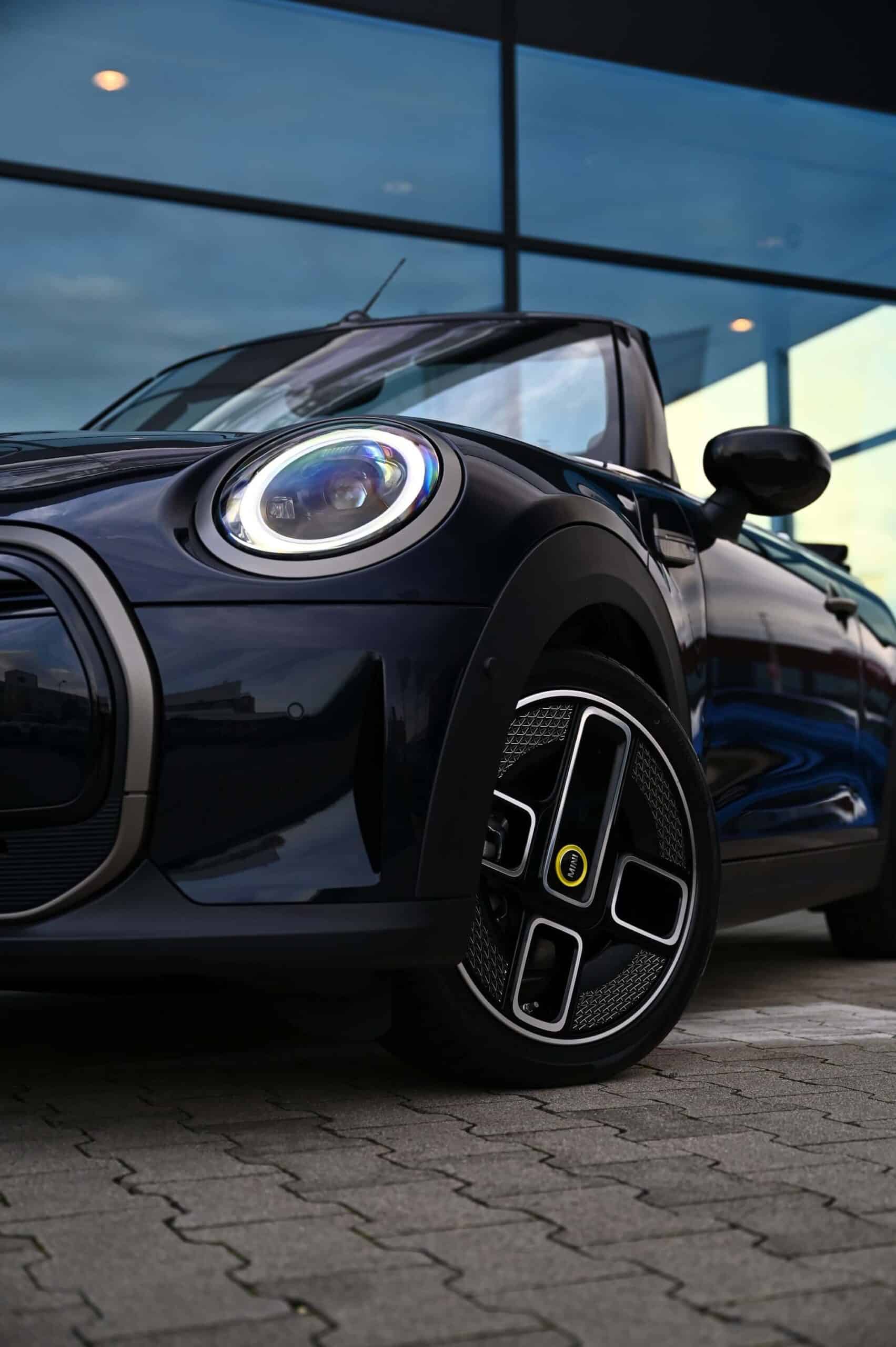 These MINIs with unlimited headroom have an electrically retractable roof (with the Union Jack motif) that works at speeds of up to 19 mph (30 km/h) and sit on 17-inch wheels made from secondary aluminum. Regardless of body colors, the Cooper SE Convertible boasts Resolute Bronze accents along with a Piano Black look for the badge and model lettering.