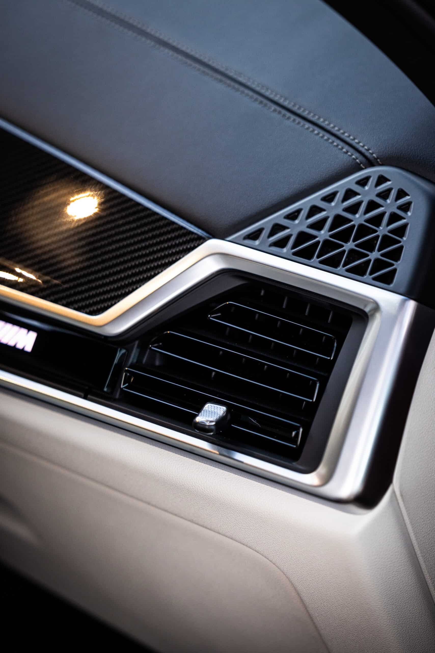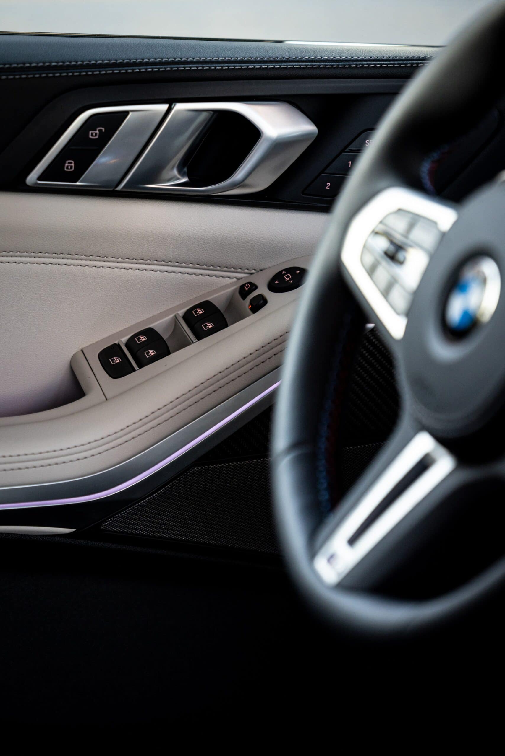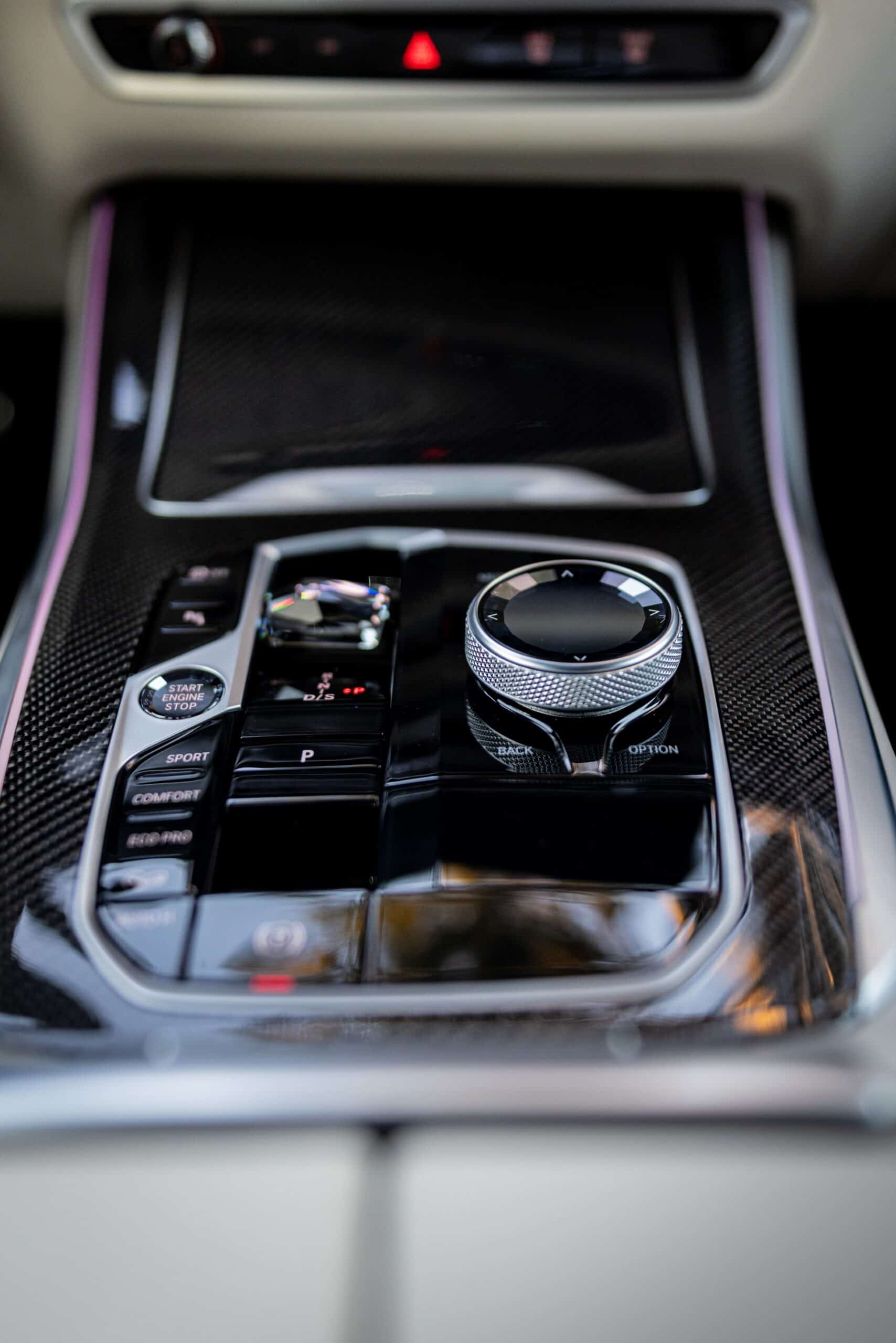 Whoever configured the X5 M60i didn’t splurge just on the exterior as they also added a few extra bits inside. At $1,950, the extended Merino leather in Ivory White gives the cabin a sophisticated look, enhanced by the glass controls part of the $1,650 Executive Package that also has support for gesture controls. Now featuring an illuminated M graphic on the passenger side as standard on the M Performance model, the dashboard is adorned by a $300 carbon fiber trim.