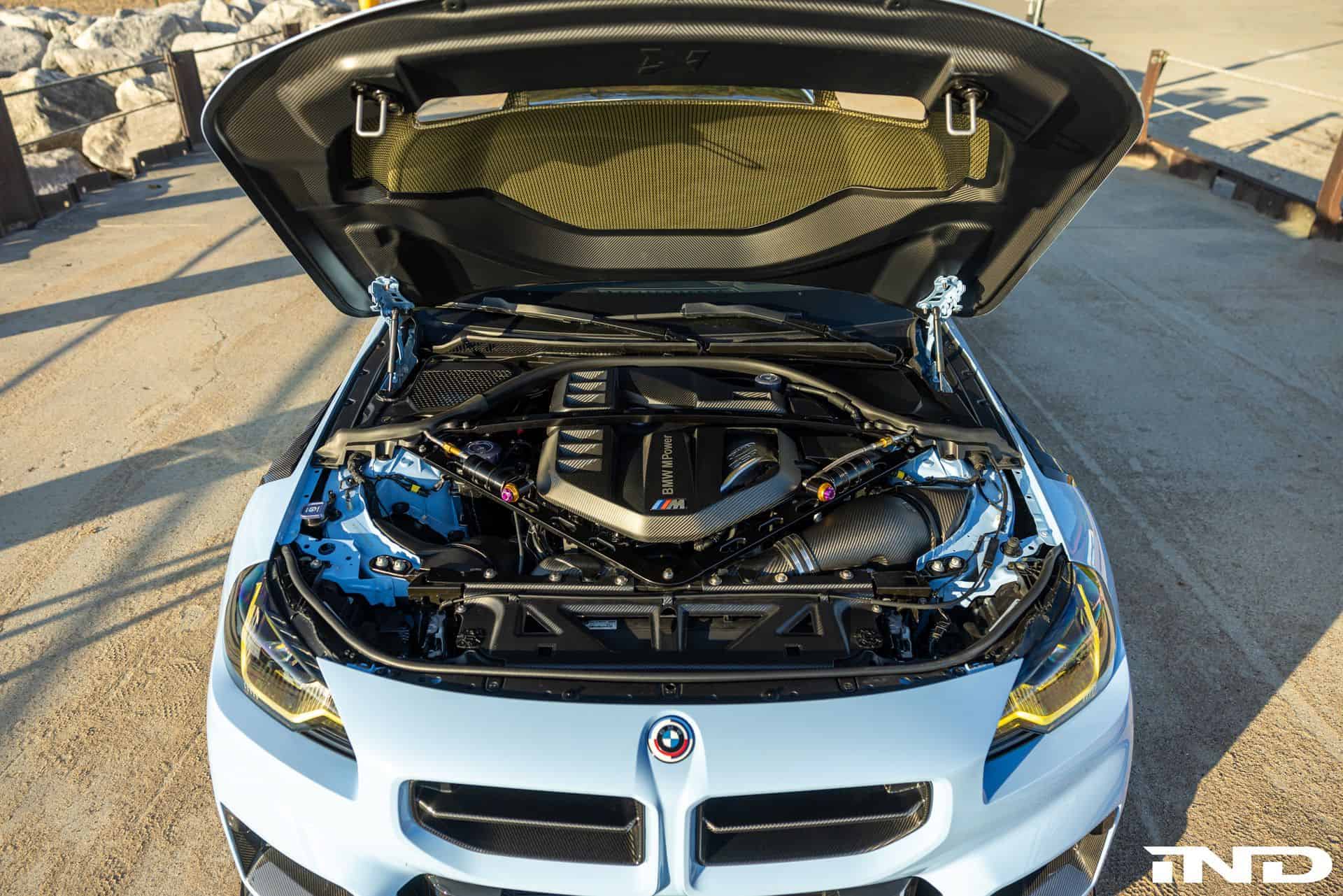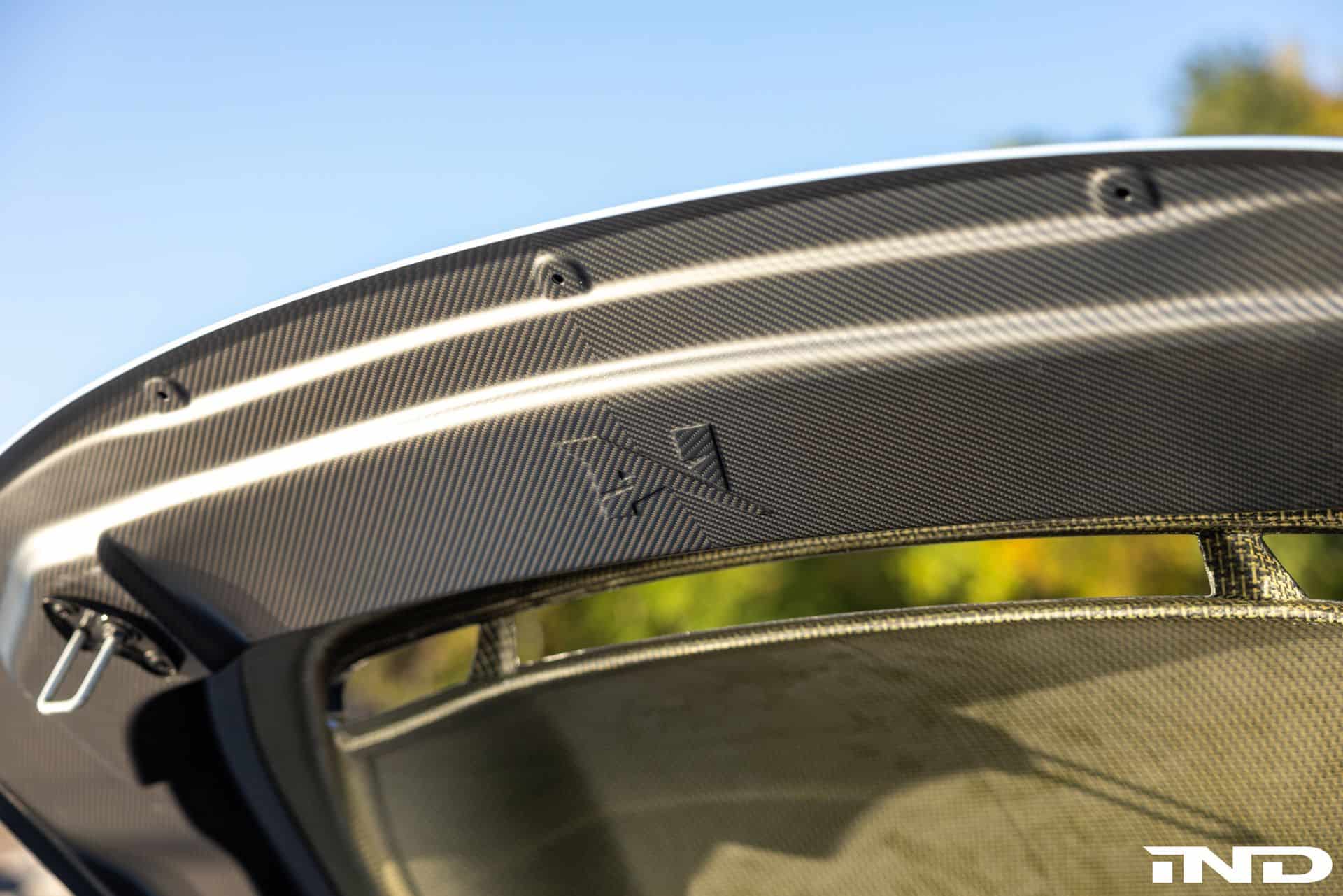 The exterior of the G87 M2 is already aggressive, but IND and Alpha-N have taken things to the next level with their carbon fiber parts. The front splitter, side skirts, and rear diffuser are all made from high-quality carbon fiber, and they give the car a more race-inspired look. The carbon fiber hood and trunk lid are also impressive, and they help to reduce weight and improve performance. The carbon grille also adds a touch of sportiness to the front end, complementing the other carbon parts. Moving to the rear of the car, Alpha-N offers a carbon rear diffuser that integrates seamlessly with the an Eisenmann Black Series Performance exhaust system. The diffuser features an aggressive design that help channel the air flow under the car and create a low-pressure zone that reduces lift.