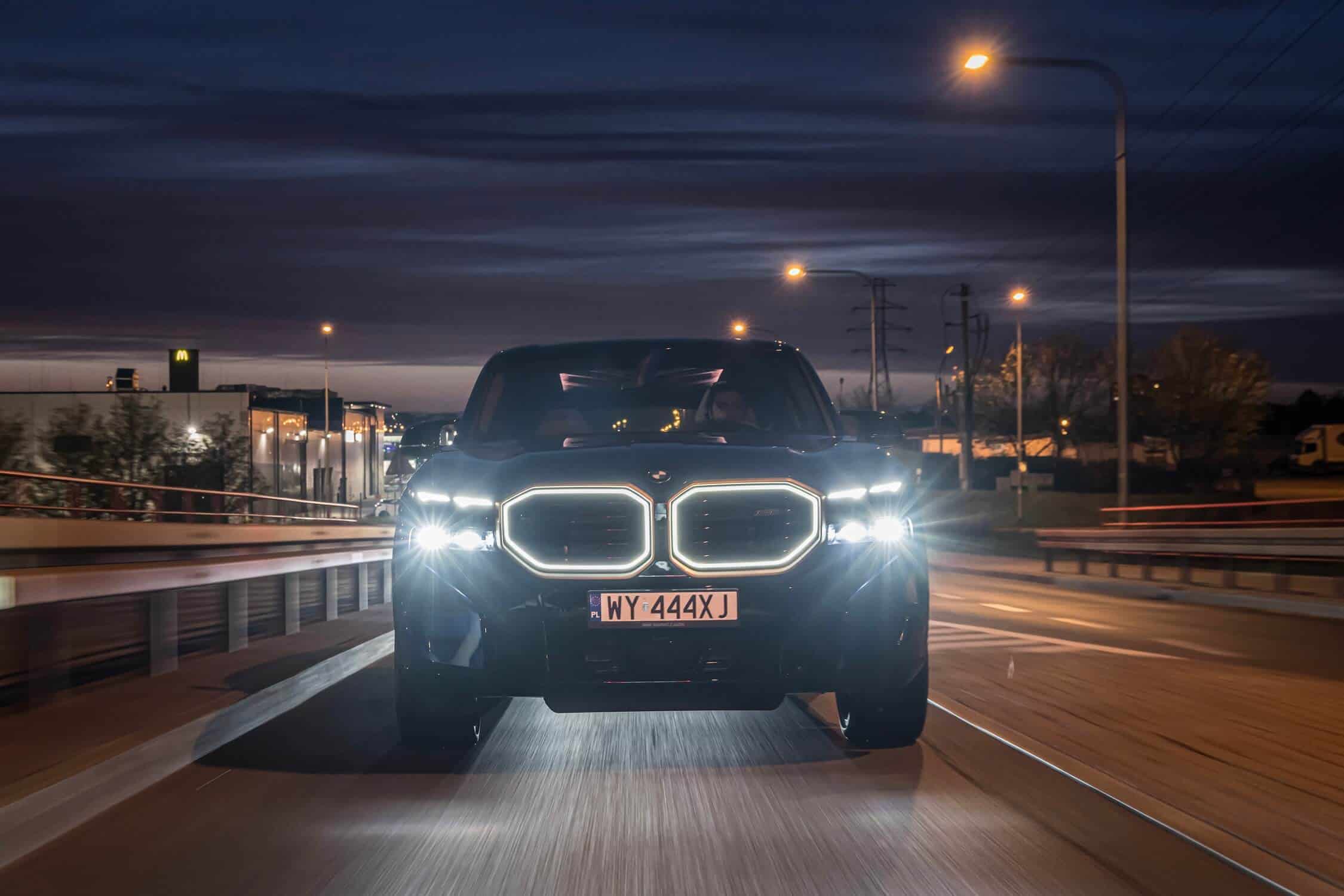 2024 BMW XM from the front, headlights and front grille illuminated