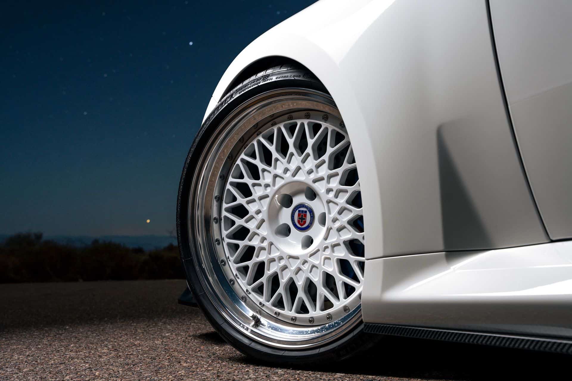 These wheels come in sizes varying from 18 to 24 inches in a design reminiscent of the 1980s. We’re immediately reminded of the M3 E30’s iconic BBS wheels. For this M2, the white shoes with a polished outer lip are complemented by a KW suspension bringing the sports car closer to the road for a meaner attitude.