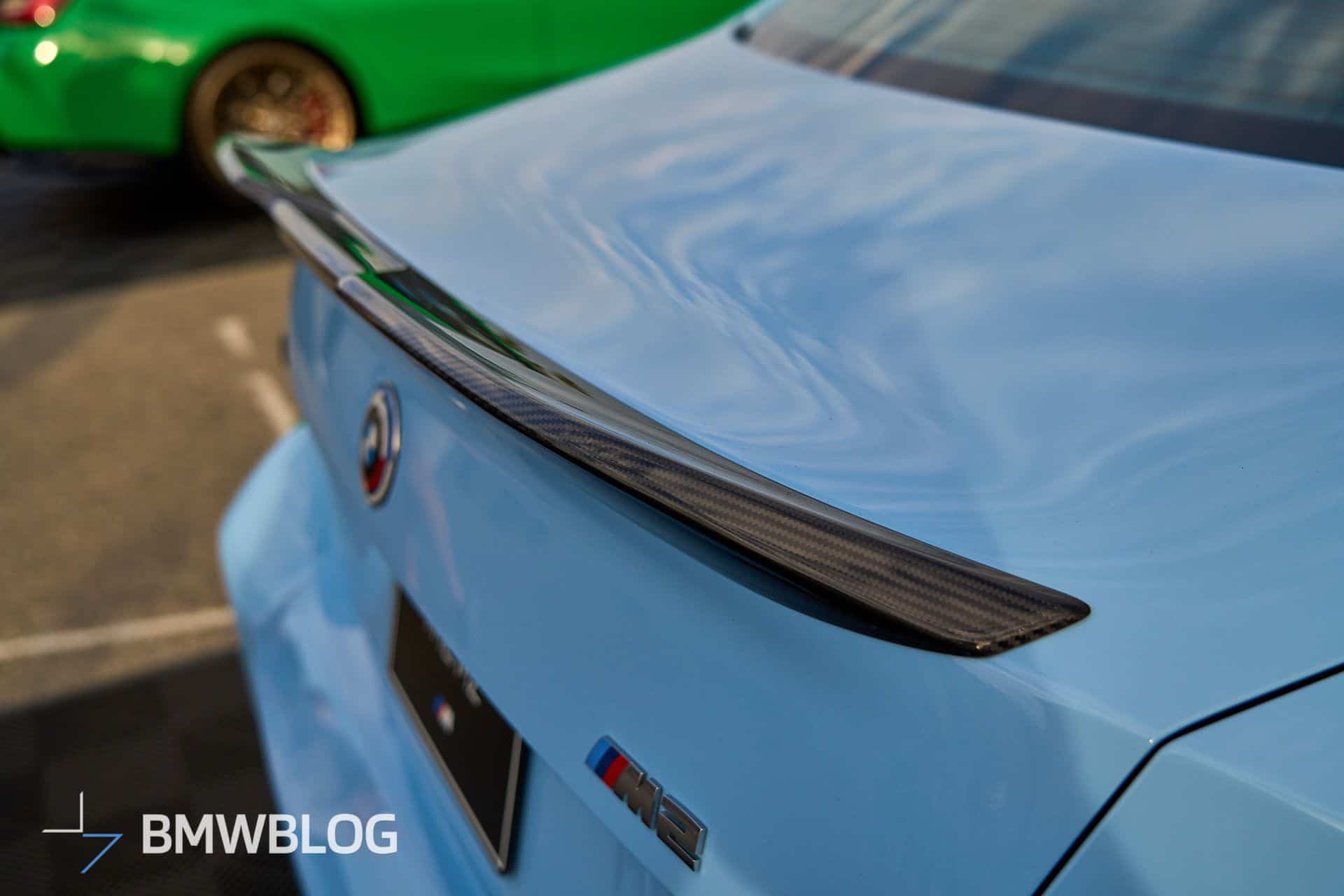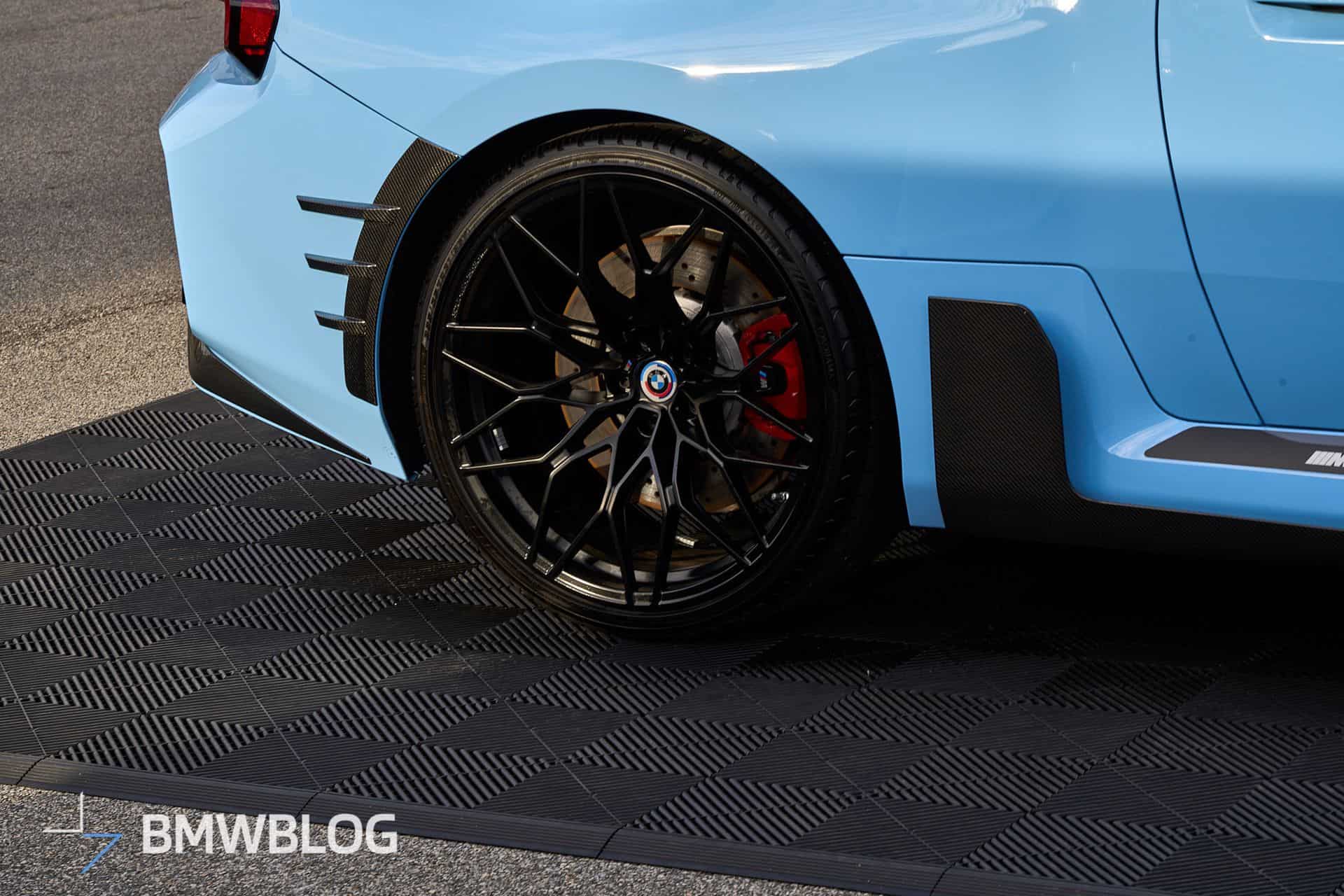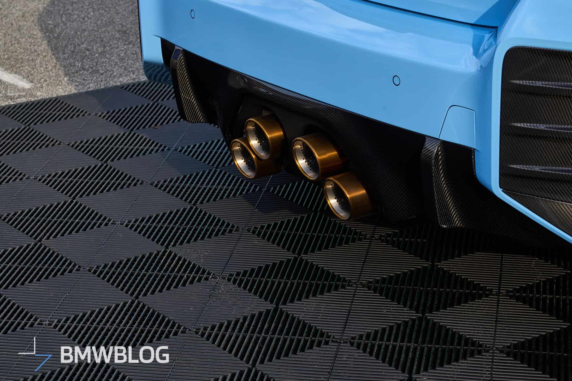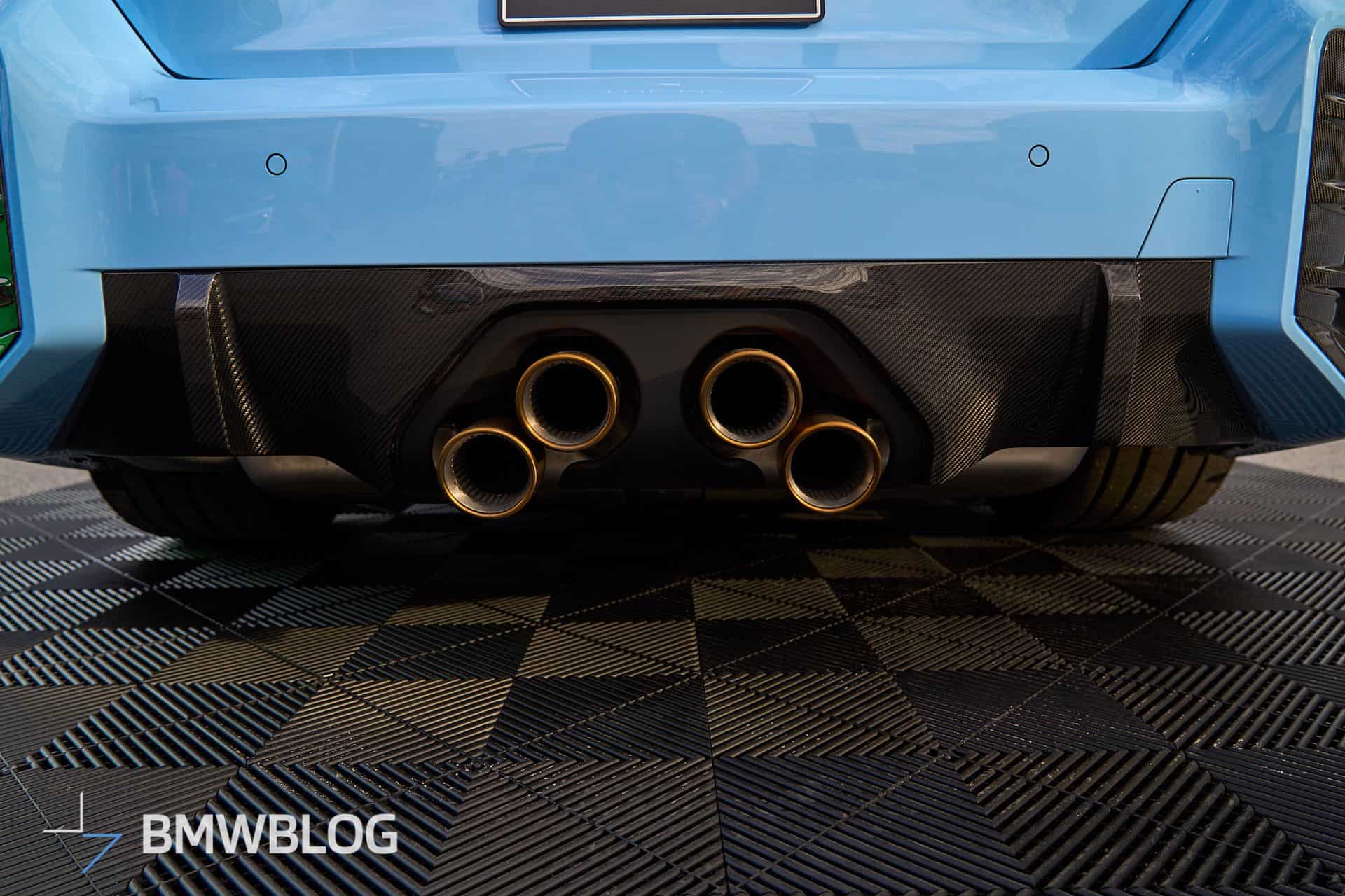 Beyond the attention-grabbing exhaust, BMW is exhibiting the M2 with an array of carbon fiber body add-ons. We’re not big fans of those side spats for the G87, and the M Performance decal on the side skirts makes us think of a tuner’s car. For those keen on extra personalization, additional options are available, including a roof-mounted spoiler and a set of centerlock wheels offered for the M3 and M4 as well.