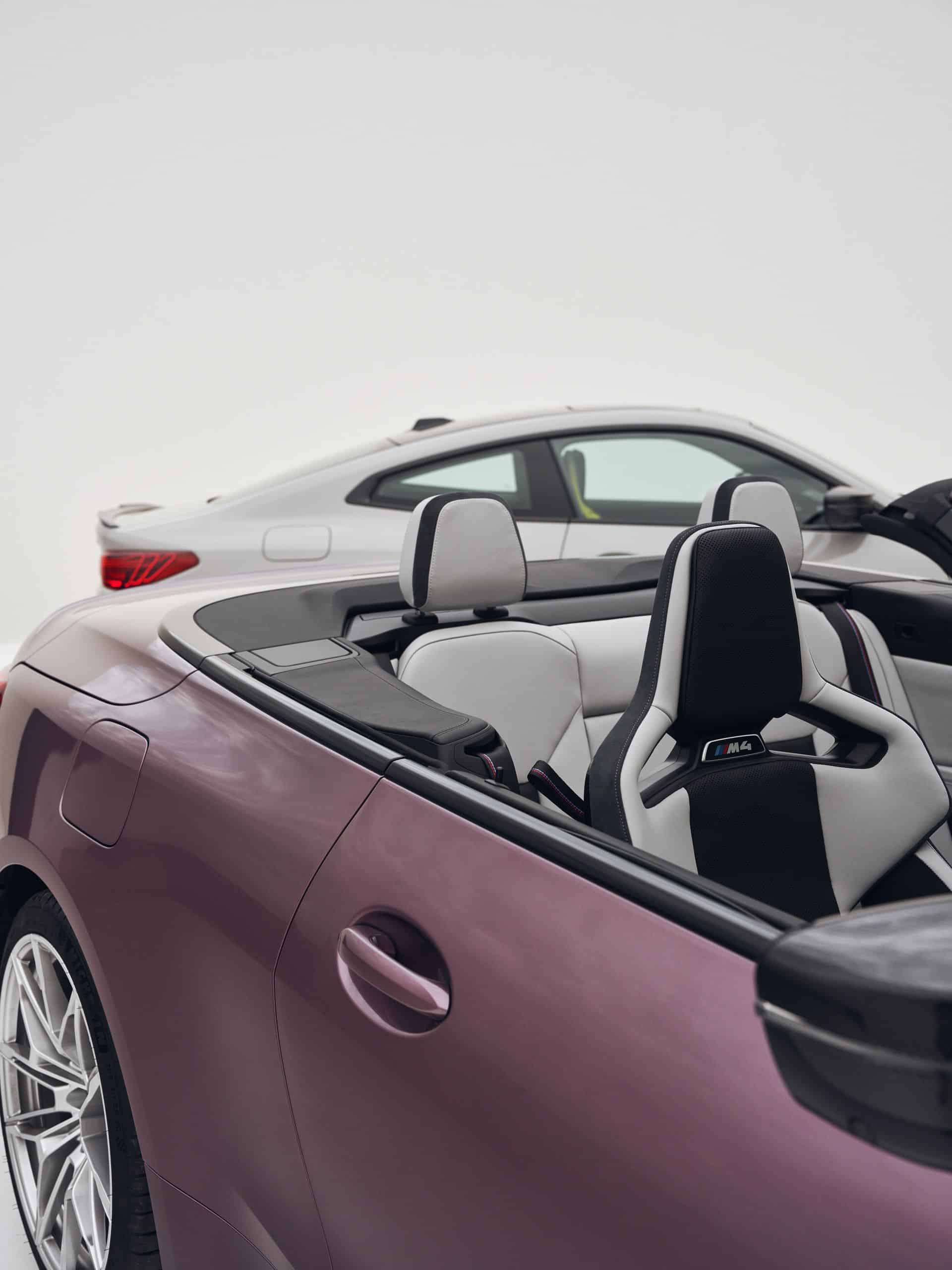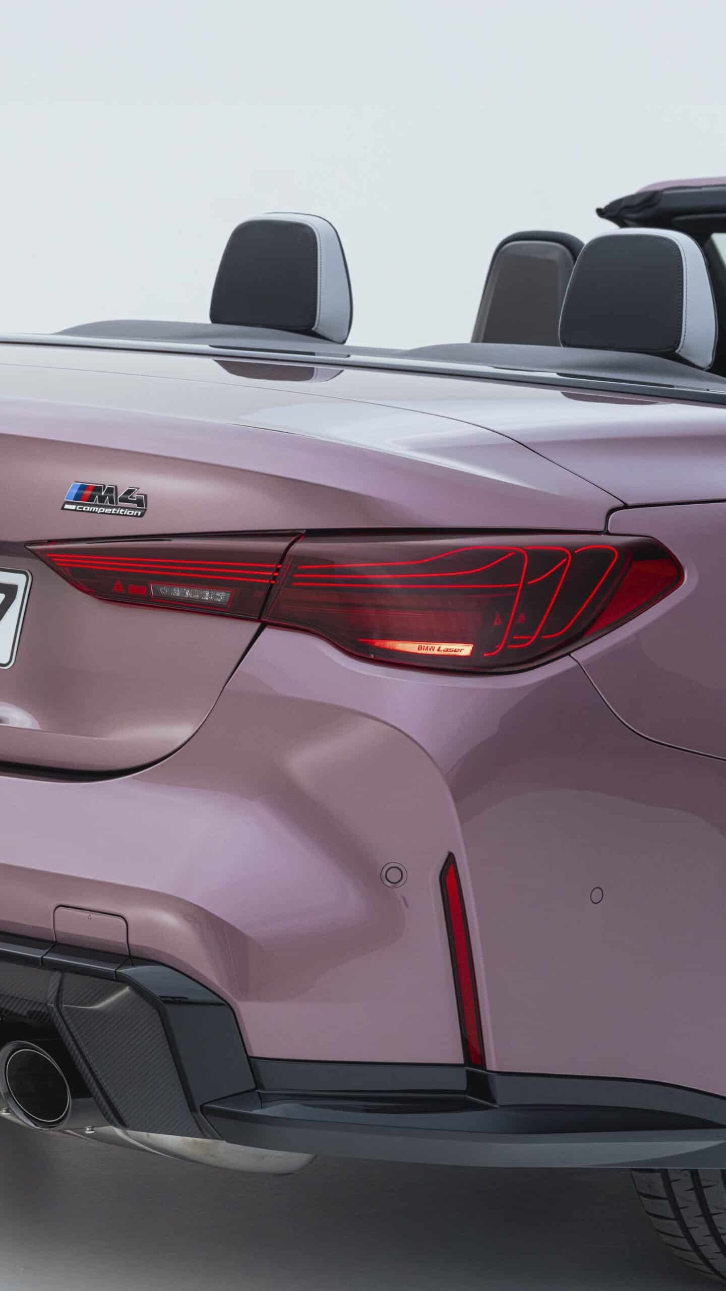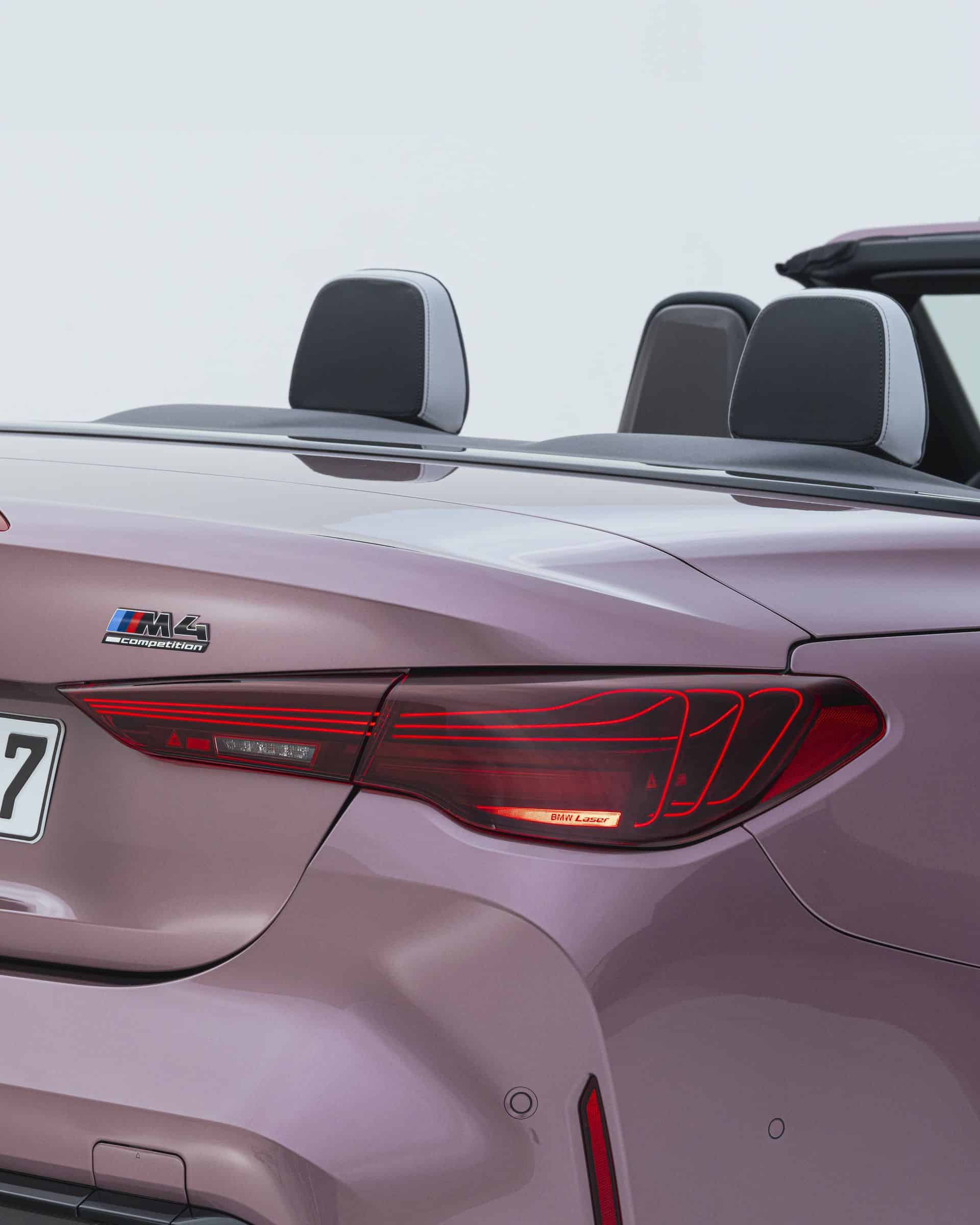 With the Life Cycle Impulse introduced nearly three years after the G84’s debut, the M4 Convertible switches to new LED headlights that do away with laser technology. While you lose the laser setup at the front, you do gain it at the back where the taillights are derived from those used by the M4 CSL. The swanky rear lights are standard and incorporate laser diodes that illuminate glass fiber bundles to create 3D-like graphics for extra visual drama. This Velvet Orchid also goes really well with the laser taillights.