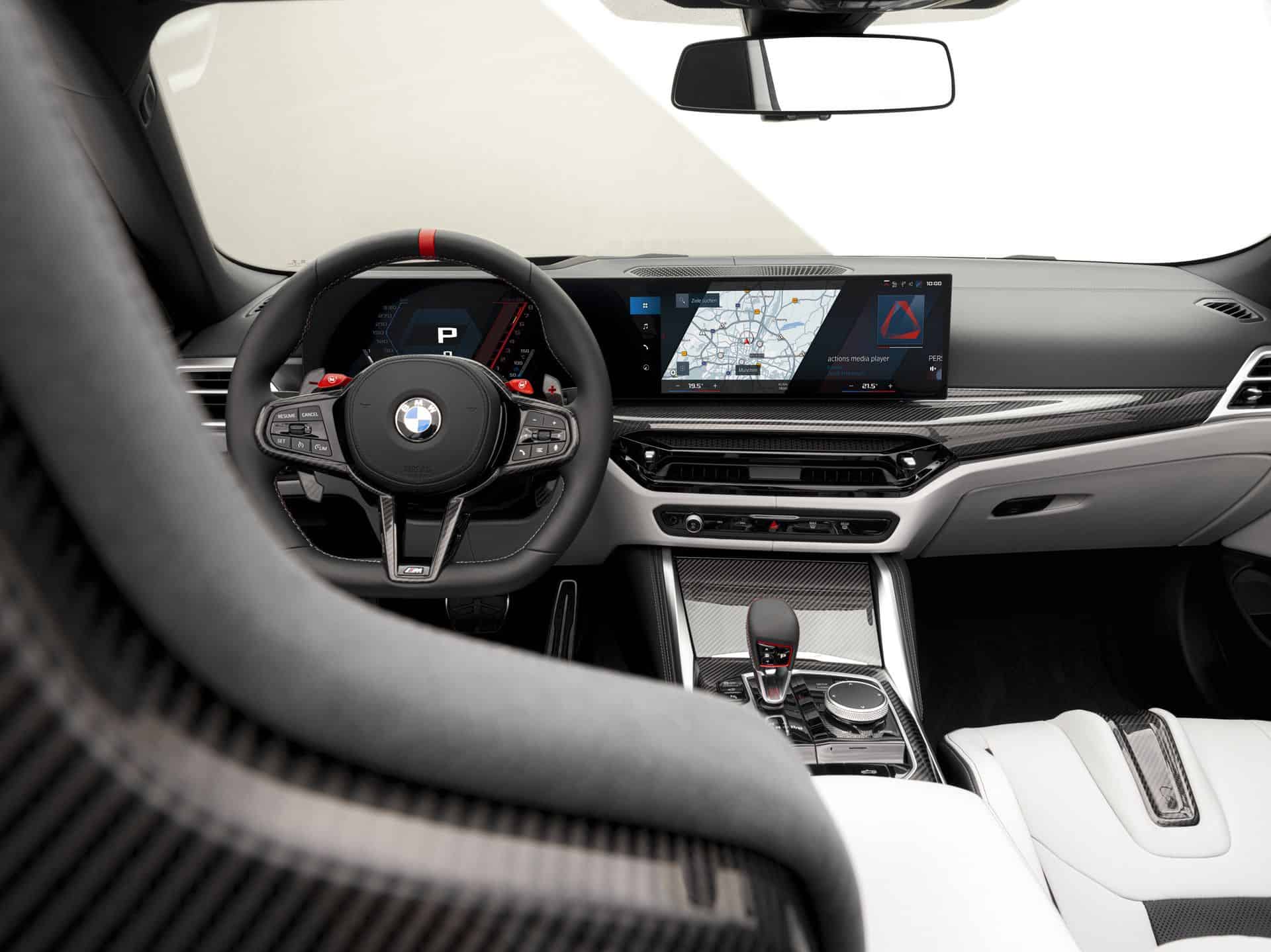 Inside, the 2025 BMW M4 models continue to emphasize a premium and sporty ambiance. Additionally, the BMW M4 LCI gets an Alcantara-wrapped steering wheel with a flat bottom. When it comes to the infotainment system, the large curved display is still present, but now powered by iDrive 8.5. The interior trims around the dashboard, the control panel, and the cupholder cover now come as standard in a Dark Graphite matte finish.