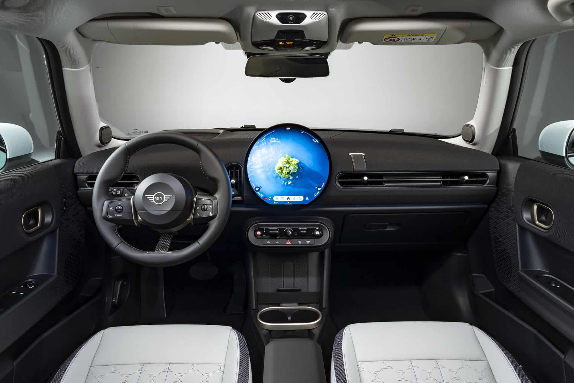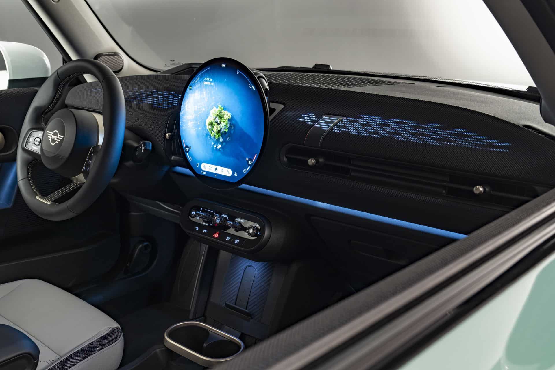 The new gas-powered MINI’s interior may seem identical to the electric model, but there are subtle differences. The dashboard appears to be almost identical, dominated by the new 9.4-inch circular OLED infotainment display that runs the new MINI Operating System 9 (a ground-up new system not related to any previous MINI or BMW operating system). The panel of buttons under the screen and the steering wheel also appear to be identical.