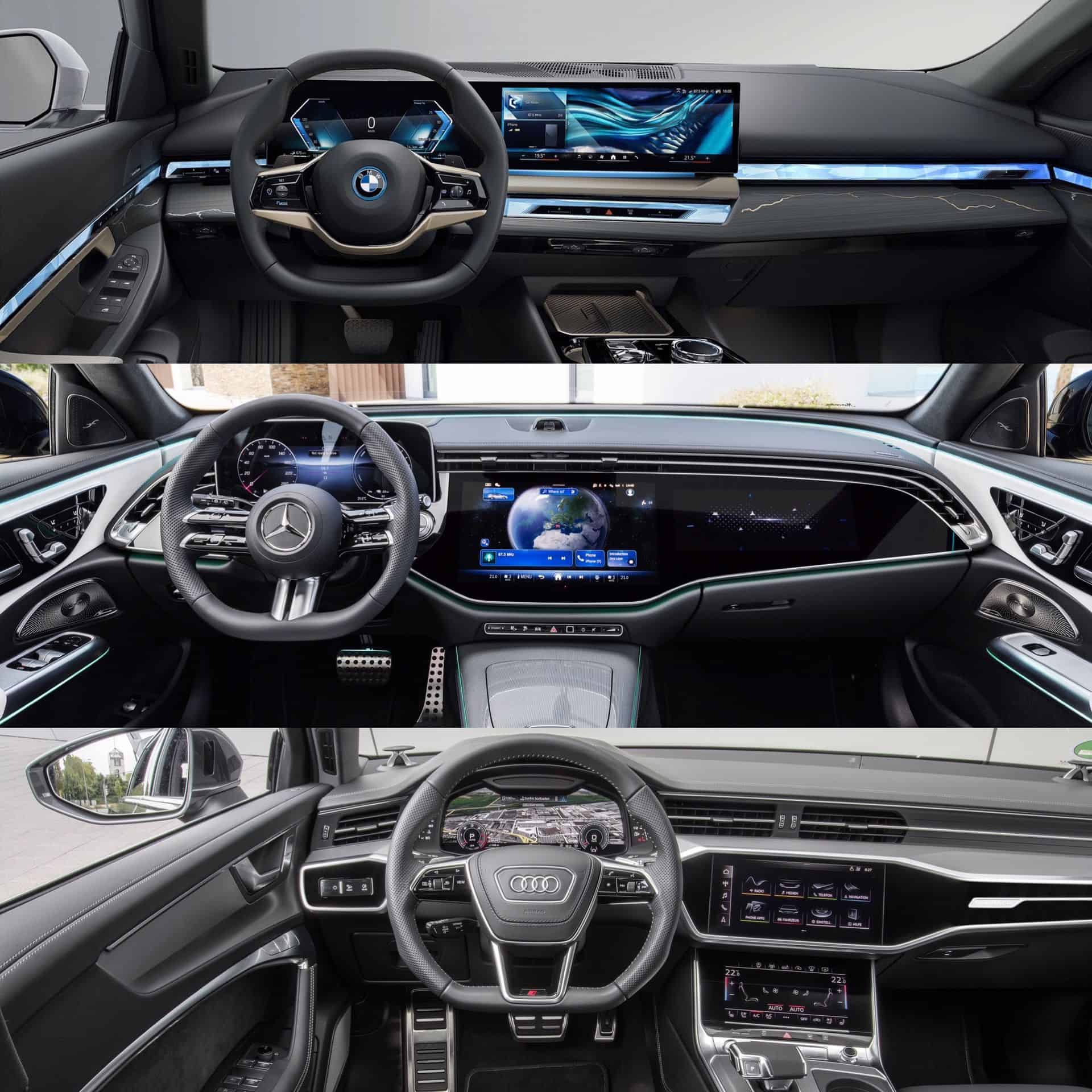Inside, the similarities continue. The new 5 Series Touring features nothing unexpected: a 14.9-inch center display and a 12.3-inch digital gauge cluster, all bundled in the BMW Curved Display. The Mercedes comes with two separate screens but minimal buttons elsewhere. The Audi A6 Avant is by far the most dated, featuring dual 10.1- and 8.6-inch screens. All three get multifunction steering wheels.