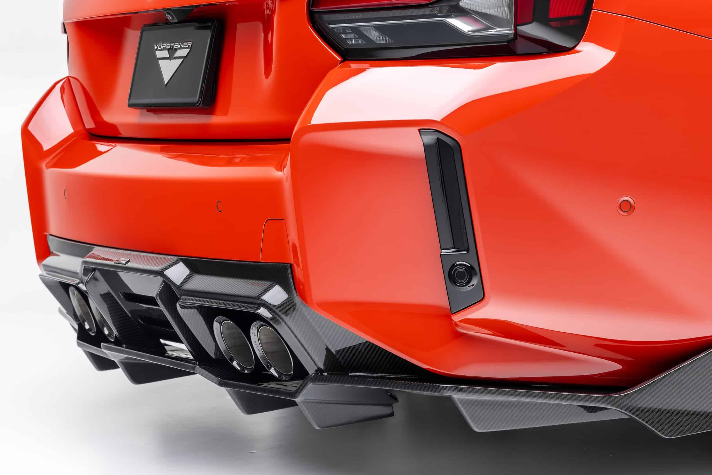 Much like the M2 CS we mentioned, Vorsteiner’s M2 VRS gets a ducktail spoiler neatly integrated into a carbon trunk lid as a nod to the M4 CSL and the M3 CSL before it. Alternatively, the tuner keeps the original panel to which it mounts a large wing for an even greater visual impact. Also at the back, the chunky diffuser looks like something you’d find on a race car. It’s also made from carbon fiber and is built around the quad exhaust tips.