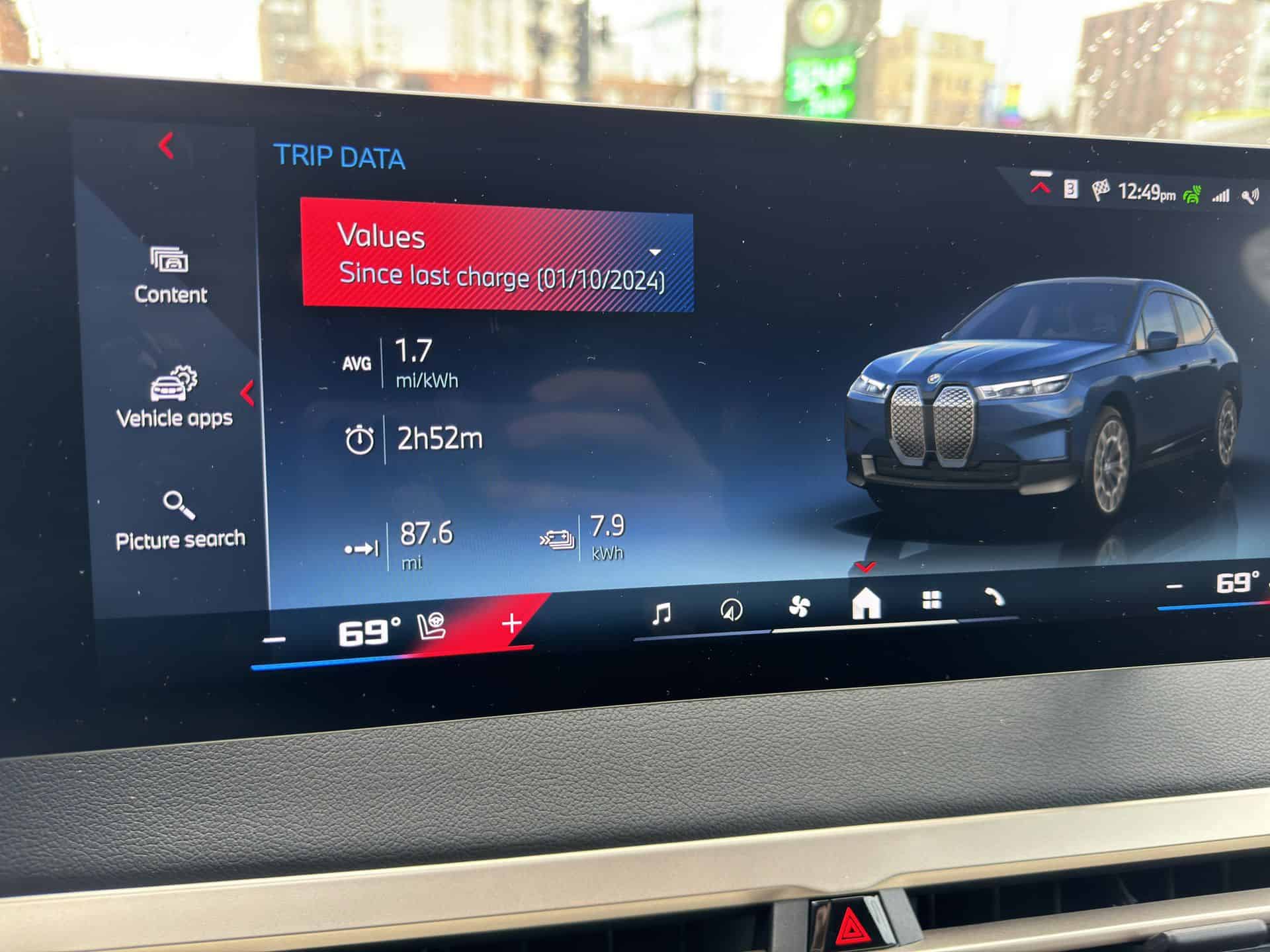 The range suffered significantly. In my previous report at 1,000 miles, I discussed the range extensively. The average consumption in fall (ideal temperature) was 2.4 miles per kWh, providing a range of 252 miles. Driving primarily on the highway, I could achieve a range of 305 miles (based on 2.9 miles per kWh multiplied by the 105.2 kWh net battery capacity). This 2024 BMW iX M60, equipped with 22-inch wheels, has an EPA-rated range of 274 miles.
