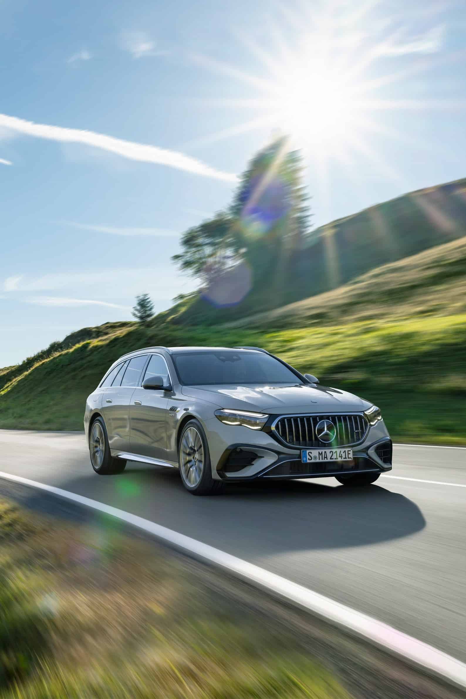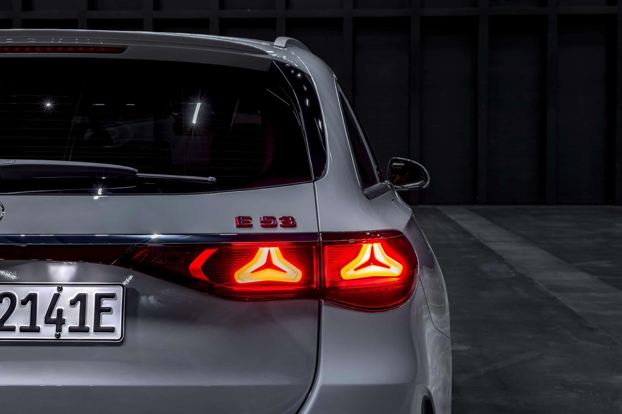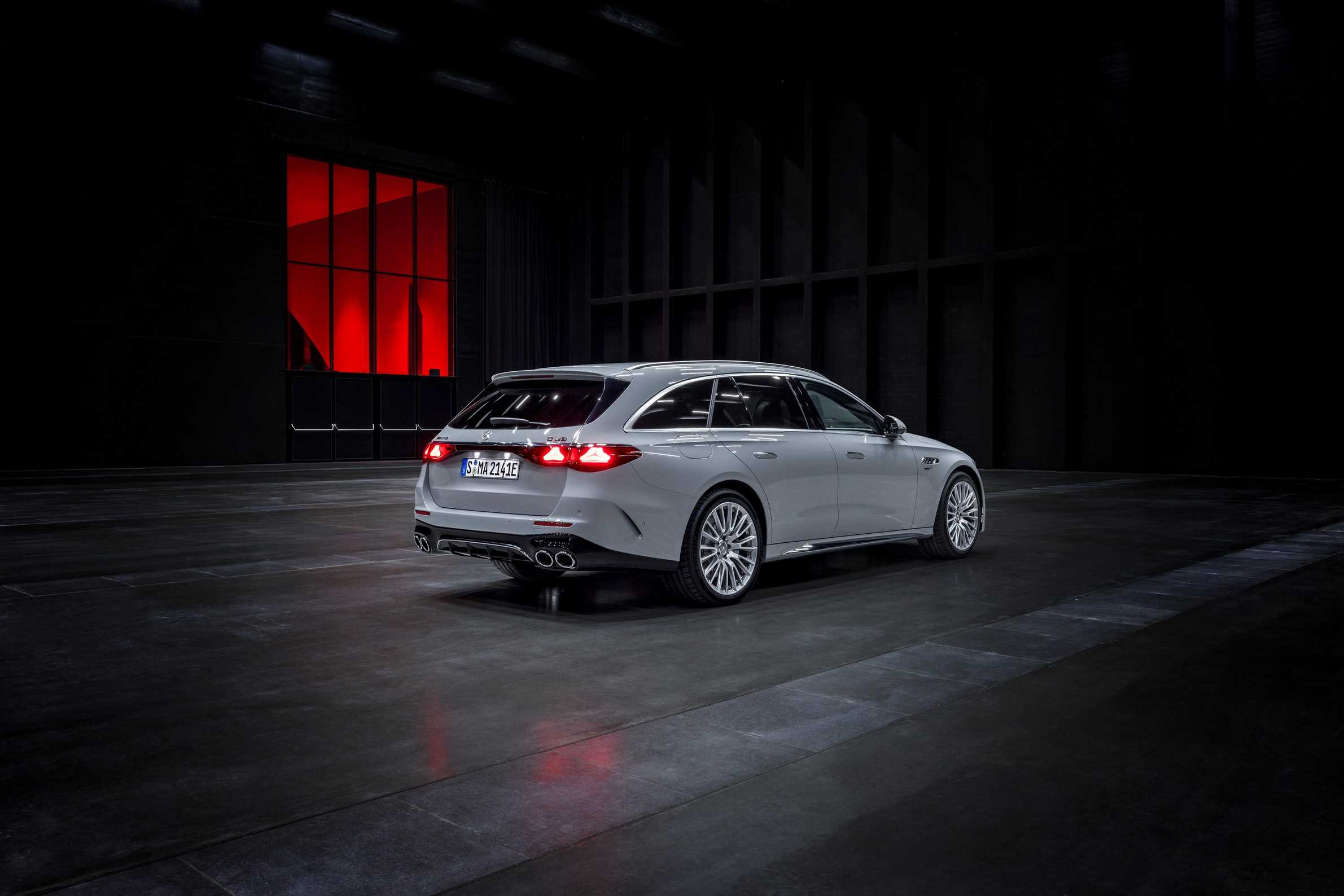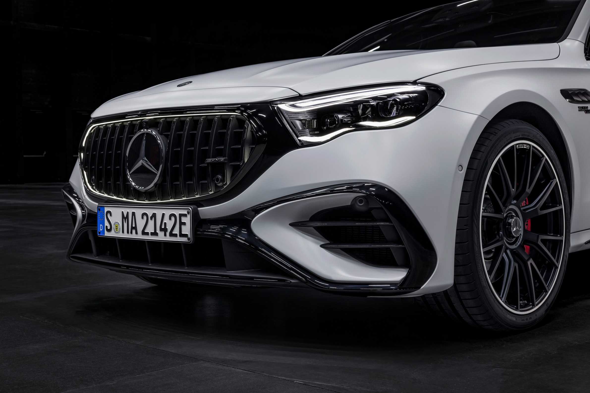 Mercedes will sell the AMG E53 as a more practical wagon as well, with both body styles getting a quad exhaust system, 19-inch wheels (up to 21 inches available), and a meaner front grille design. Because this new generation is a PHEV, there’s a charging port on the driver-side rear fender, mirrored by the gas cap on the other side. As expected, the lesser of the two AMG E-Class models has standard all-wheel drive, all-wheel steering, variable suspension with adjustable damping, extra struts for increased body stiffness, and chunkier brakes.