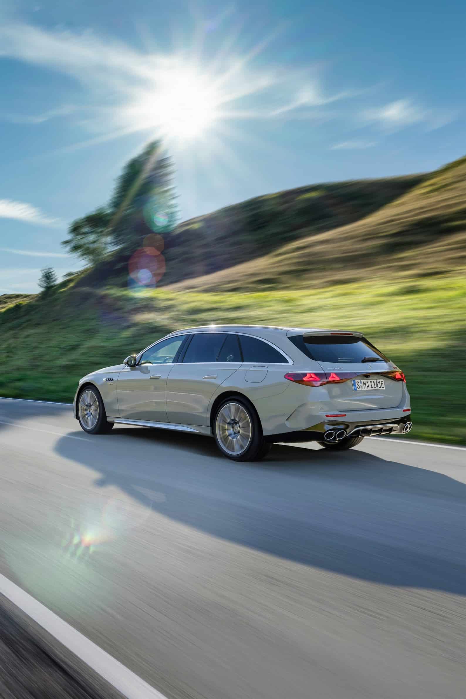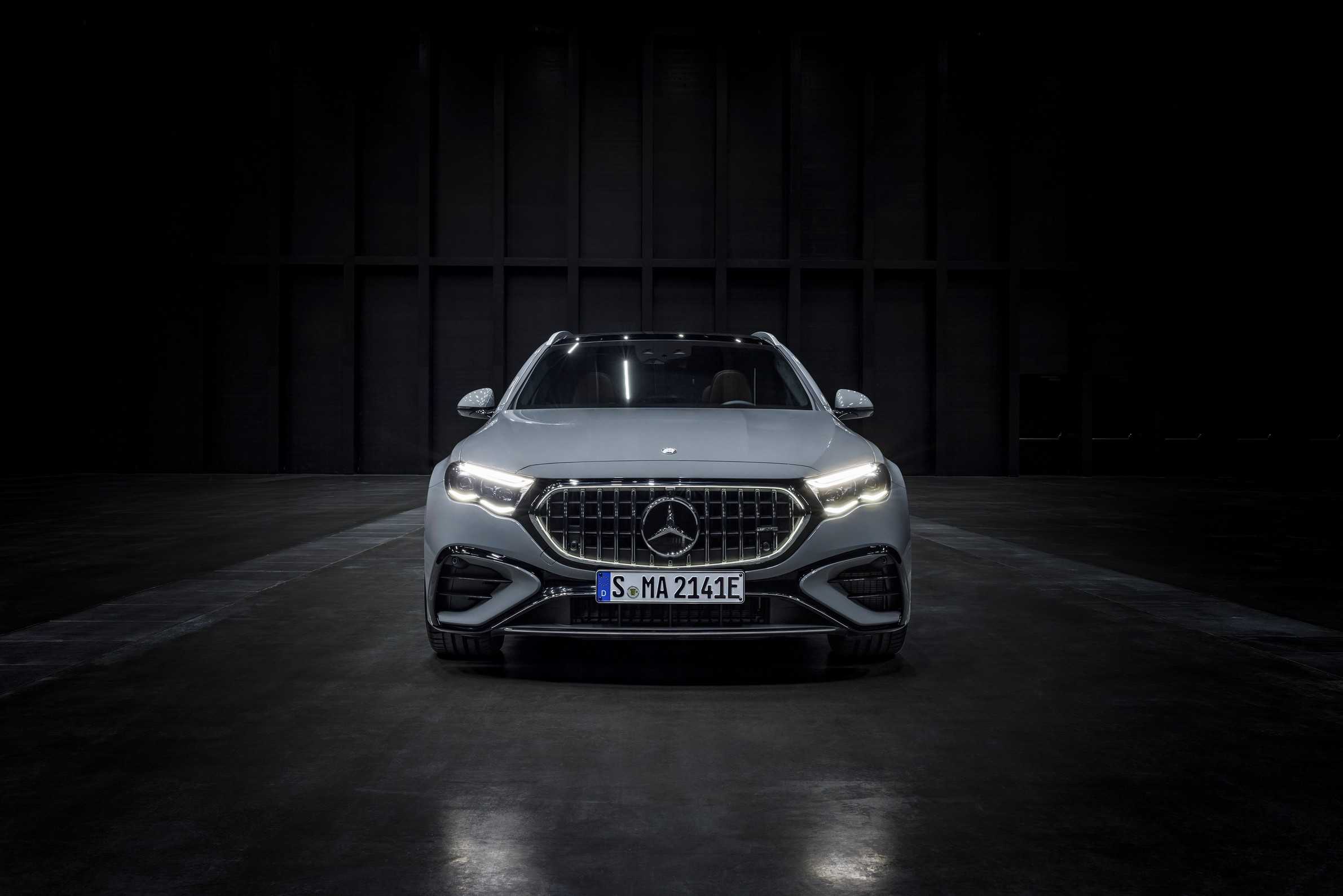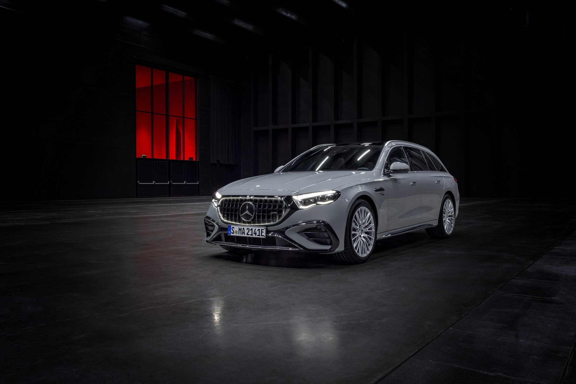 Mercedes will sell the AMG E53 as a more practical wagon as well, with both body styles getting a quad exhaust system, 19-inch wheels (up to 21 inches available), and a meaner front grille design. Because this new generation is a PHEV, there’s a charging port on the driver-side rear fender, mirrored by the gas cap on the other side. As expected, the lesser of the two AMG E-Class models has standard all-wheel drive, all-wheel steering, variable suspension with adjustable damping, extra struts for increased body stiffness, and chunkier brakes.