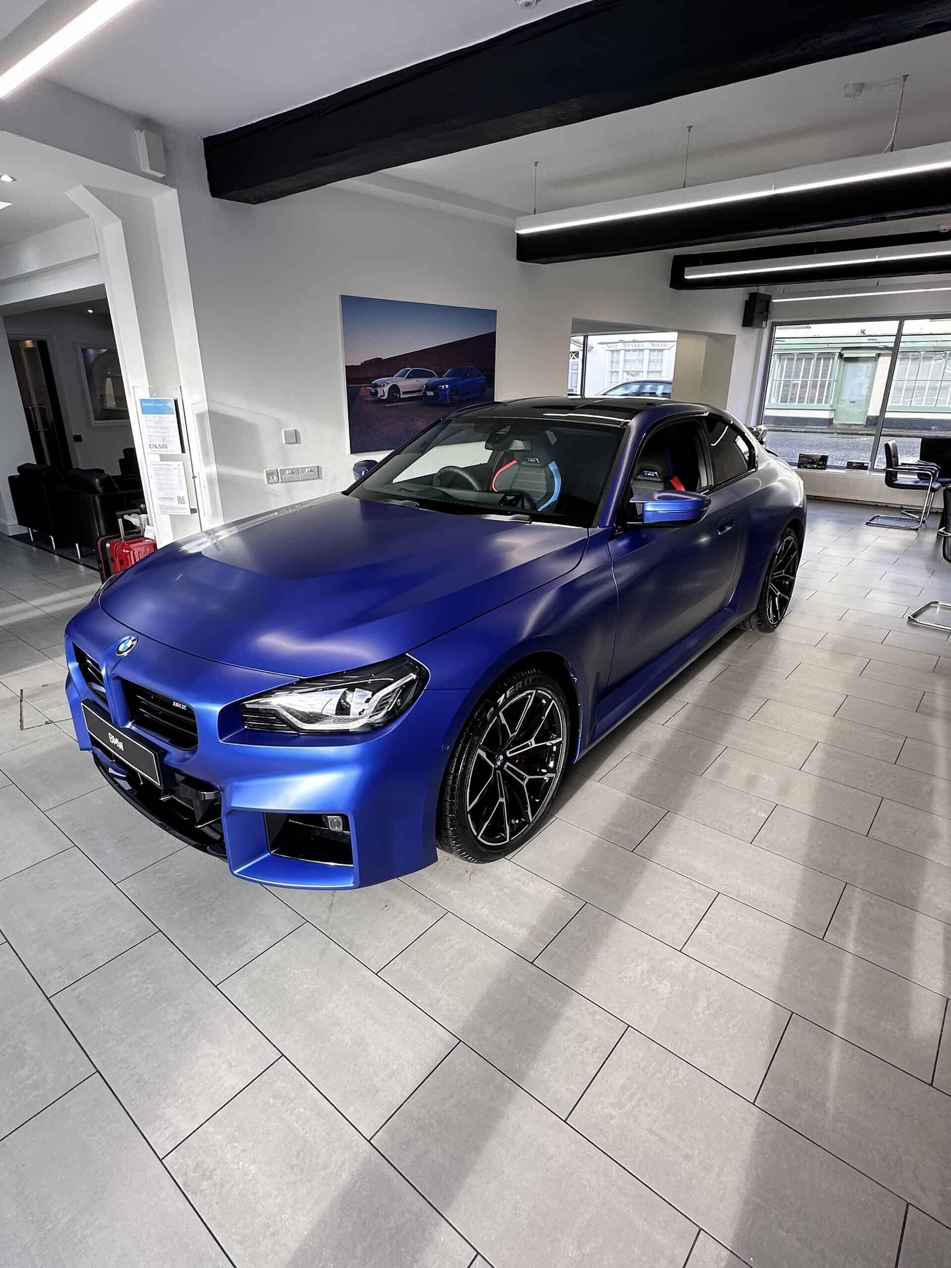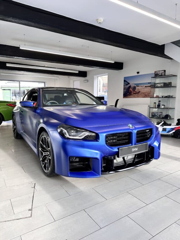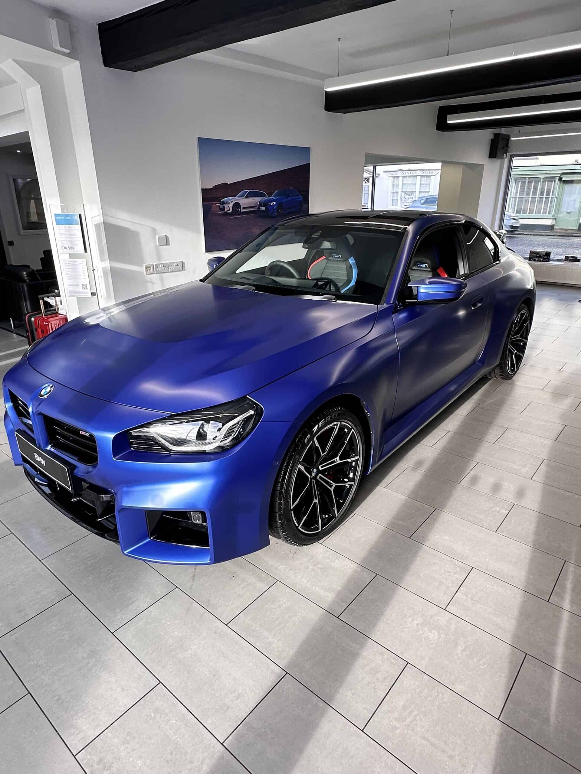 BMW initially offered the M2 with only five colors, none of which came from the Individual catalog. It wasn’t until mid-2023 that a couple of matte paints were introduced: Frozen Pure Grey and Frozen Portimao Blue. Having seen the former earlier this week in real-life shots of a G87, it only makes sense to take a closer look at the latter. This right-hand-drive M2 was photographed in the United Kingdom awaiting delivery for a customer.