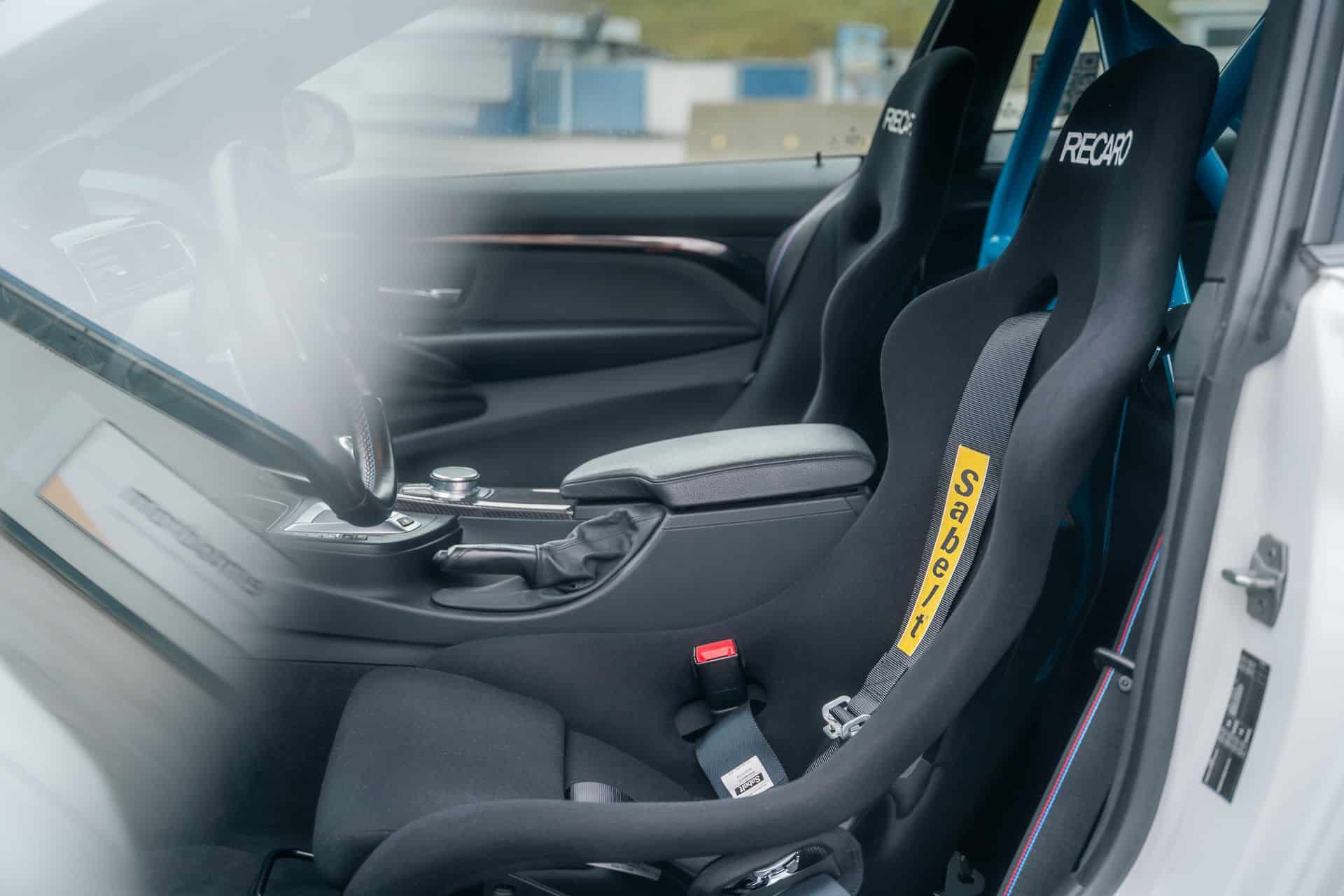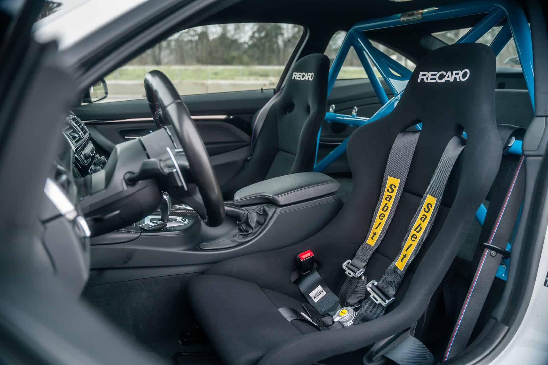 The outside of this F82 M4 Competition features a range of BMW M Performance aerodynamic components, such as carbon fiber rear wing, front splitter and left and right side wings. A specific wrap design gives the M coupe the overall motorsport look. The interior is upgraded with a lightweight BMW M4 roll bar, a rear-seat delete and RECARO Pole Position seats. A missing detail is the absence of an Alcantara steering wheel.