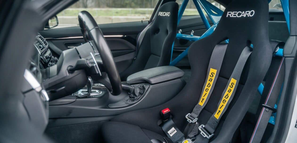The outside of this F82 M4 Competition features a range of BMW M Performance aerodynamic components, such as carbon fiber rear wing, front splitter and left and right side wings. A specific wrap design gives the M coupe the overall motorsport look. The interior is upgraded with a lightweight BMW M4 roll bar, a rear-seat delete and RECARO Pole Position seats. A missing detail is the absence of an Alcantara steering wheel.