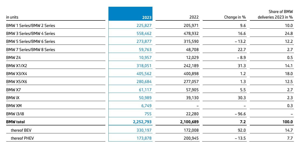 Attached below is a snippet from the BMW Group Annual Report 2023 with the sales results that bundle models rather than showing how individual cars performed.