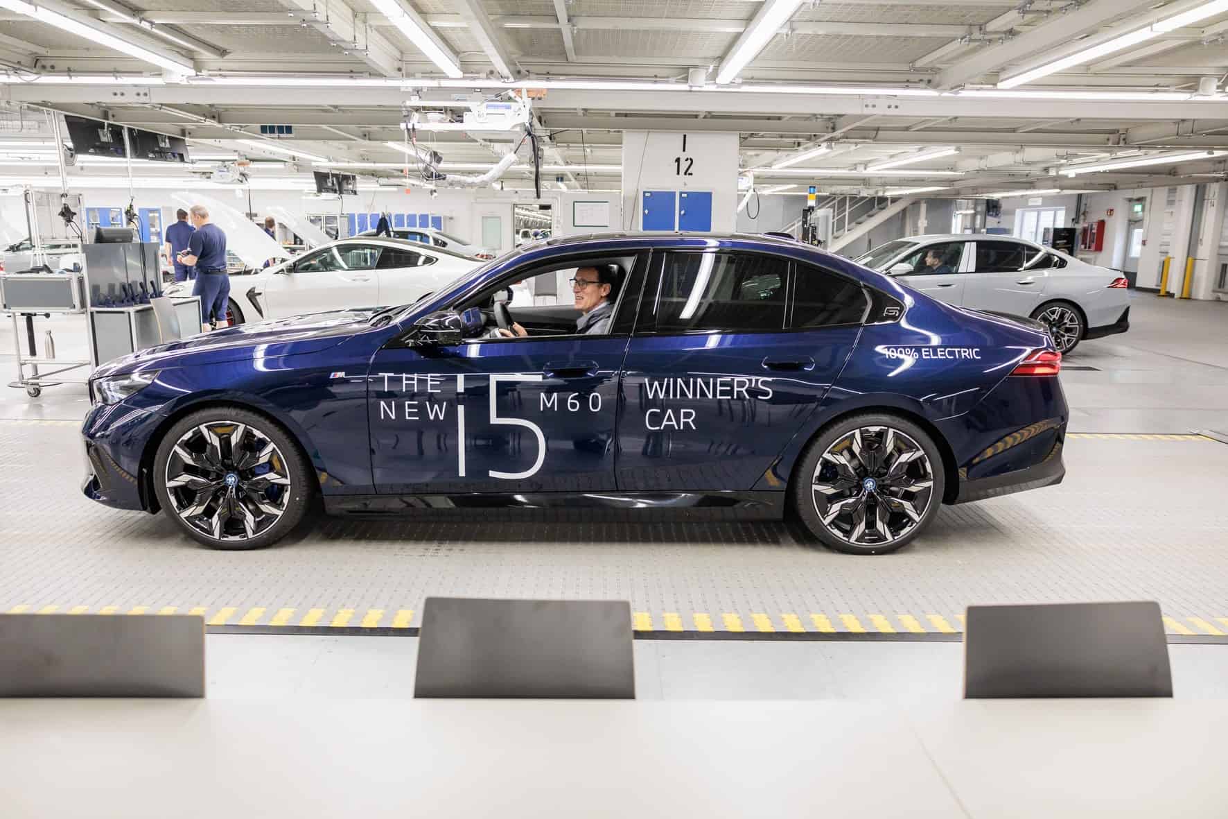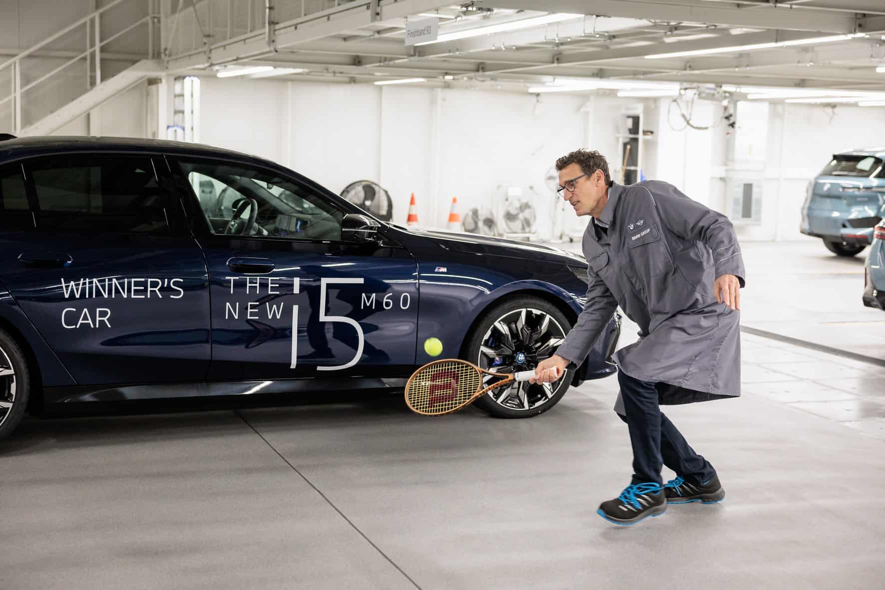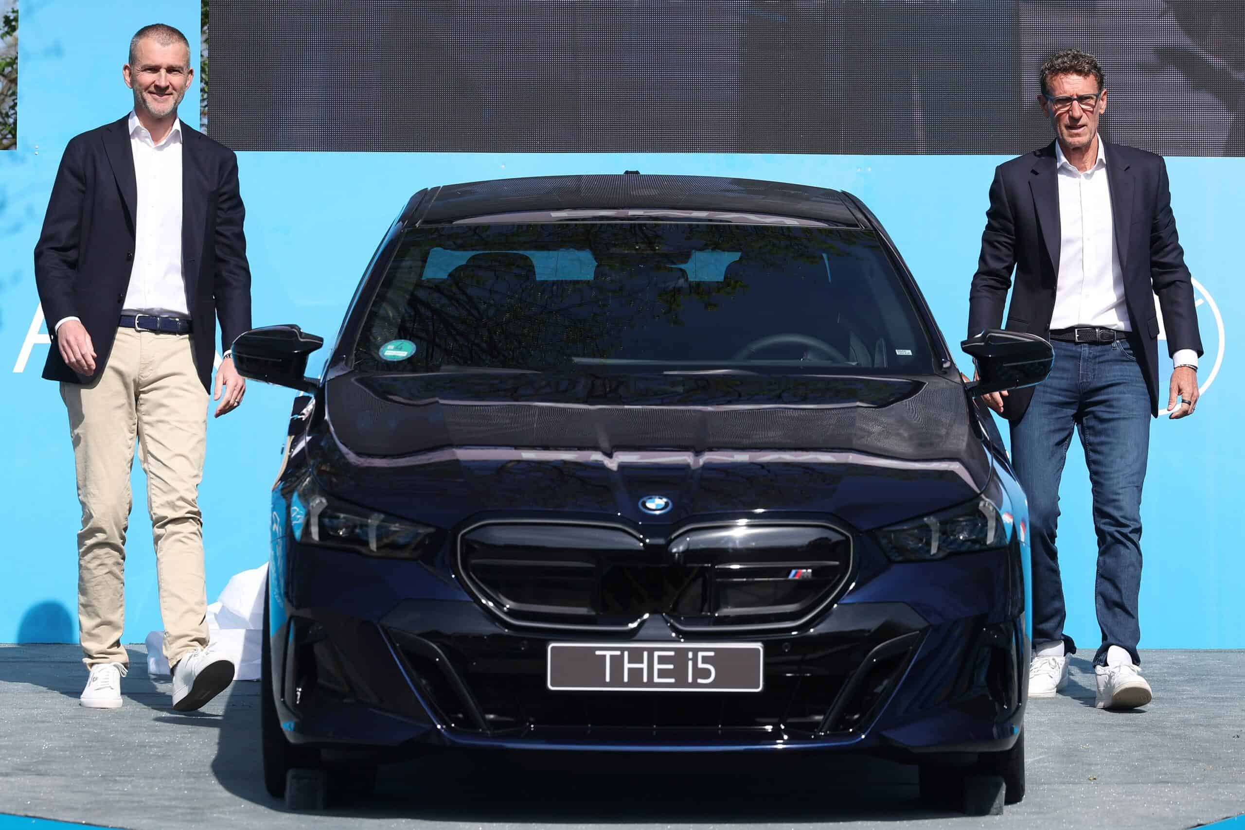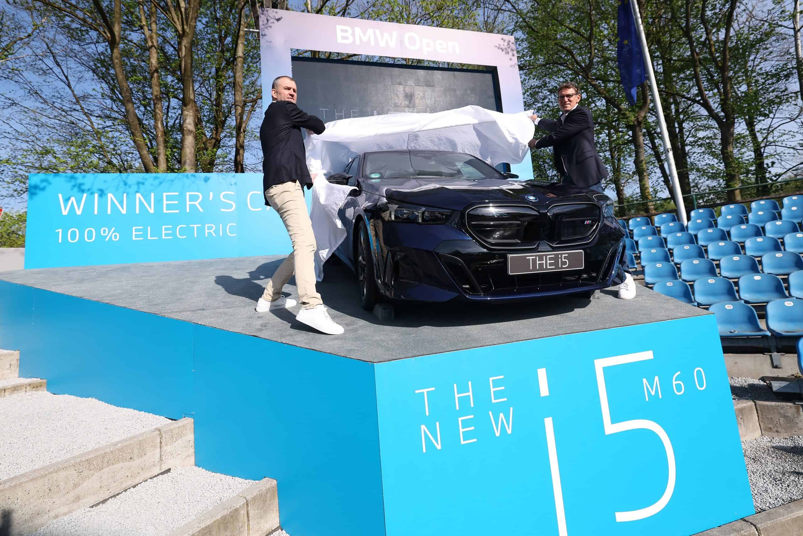 BMW Germany boss Christian Ach took the wraps off the big prize on the center court at the MTTC Iphitos. He was joined at the tennis club in Munich by tournament director Patrik KĂĽhnen. Previously, KĂĽhnen had been invited to the Dingolfing factory to inspect the i5 M60 and even drive it for a bit.