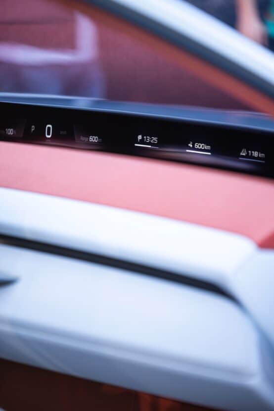 The interior represents an entirely new paradigm shift for the brand. With a focus on sustainability the cabin was adorned with cloth seats and other recyclable material that had a very mid century design reminiscent of car design from the 1950s and 1960s. The orange over tan interior color combination shown was warm and inviting in conjunction with the large windows and glass roof that let in a lot of natural light. There were even color matched pillows in the rear seat similar to the XM.