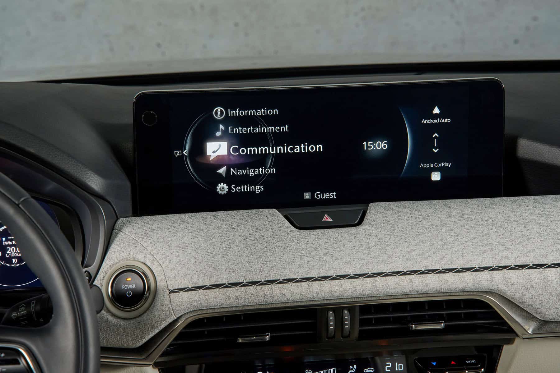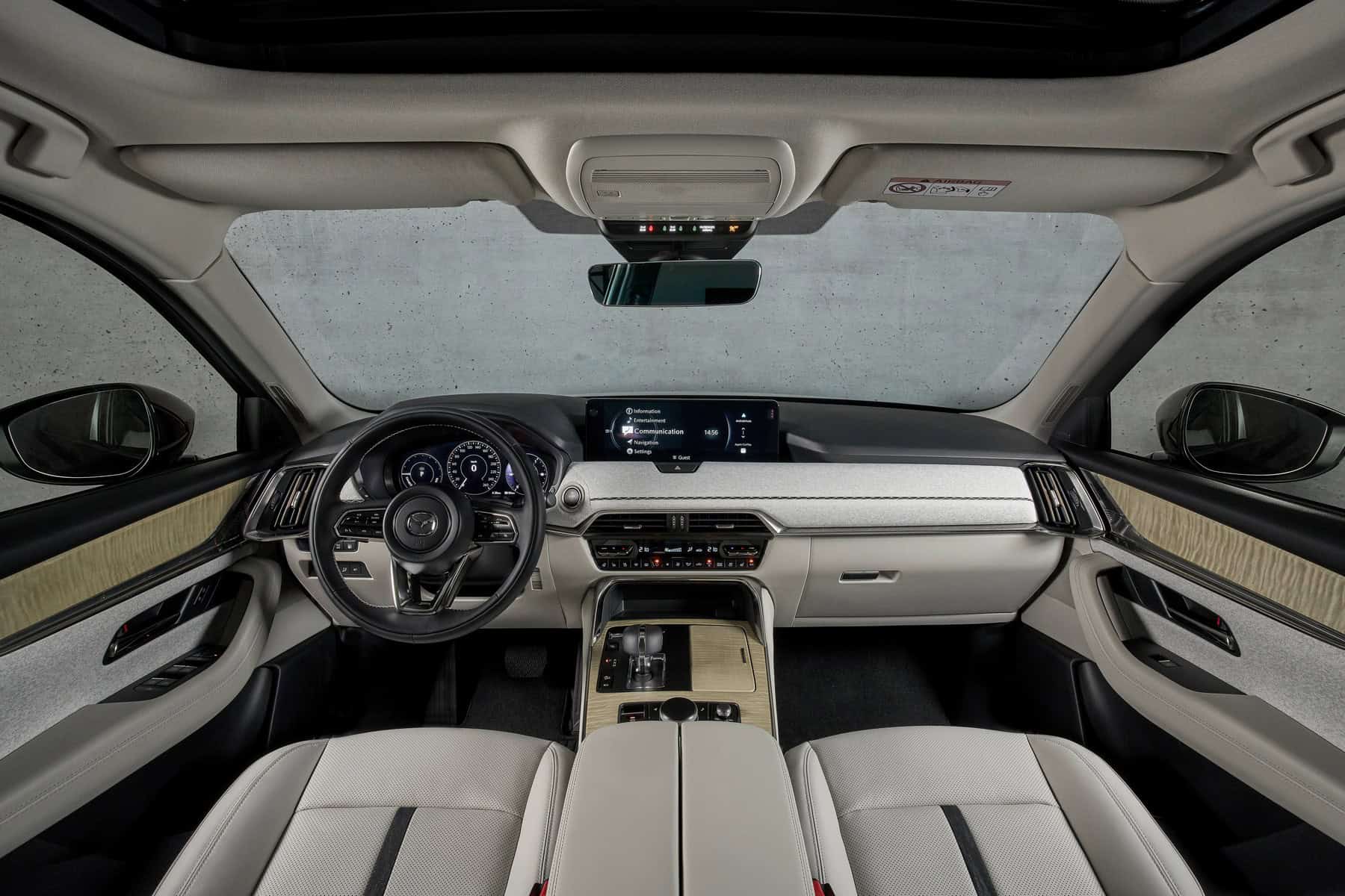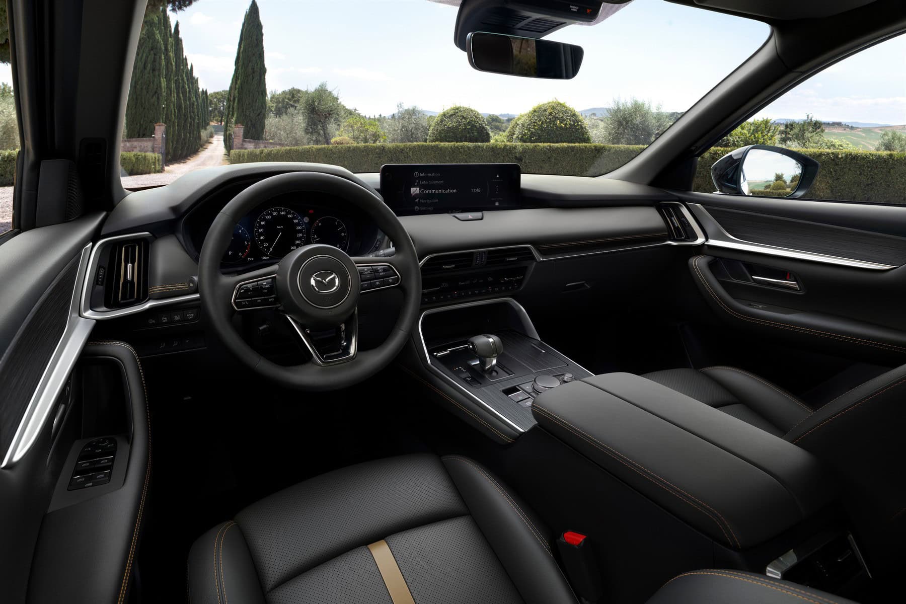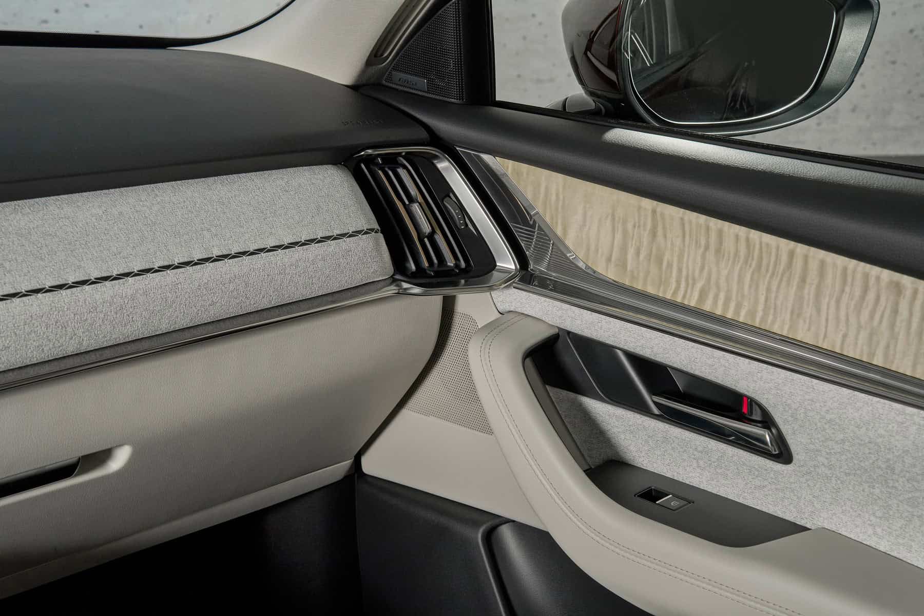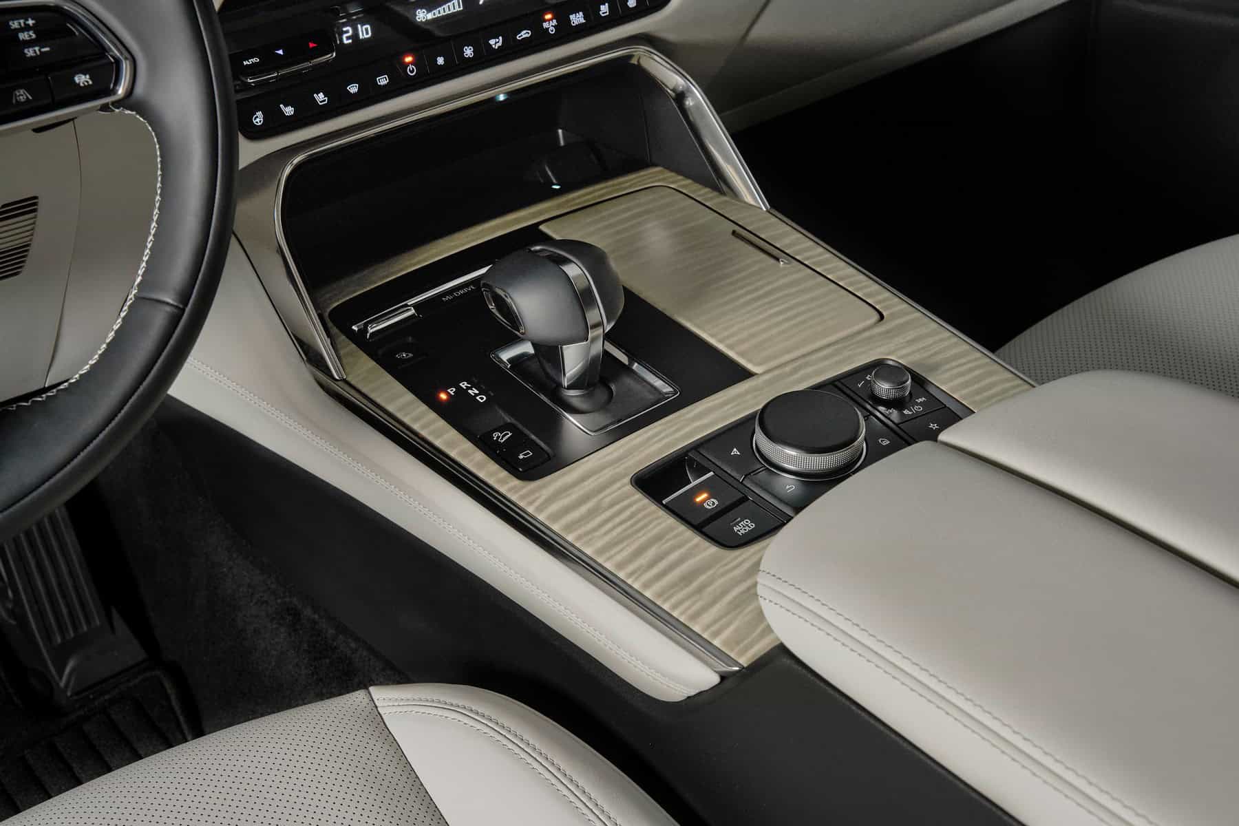 The interior sure looks like a nice place to be in. After all, Mazda aspires to be a luxury brand. The cabin looks posh, and unlike inside the X5, there are plenty of physical buttons. The CX-80 has separate controls for the climate settings rather than moving everything inside the 12.3-inch touchscreen. The fully digital instrument cluster also has a 12.3-inch display. Speaking of BMWs, the iDrive-esque rotary knob seen in other Mazdas is there.
