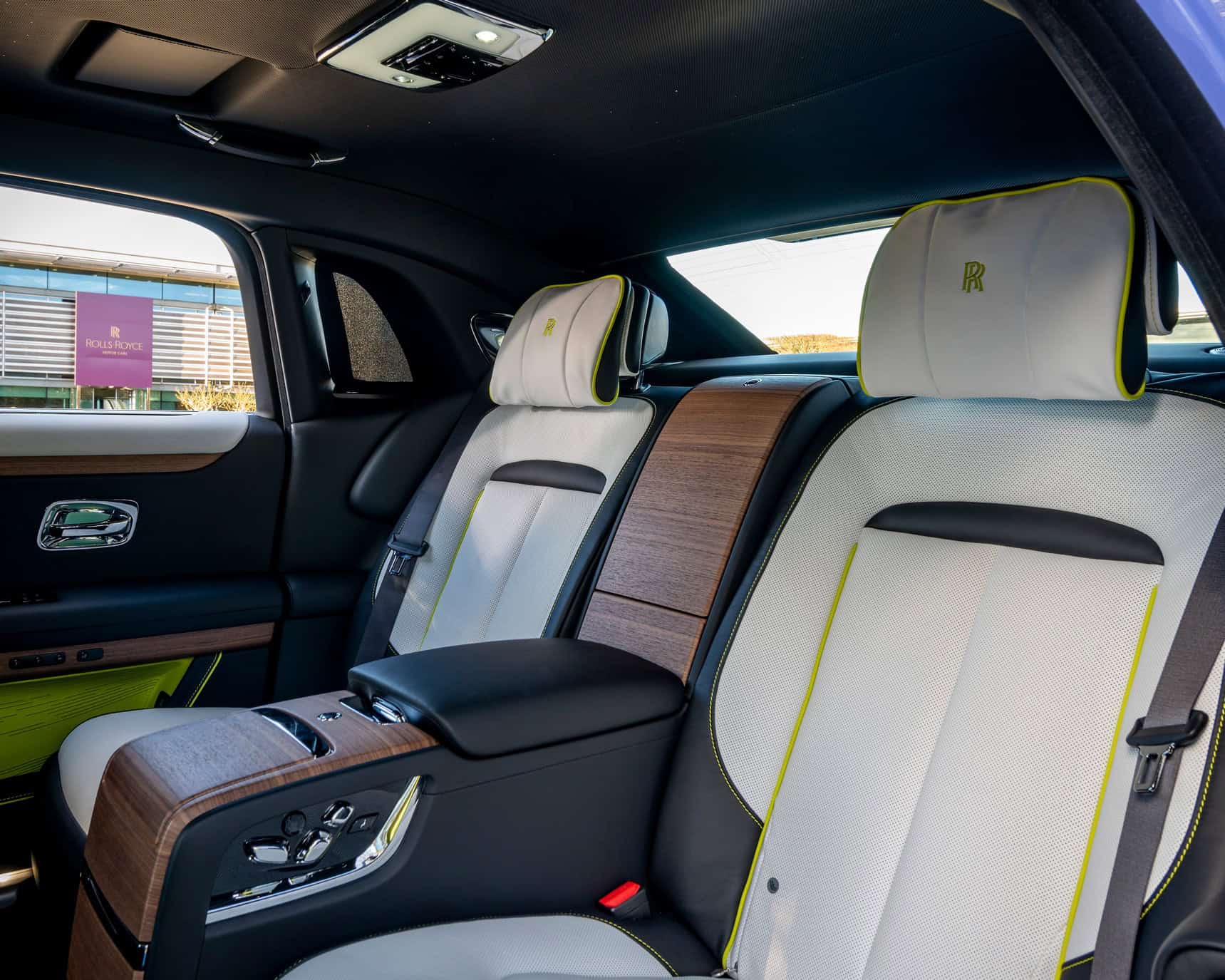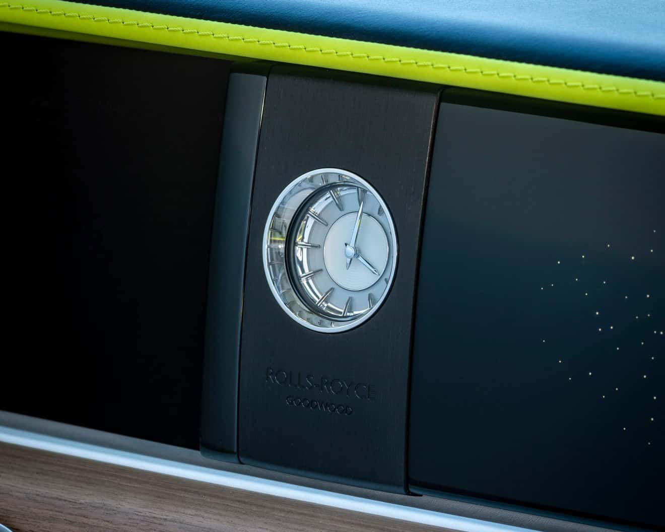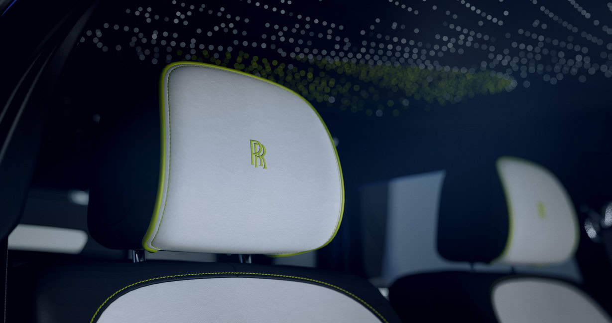 As with all Rolls-Royce models, the real magic is inside where there are 104,268 stitches across all four door panels. In addition, it’s hard to miss the Lime Green accents on the Black and Arctic White leather seats. This one too has a Starlight Headliner, comprised of 520 lime green and another 520 white stars.