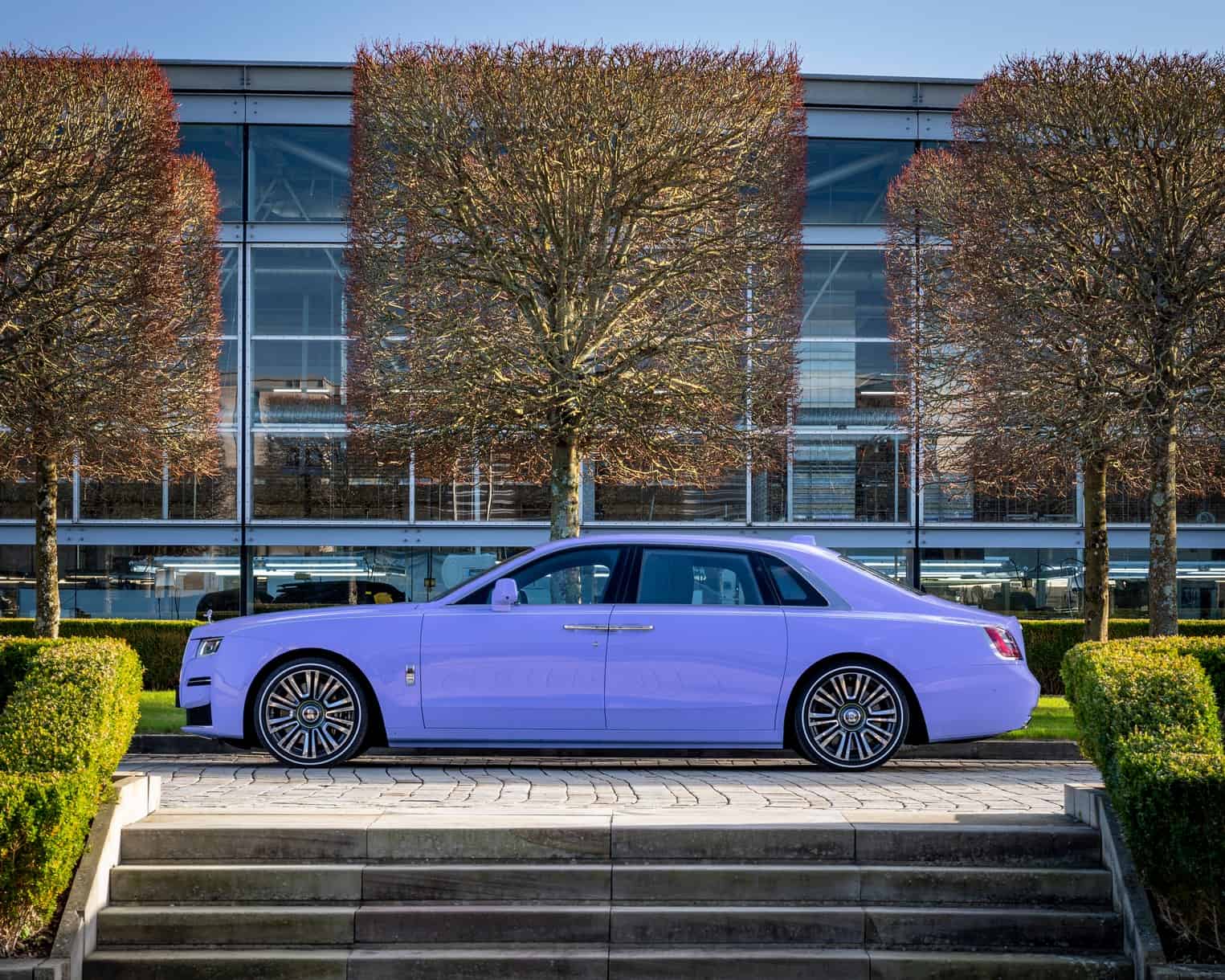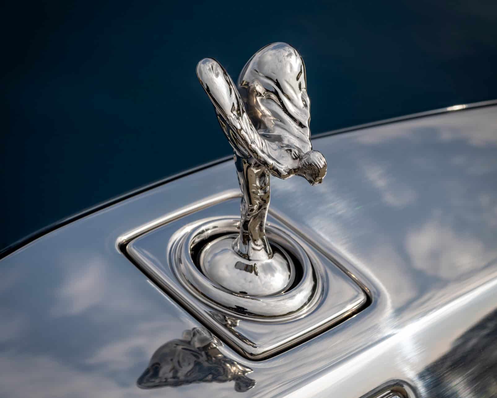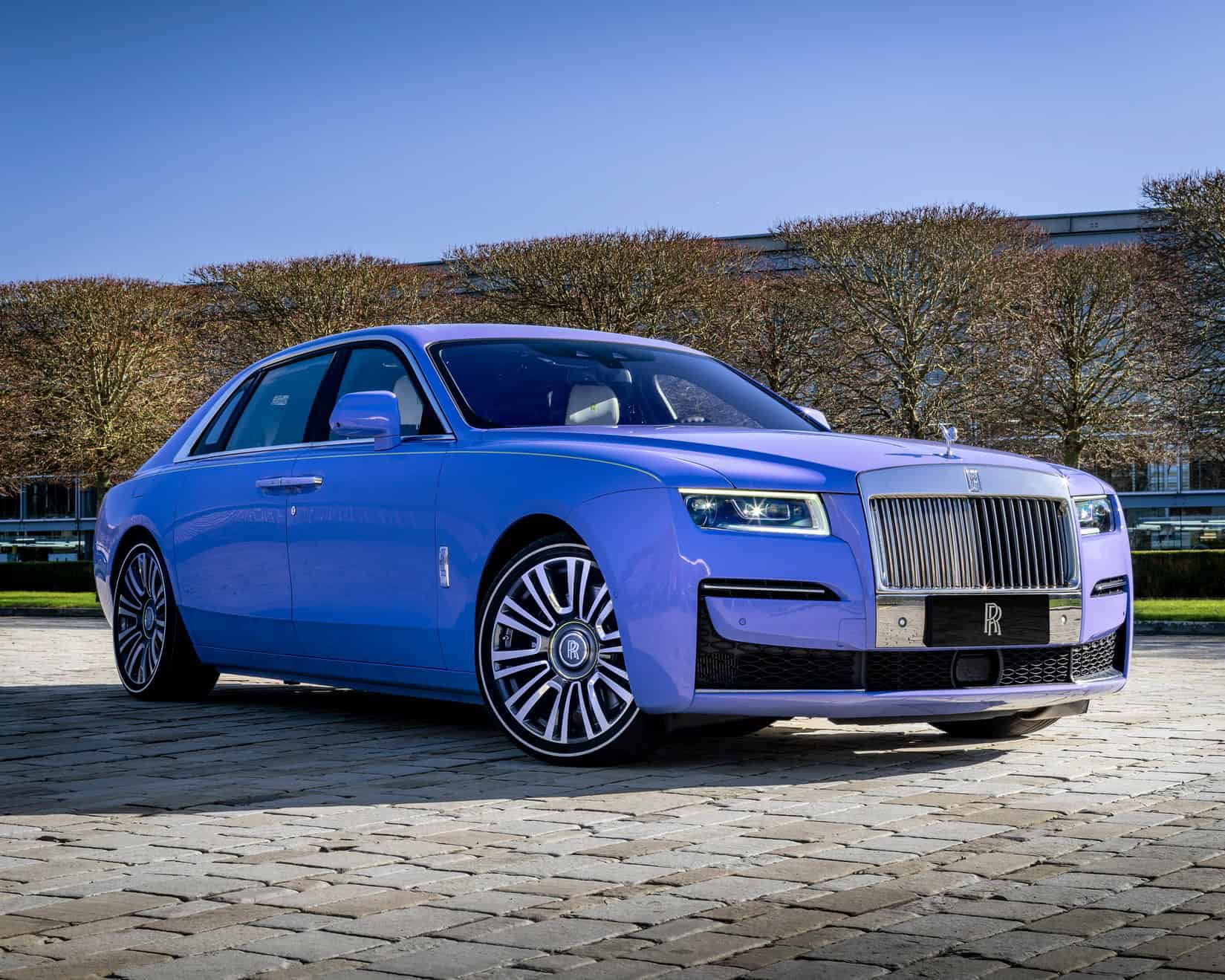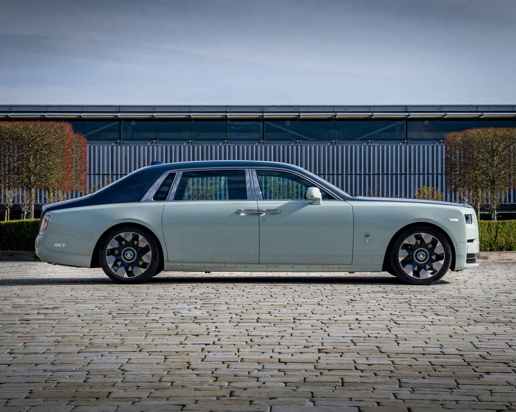 Last but certainly not least, the stretched Ghost has an eye-catching Boracay Blue paint job with a hand-painted Lime Green coachline. The 21-inch wheels are partially polished and come wrapped in tires with retro-flavored white sidewalls.