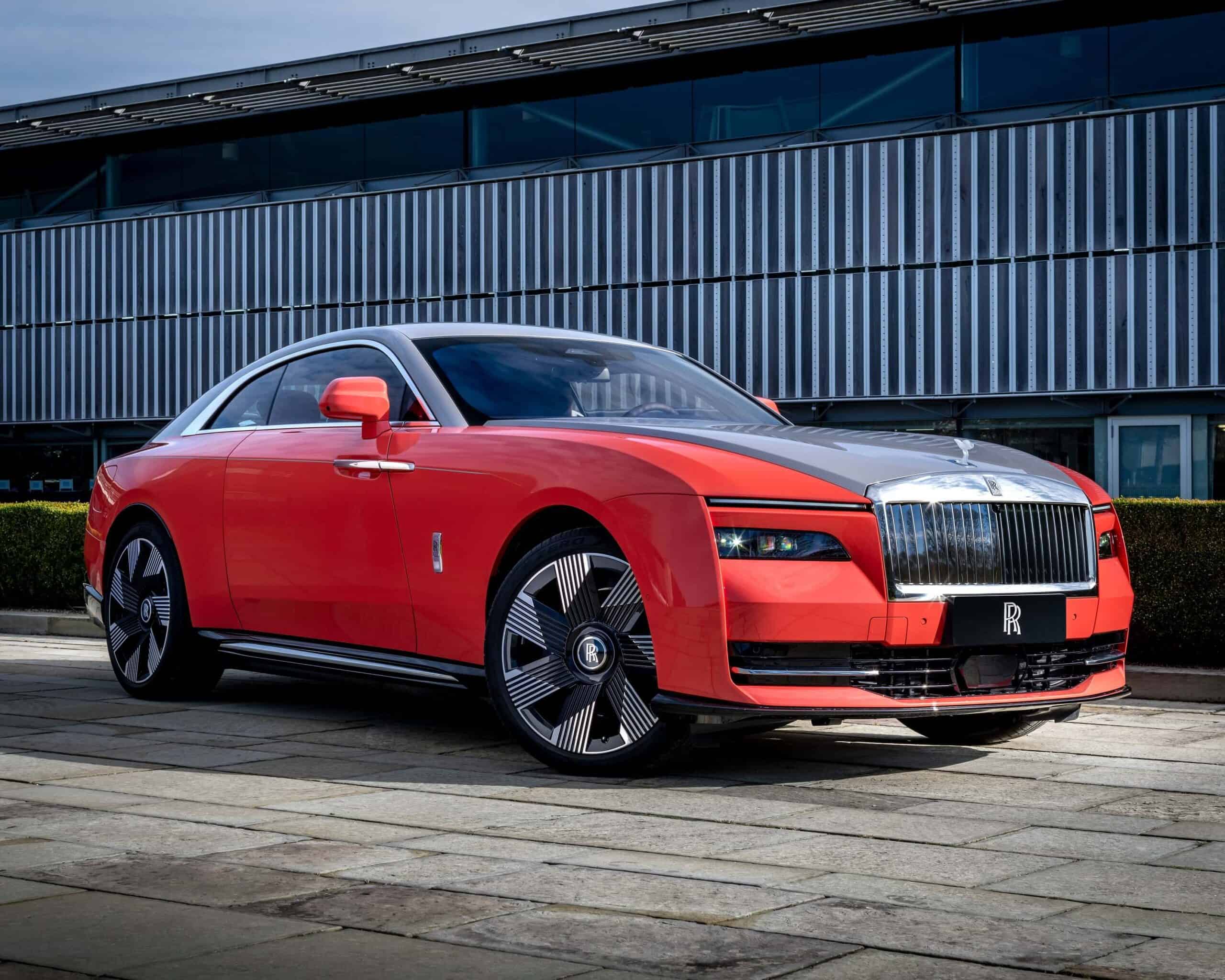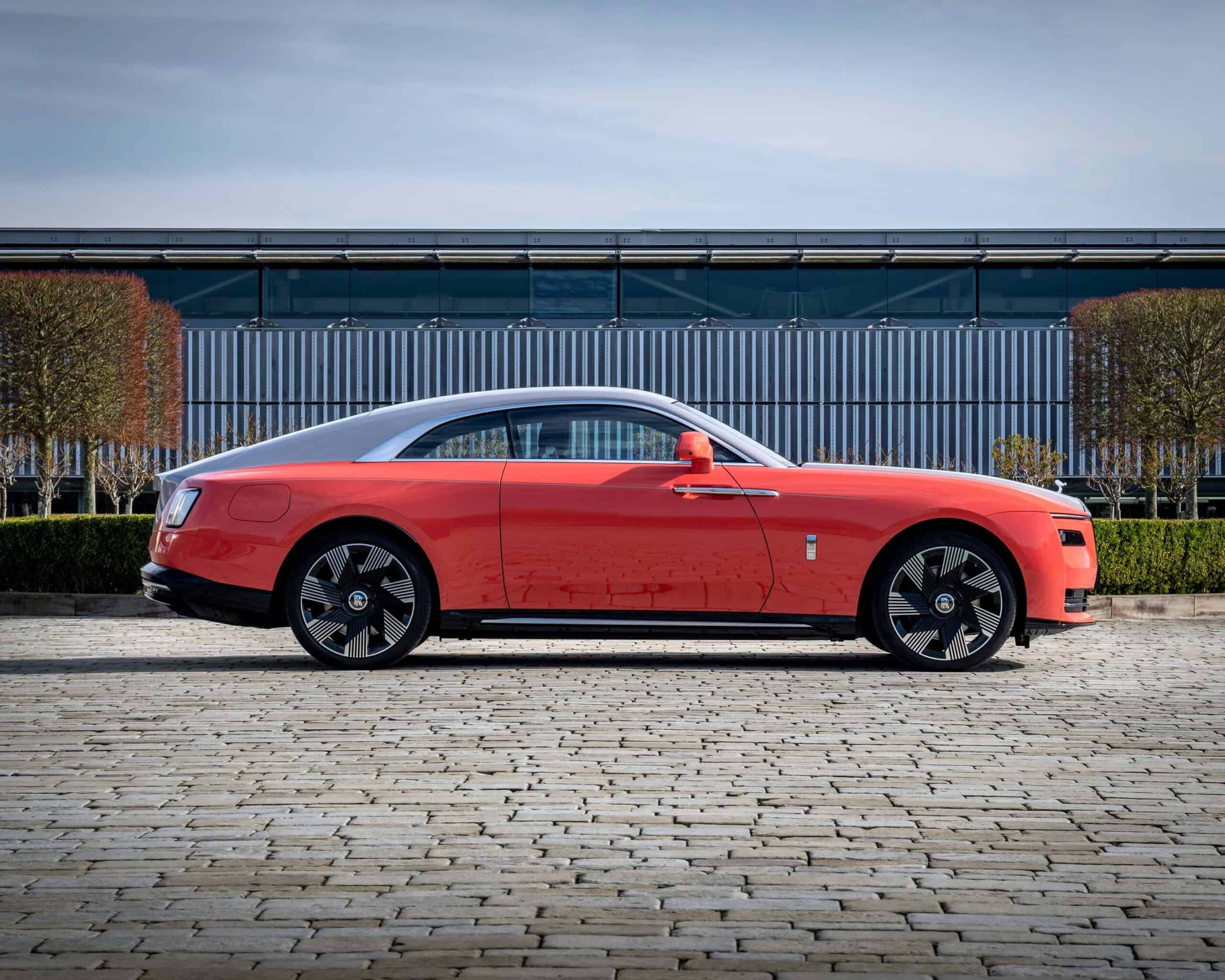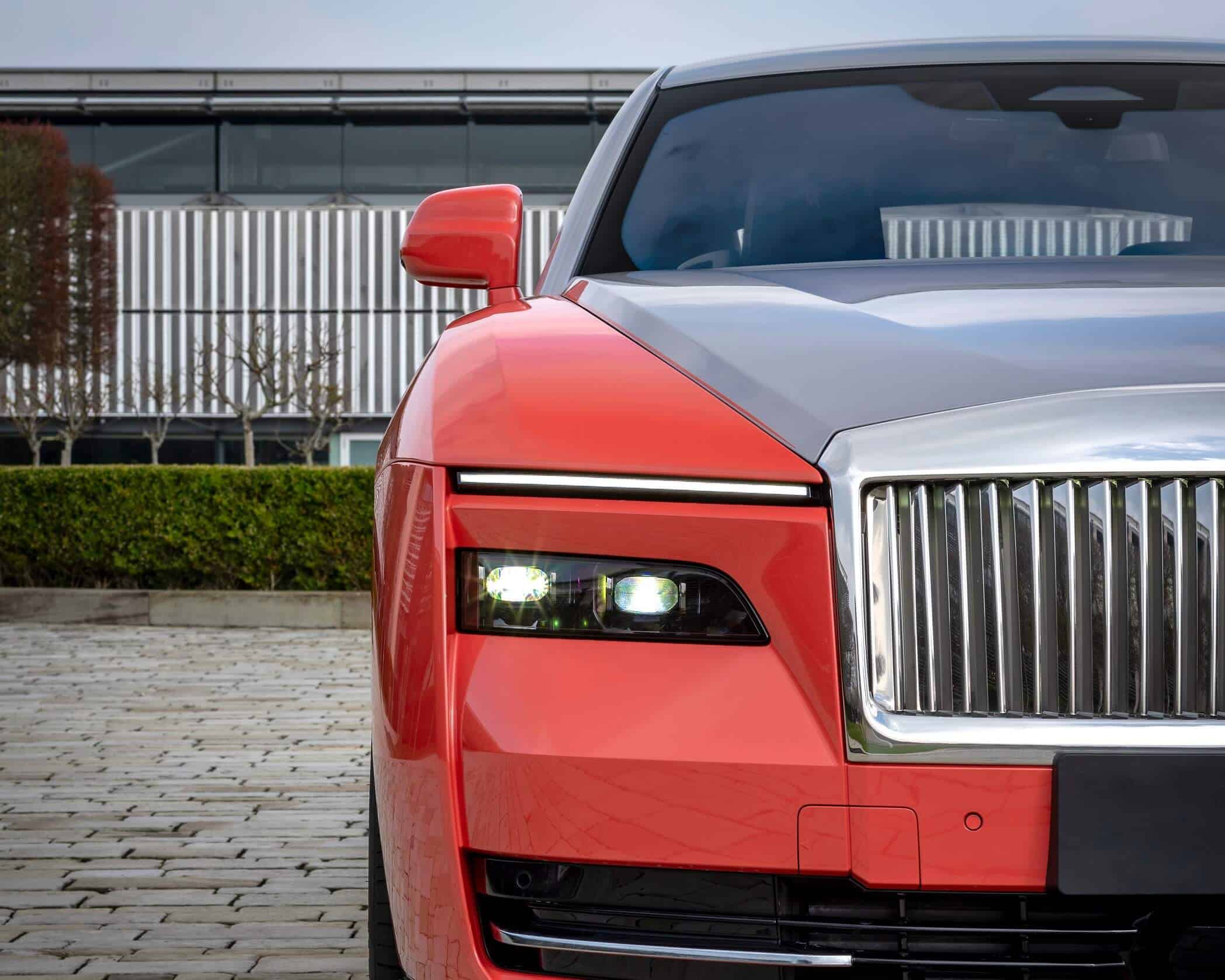 Starting with the EV, its striking two-tone finish takes after South America’s tropics. Spectre combines Lantana Red with Tempest Grey and rides on 23-inch wheels with a seven-spoke, part-polished look. The center caps get a body-matching Lantana Red while the Spirit of Ecstasy is discreetly illuminated.