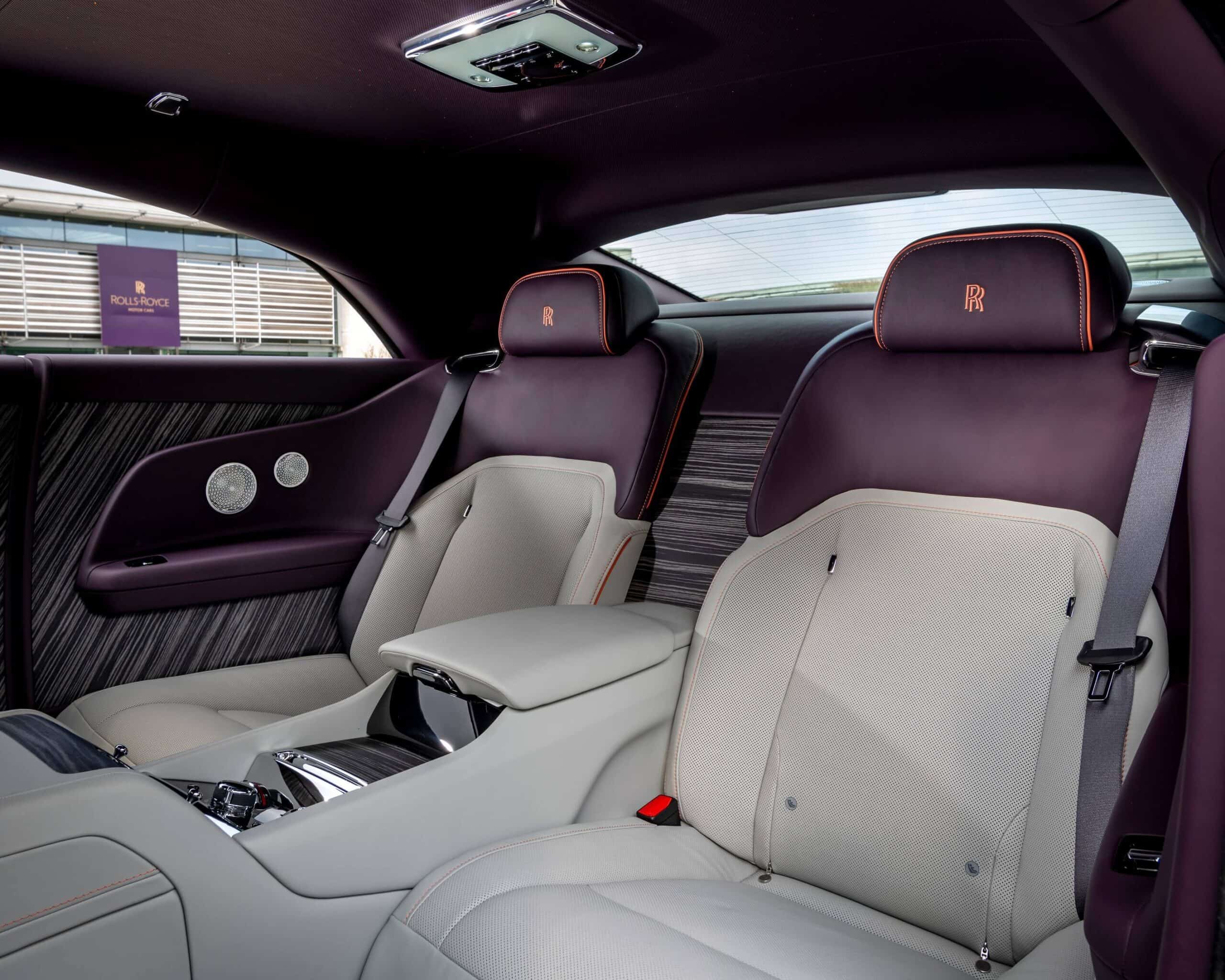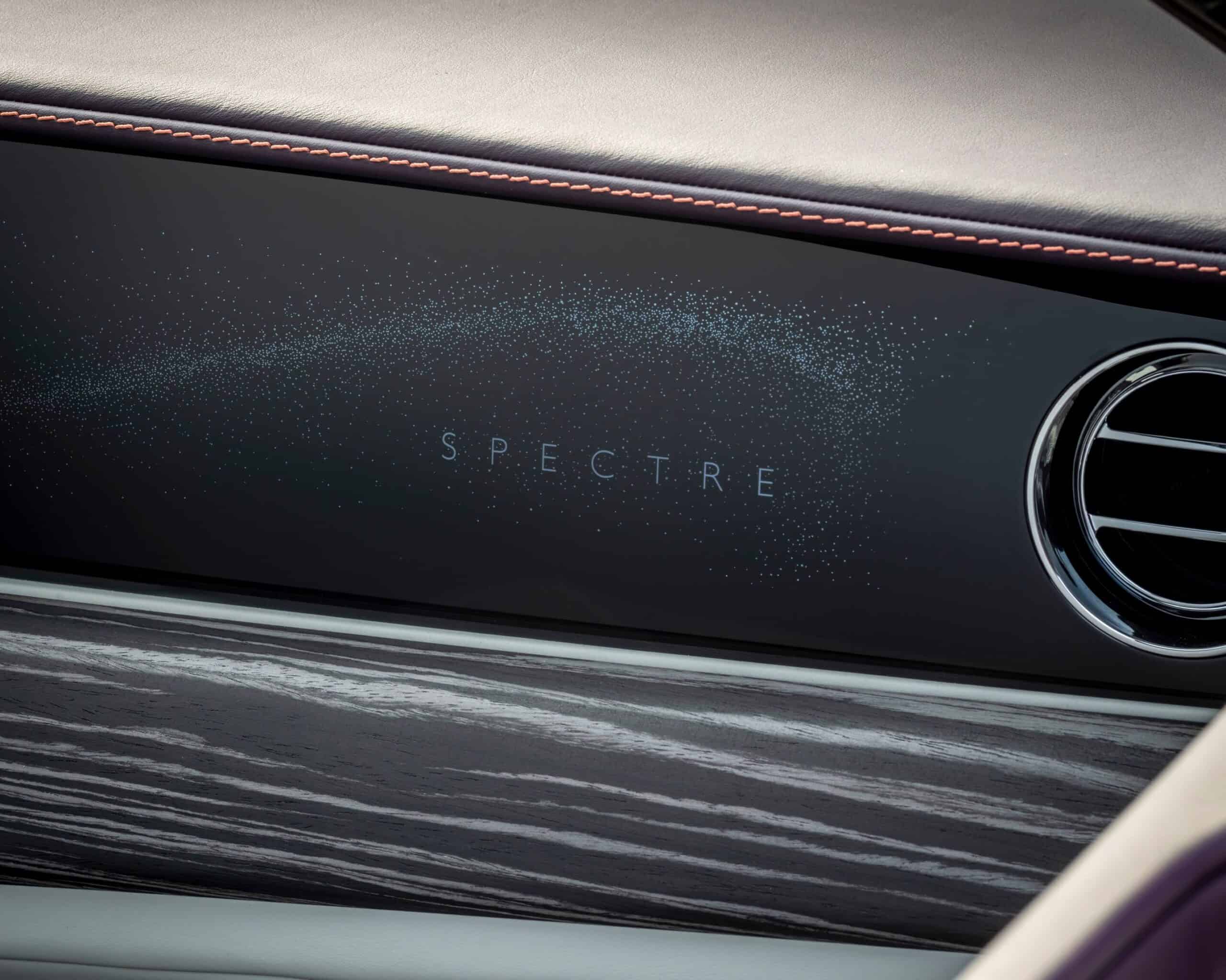 Stepping inside the two-door cabin, the Spectre offers a mélange of Selby Grey, Purple Silk, and Sunset leathers. The glitzy headliner has no fewer than 960 backlit “stars” and you’ll also notice the purple instrument dials. As a finishing touch, Rolls-Royce installed Obsidian Ayous veneer.