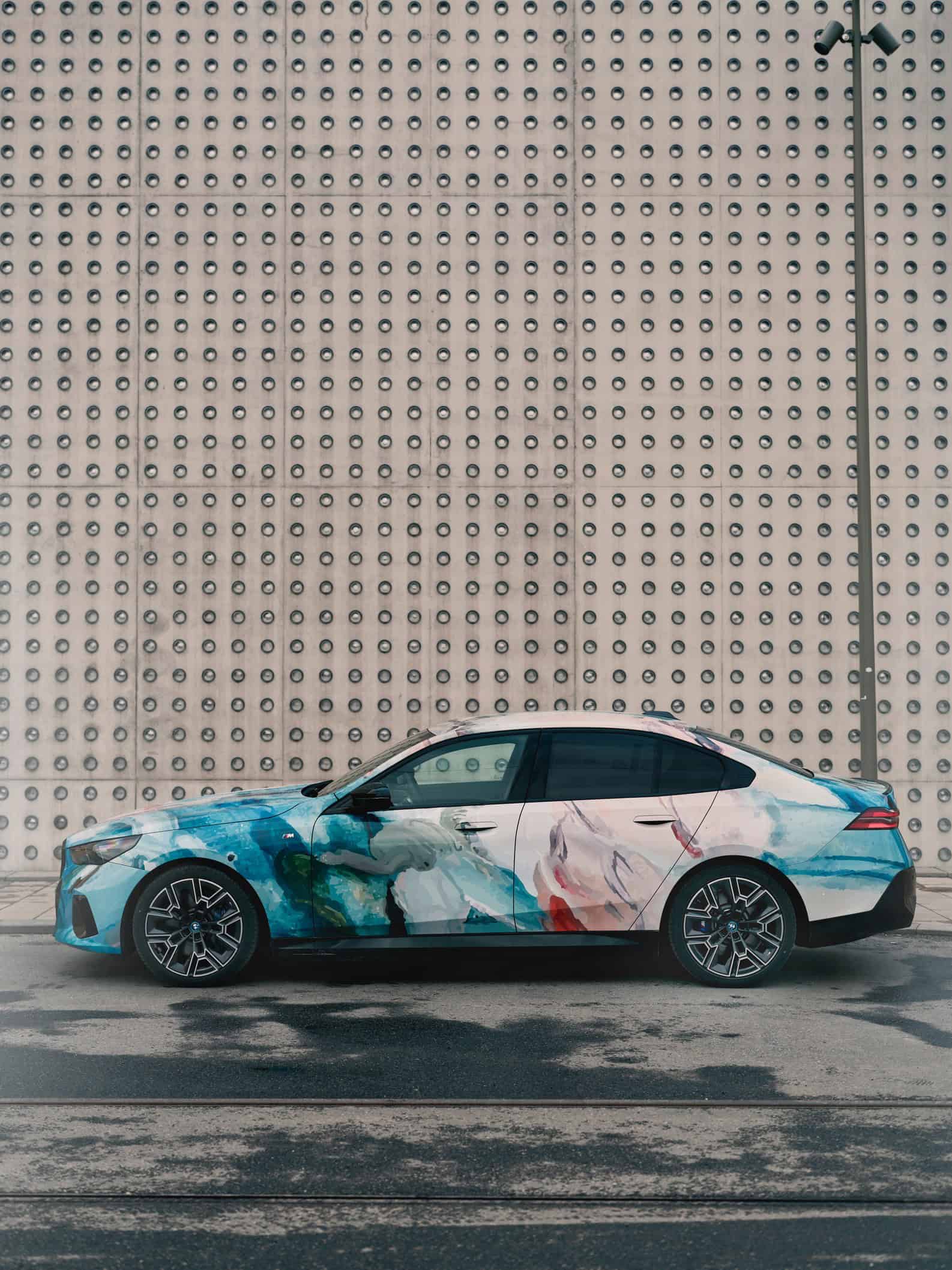 The i5 M60 seen here has the Shadowline headlights and the larger 20-inch M Aero wheels (Styel 939M) with a two-tone design and blue brake calipers. A variation of that kidney grille design with the M logo is coming to the full-fat M5 soon. Those glossy black accents nicely contrast the vivid livery applied by Karin Westman. According to BMW, her abstract work takes after the Baroque and focuses on a rich color palette with dramatic tones.