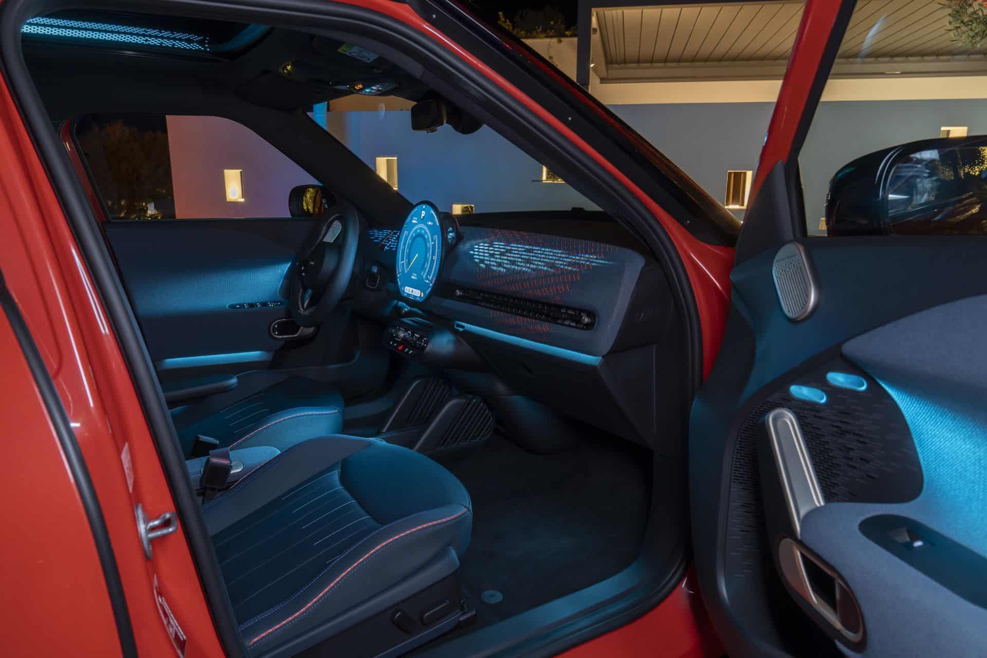 The splashy exterior theme continues inside with bold colors and intricate ambient lighting. Some parts of the cabin are covered with recycled polyester while others are in synthetic leather. As with other recent MINIs, you can’t get real leather upholstery for the Aceman. The multi-colored knitted textile and red stitching do a good job of spicing up the ambiance.