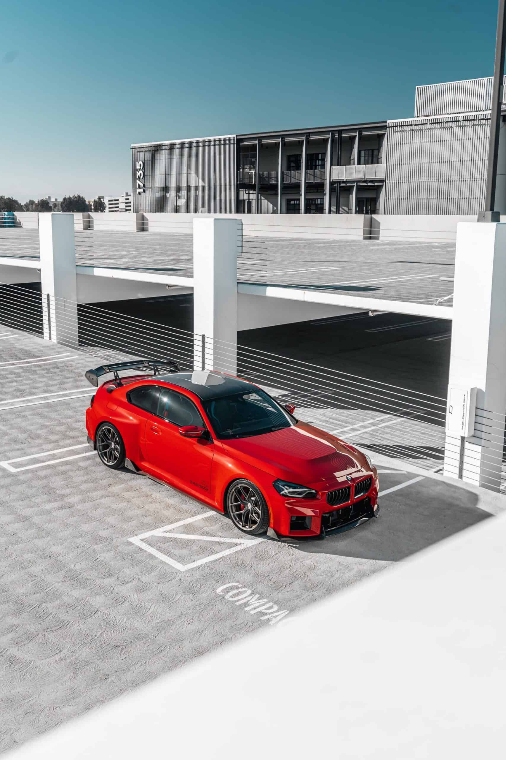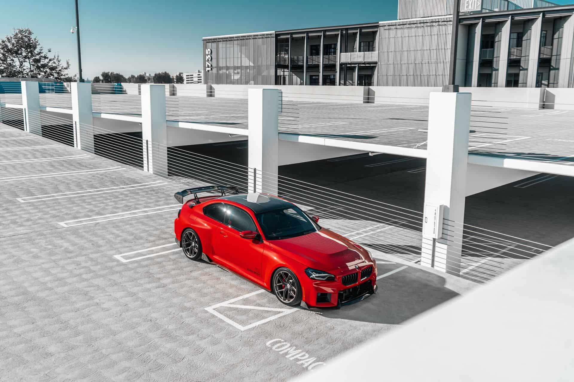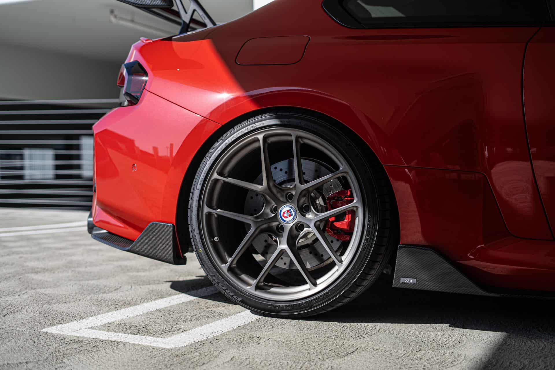 By far the most expensive upgrade applied to this Toronto Red M2 is the wheel design. These HRE Wheels R101LW will set you back a hefty $14,800 and perfectly suit the M car. It would seem this M2 has been lowered a bit for greater visual drama. At the front, the carbon fiber spoiler lip accentuates the aggressive look of this tricked-out G87. An interesting change ADRO made was to swap out the kidney grille for its own design. It eschews the original horizontal slats for vertical bars. As with the tuner’s other custom bits, it too is made from carbon fiber. The new grille costs $1,250 and is a throwback to the kidney design used for the preceding F87 generation.