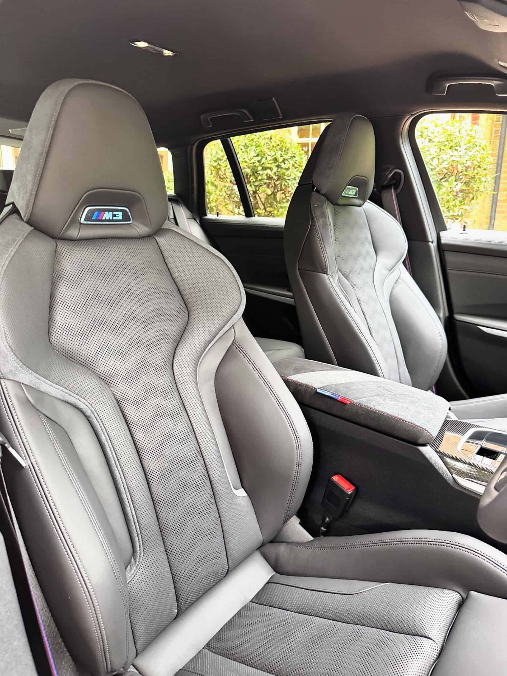 Eagle-eyed readers will notice there is one upgrade inside the cabin. Look between the front seats and see the central armrest wrapped in Alcantara. It boasts red contrasting stitching and has the famous three M colors to go along with the M3 badges on the headrests. Some would’ve opted for a more daring interior, but you can’t go wrong with black.