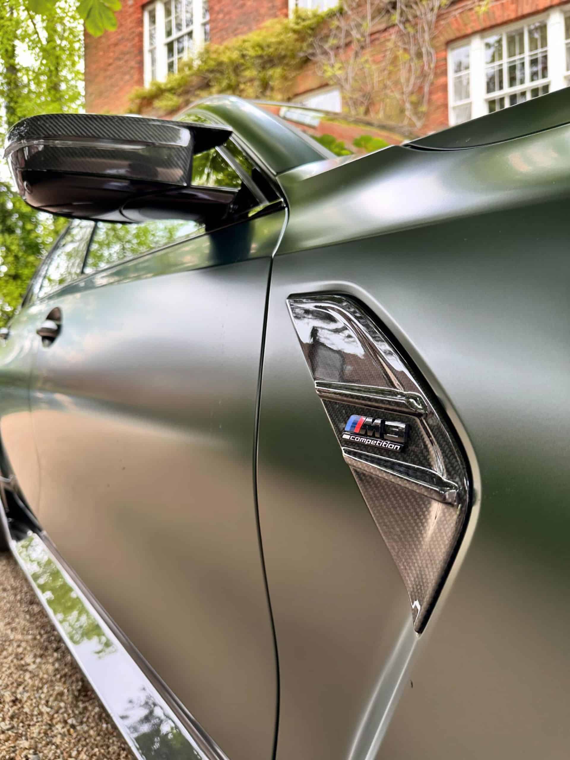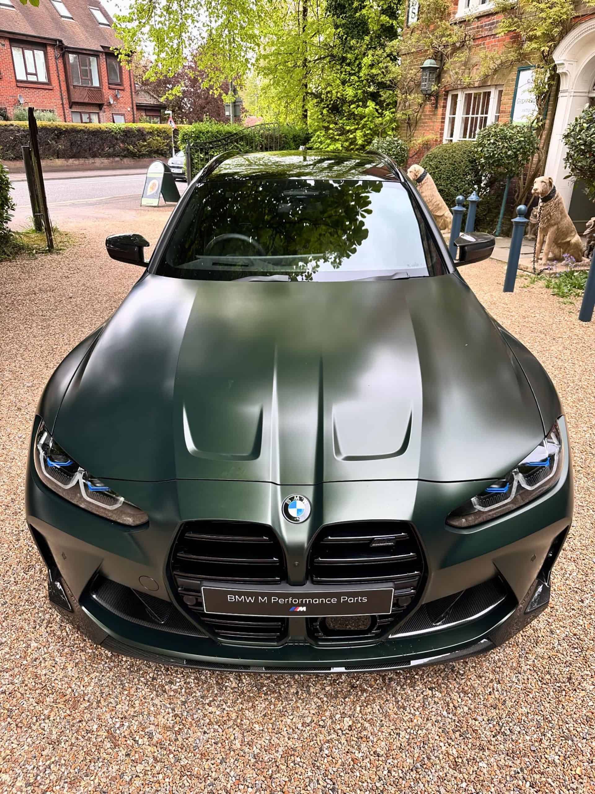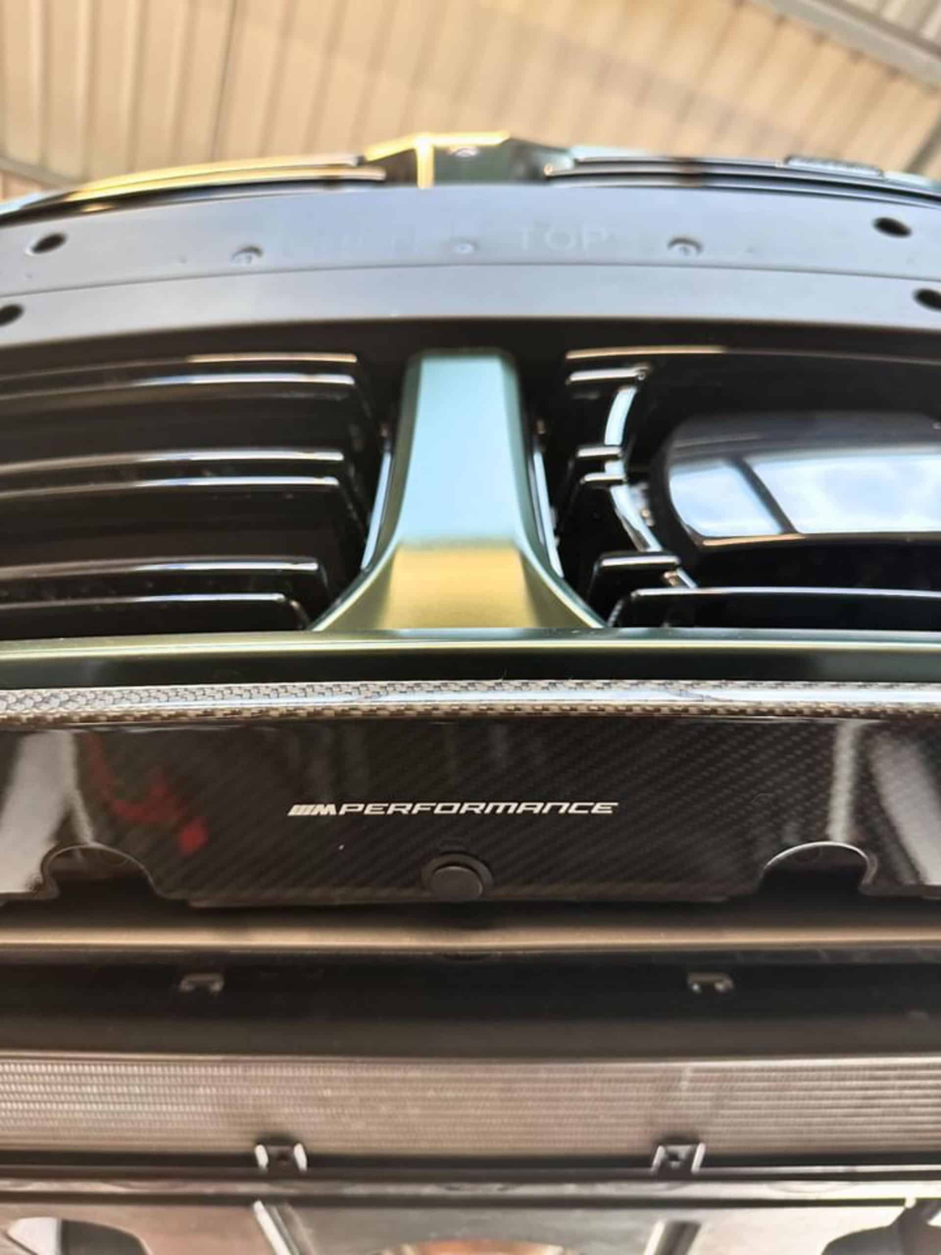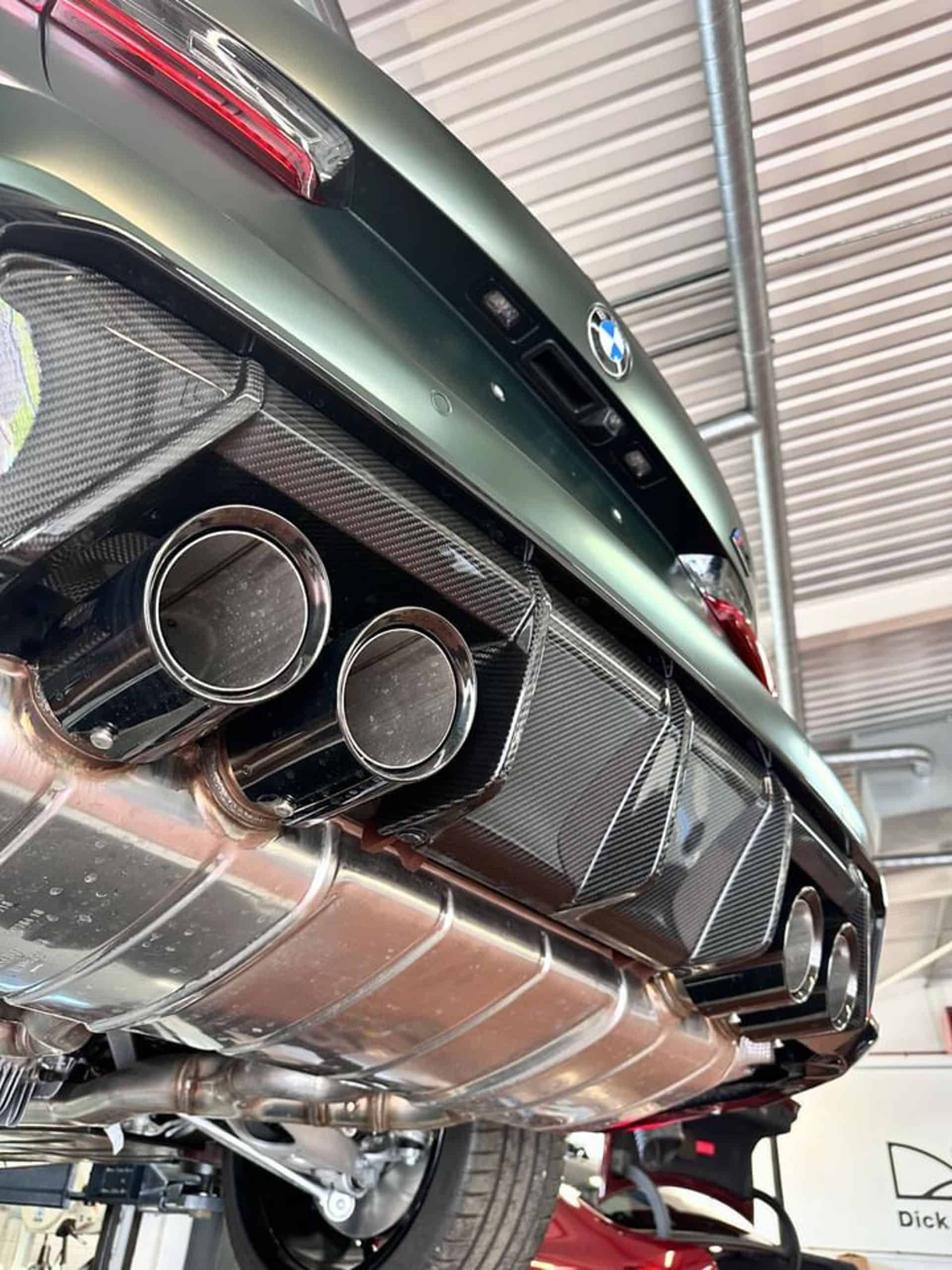 Featuring a carbon fiber body kit, the AMG C63 Estate rival is finished in Frozen Deep Green. It’s a matte Individual paint we typically associate with the M5 CS. We’re honestly still not big fans of all-black wheels, but they work here by completing the dark body accents. Those laser headlights have the Shadowline treatment while the roof is also black. As a reminder, there’s no carbon fiber roof option for the M3 Touring. However, tuners have already installed a lightweight panel.