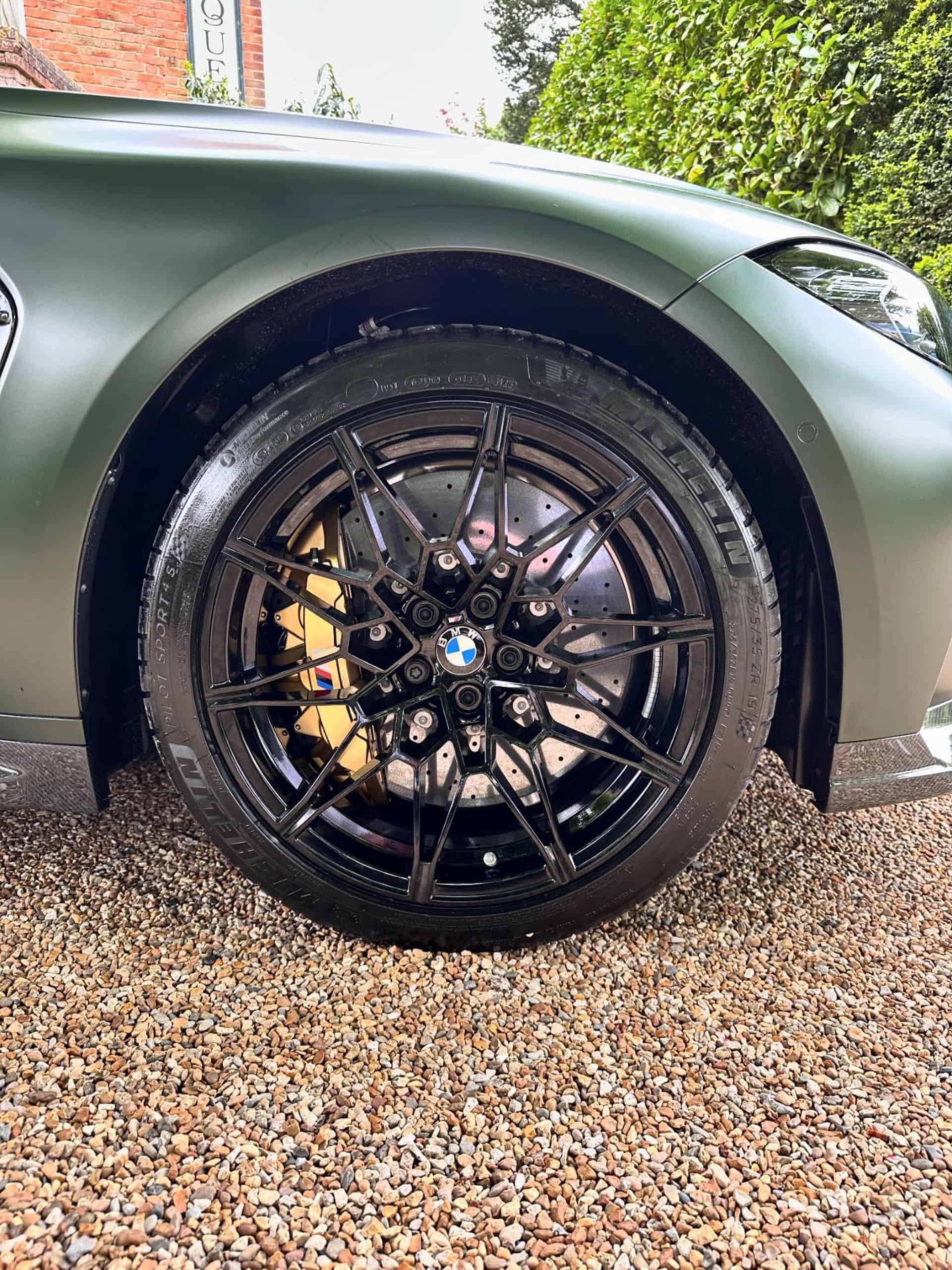 Whoever configured this G81 spared no expense since the super wagon has carbon ceramic brakes as denoted by the gold calipers. It even has a carbon fuel filler cap from the M Performance Parts catalog. Interestingly, it has standard seats rather than the optional body-hugging seats with a carbon shell. Since the M3 Touring is more of an all-rounder for extended trips, it makes sense not to opt for the bucket seats.