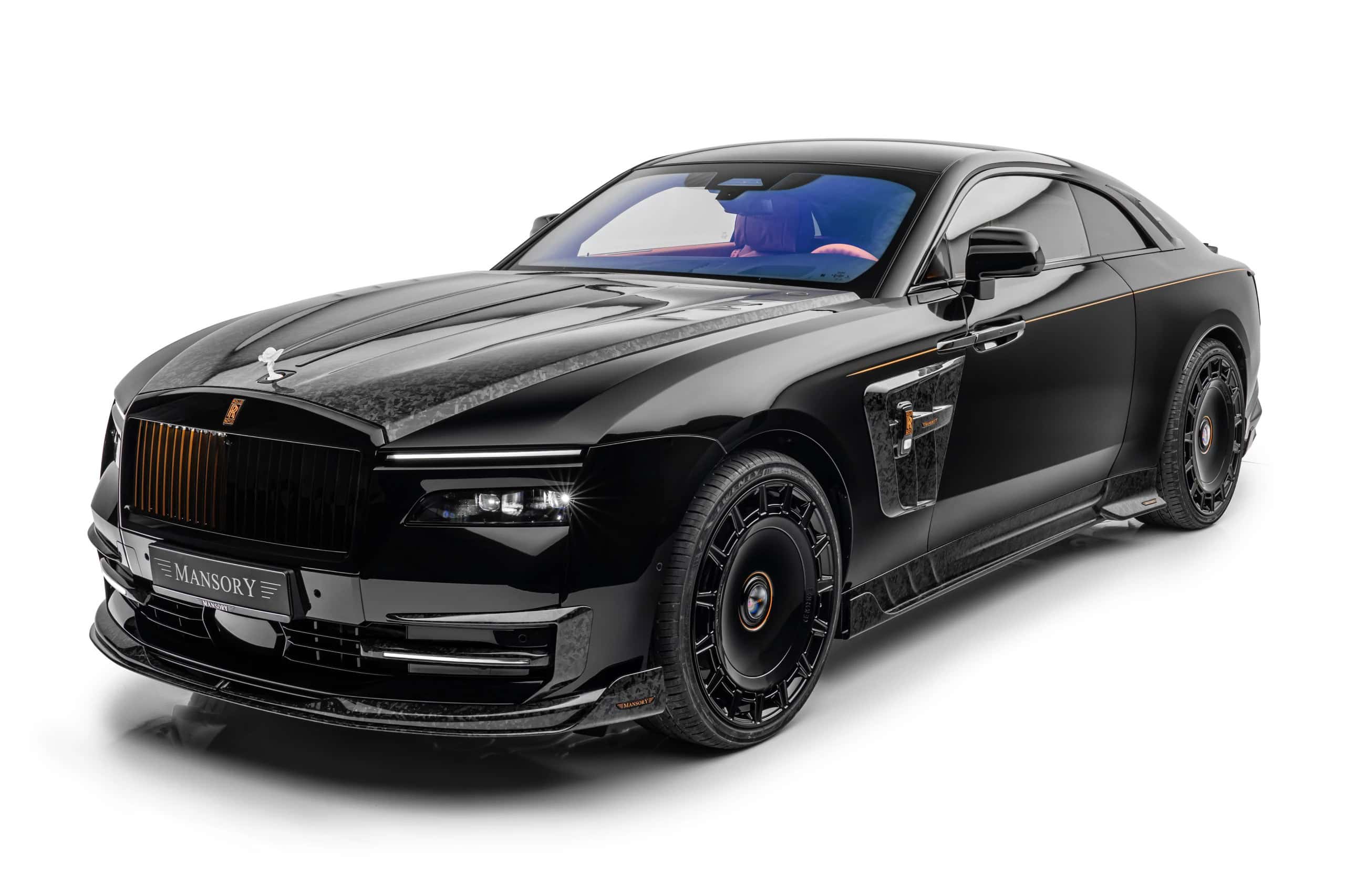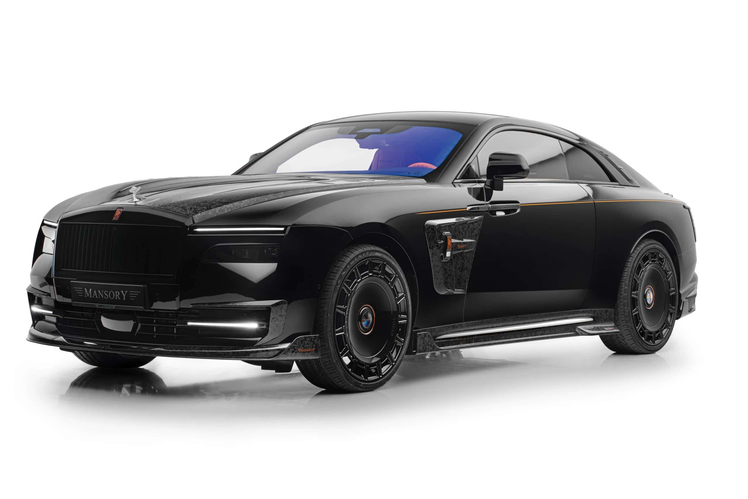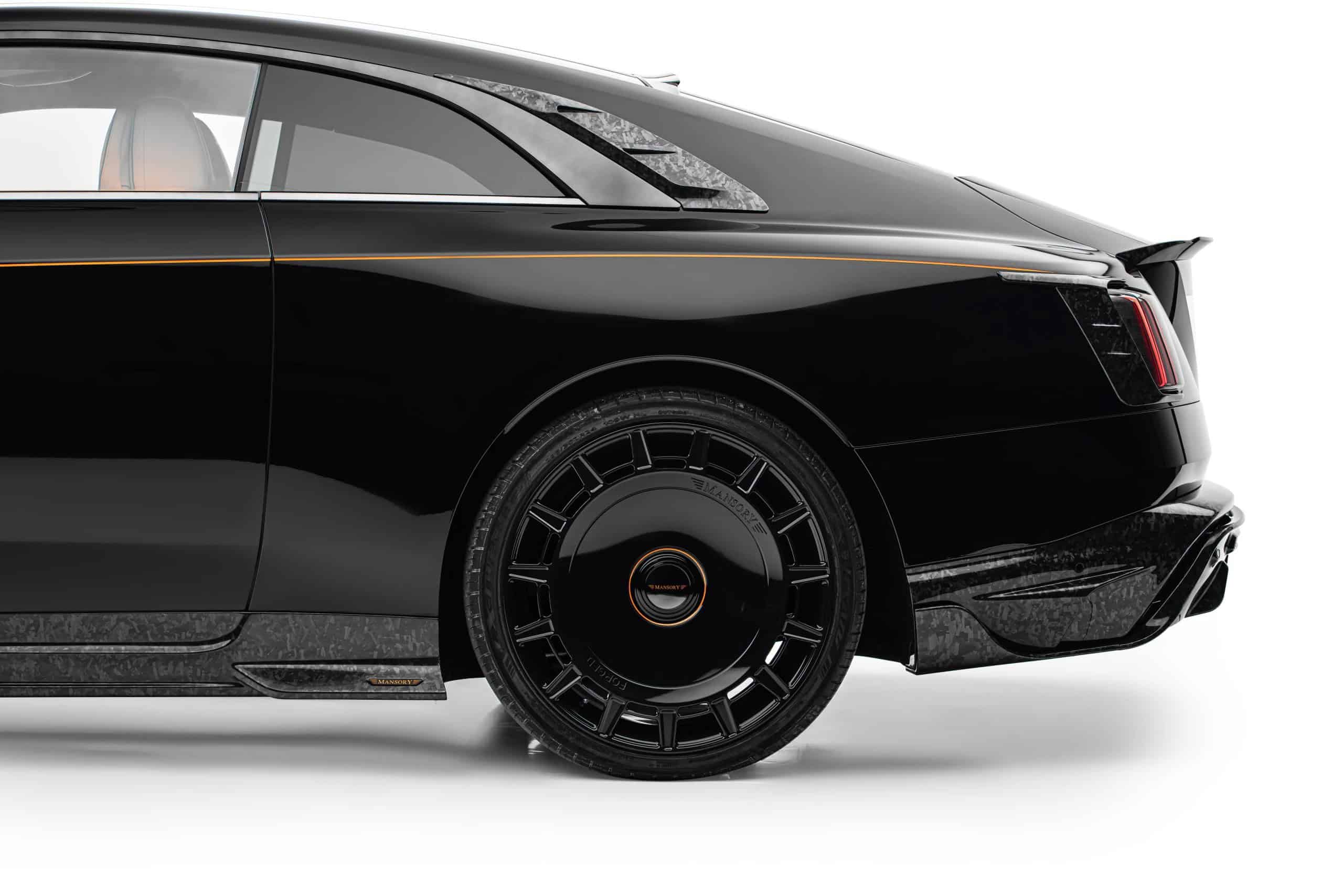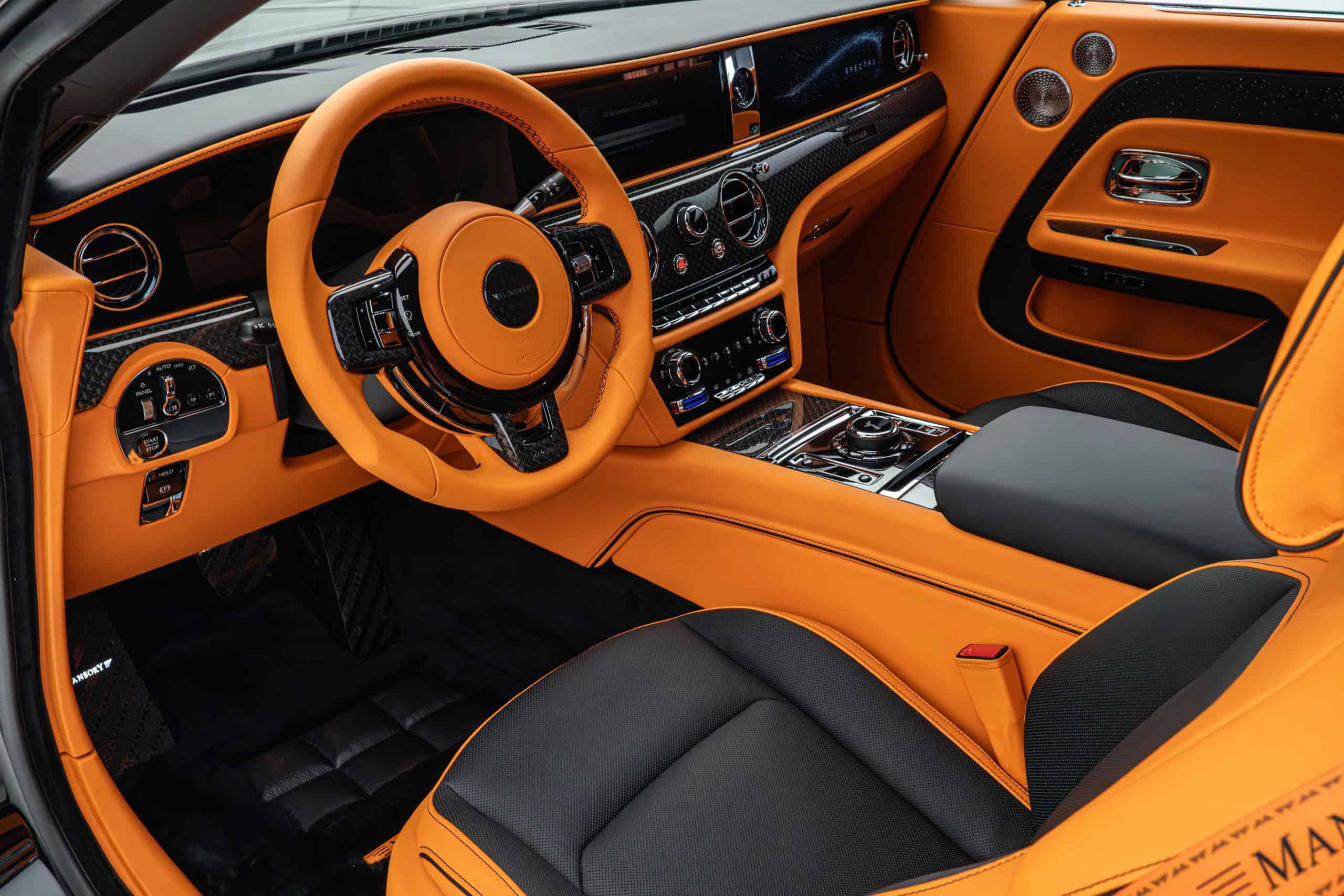As if the Spectre wasn’t already an imposingly large car, Mansory enlarged the side skirts. It also applied (fake) air intakes in the front fenders and quarter panels. At the rear, the trunk lid now carries a spoiler made from carbon fiber as well. The forged and polished wheels are available in 23- and 24-inch sizes, with the latter featuring meaty 295/30 R24 tires. Other changes include an extra set of LED daytime running lights in the front bumper and orange accents for the grille and RR emblem.