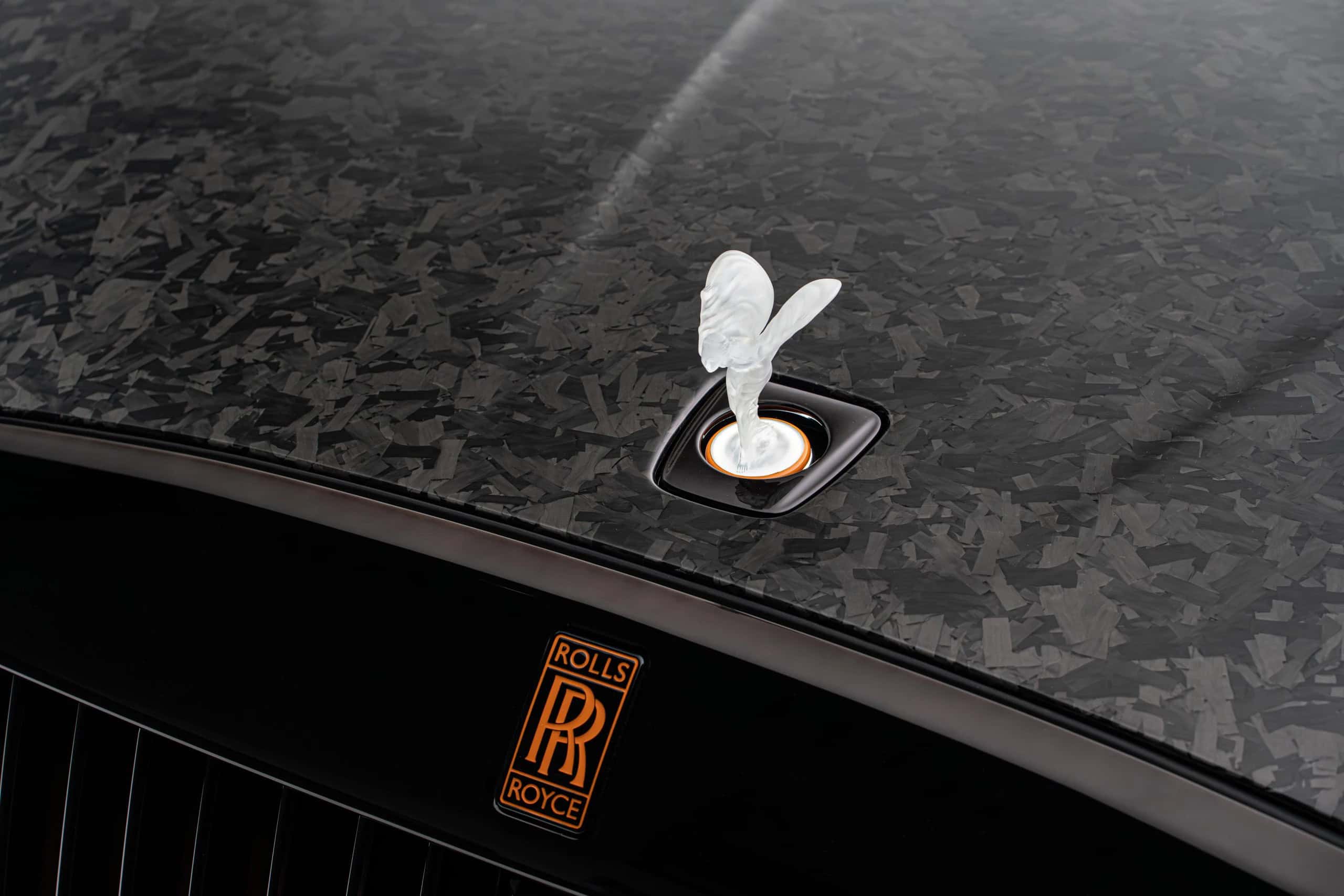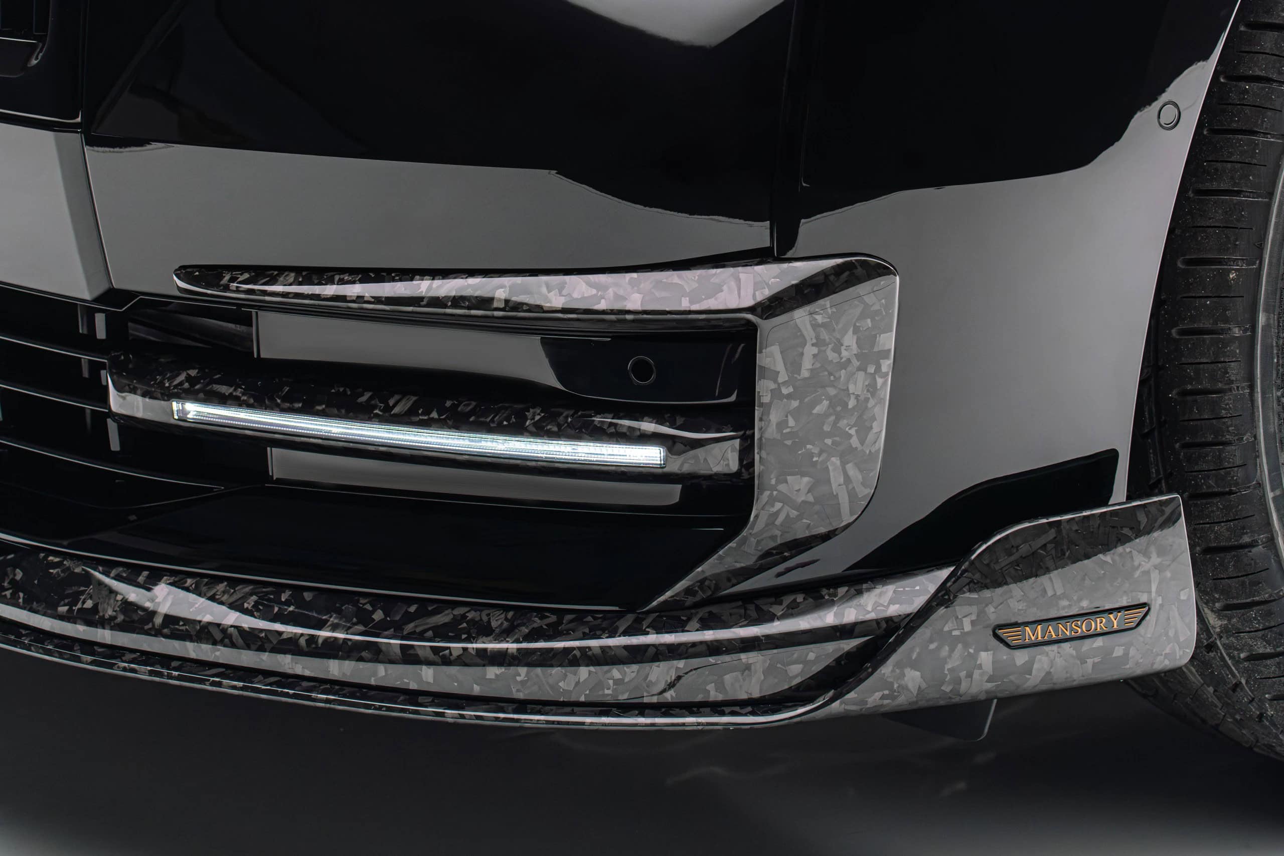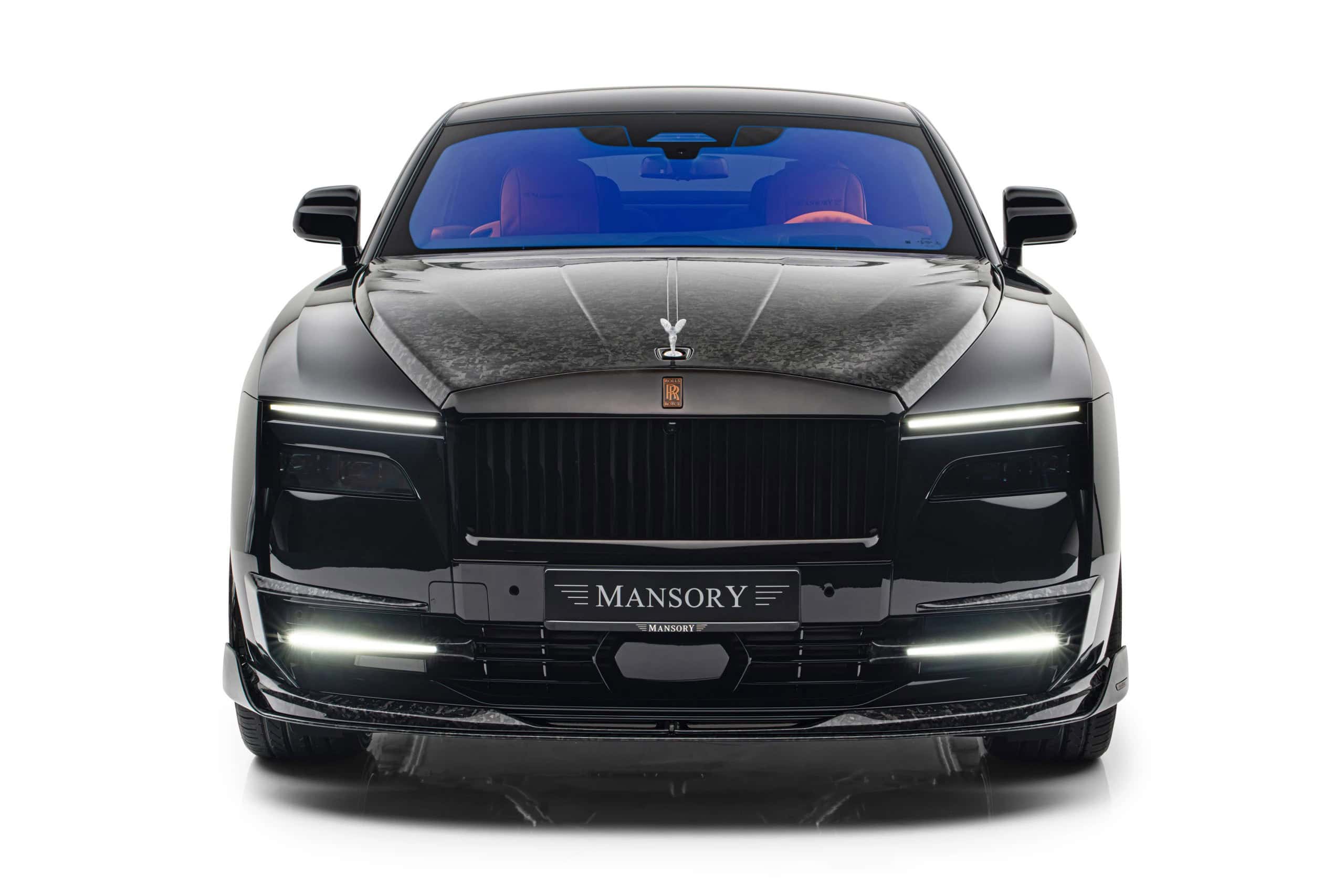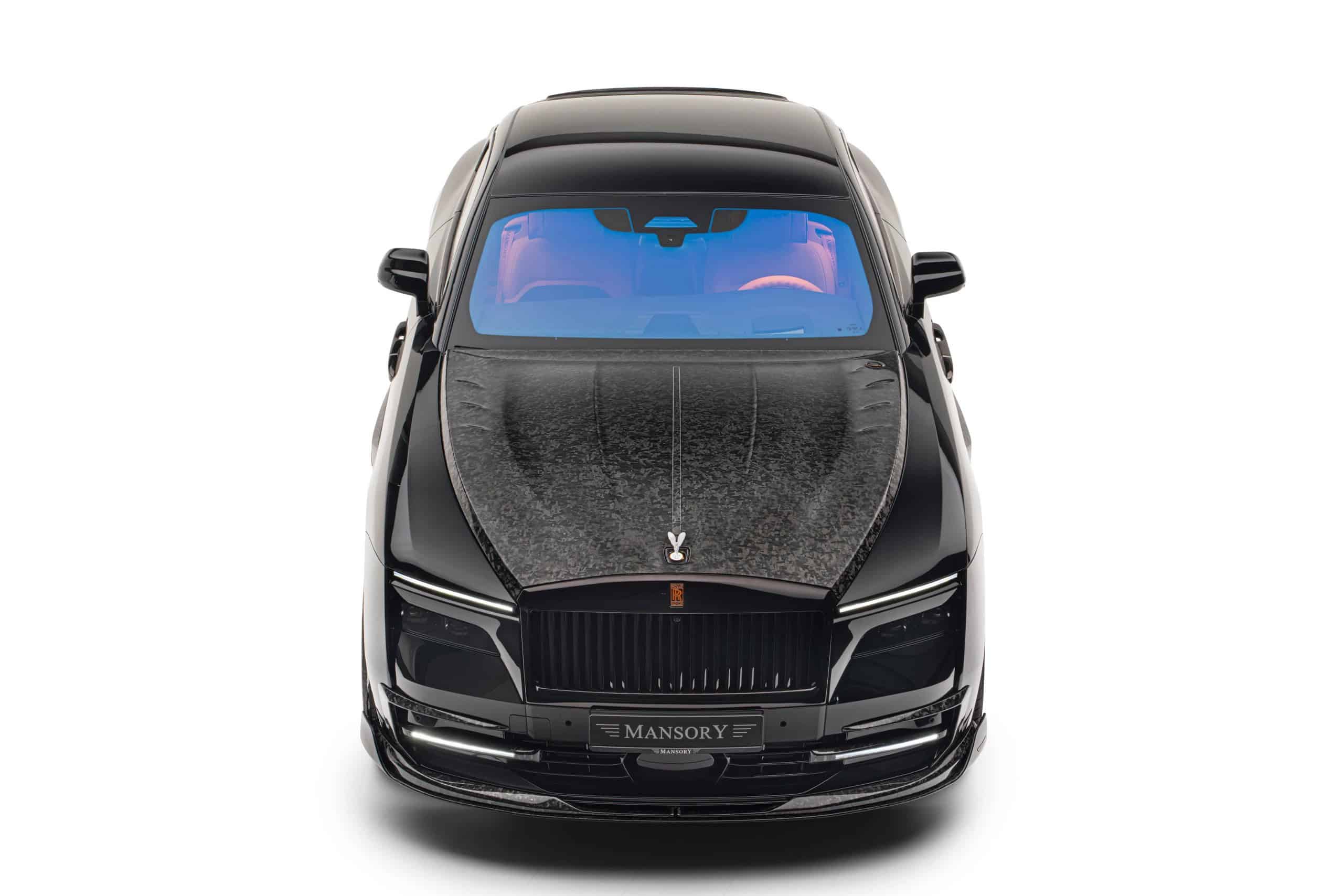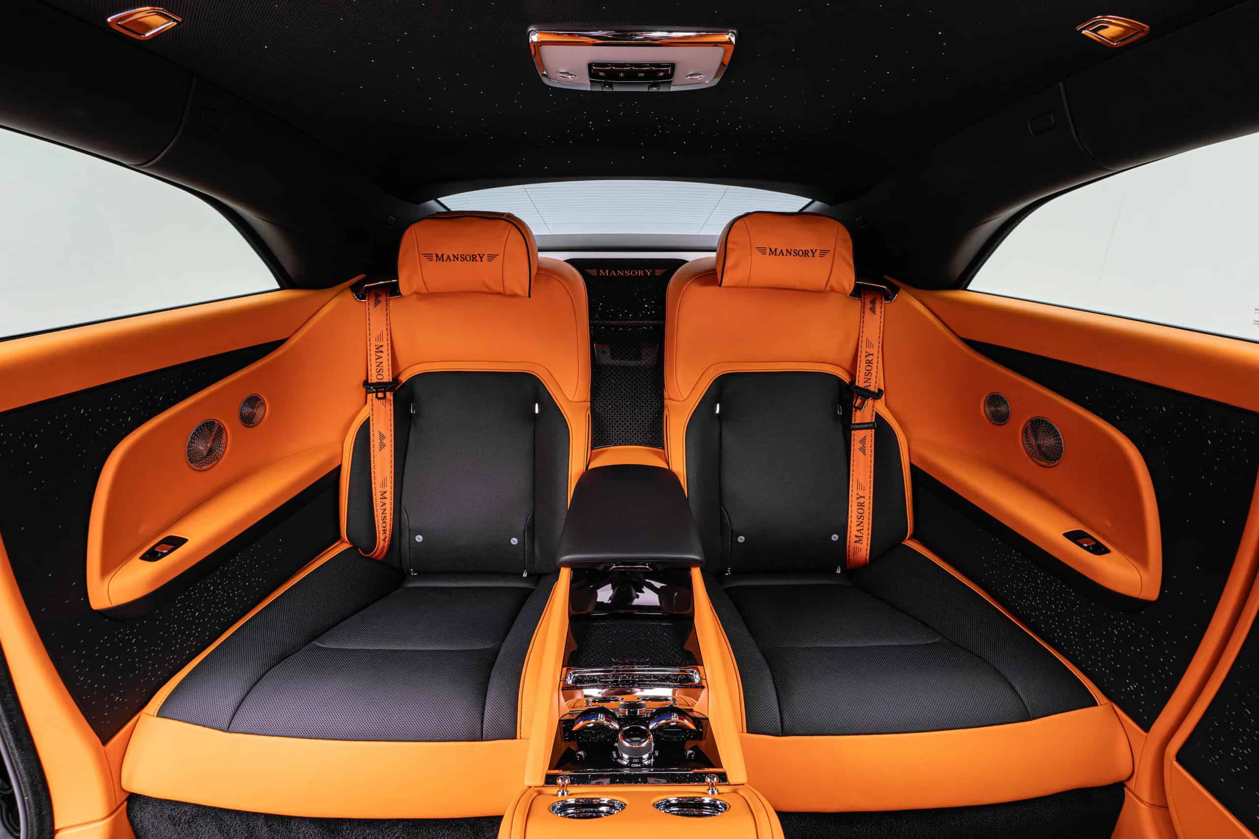 As if the Spectre wasn’t already an imposingly large car, Mansory enlarged the side skirts. It also applied (fake) air intakes in the front fenders and quarter panels. At the rear, the trunk lid now carries a spoiler made from carbon fiber as well. The forged and polished wheels are available in 23- and 24-inch sizes, with the latter featuring meaty 295/30 R24 tires. Other changes include an extra set of LED daytime running lights in the front bumper and orange accents for the grille and RR emblem.