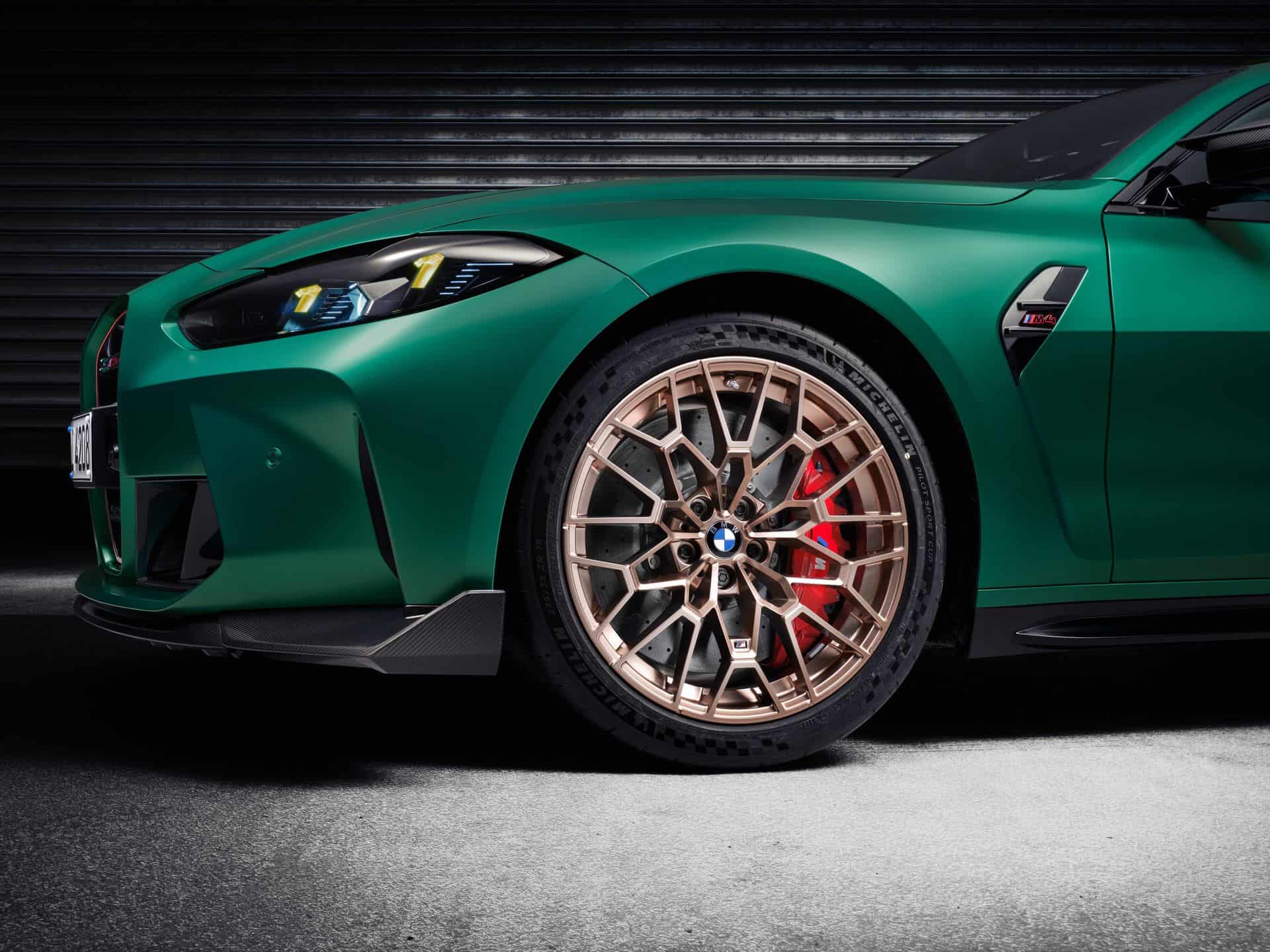 BMW fits the M4 CS with forged wheels measuring 19 inches at the front and 20 inches at the rear. The alloys are available in either matte gold bronze or black and come wrapped in 275/35 ZR19 and 285/30 ZR20 rubber, respectively. Track tires are a no-cost option. Inside, the electrically adjustable front carbon bucket seats are standard while the flat-bottomed steering wheel debuted with the M4 LCI. Consequently, the M3 CS didn’t have it.