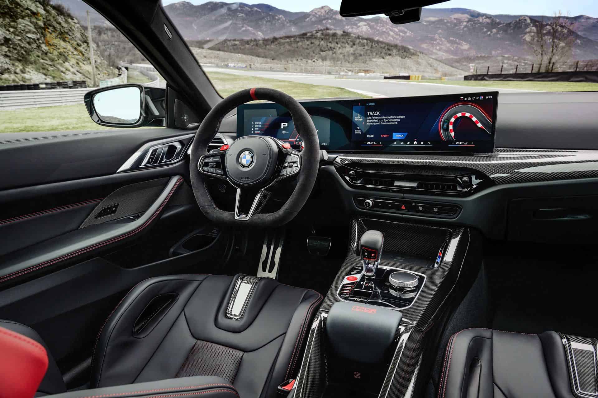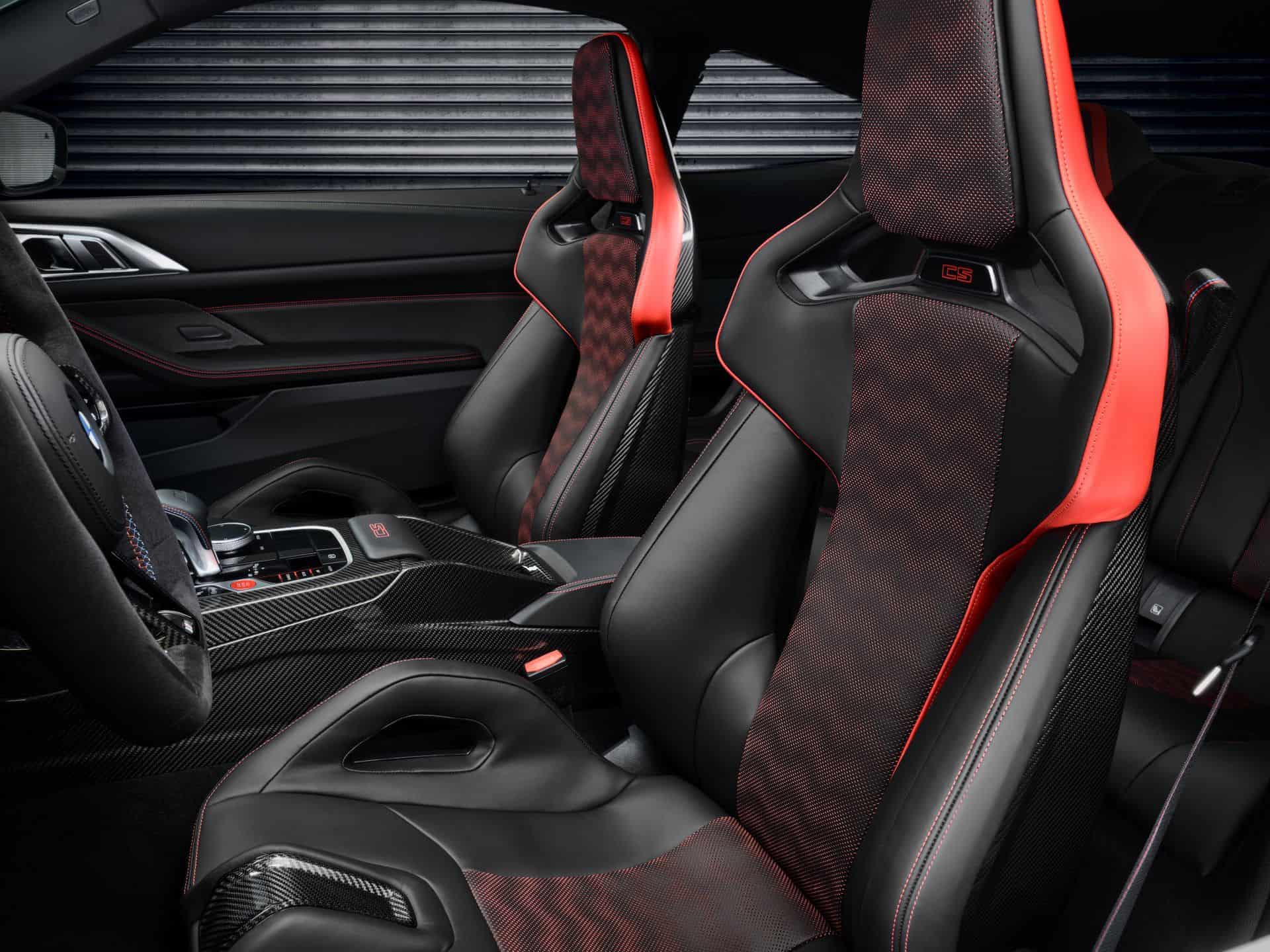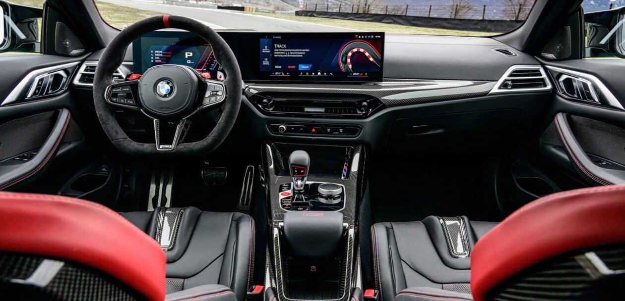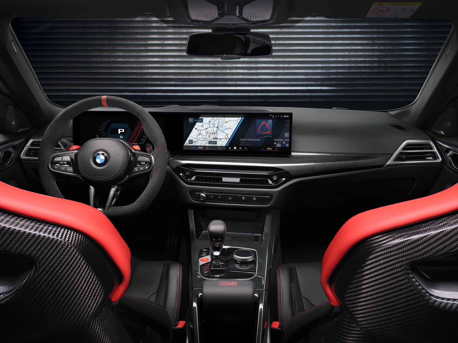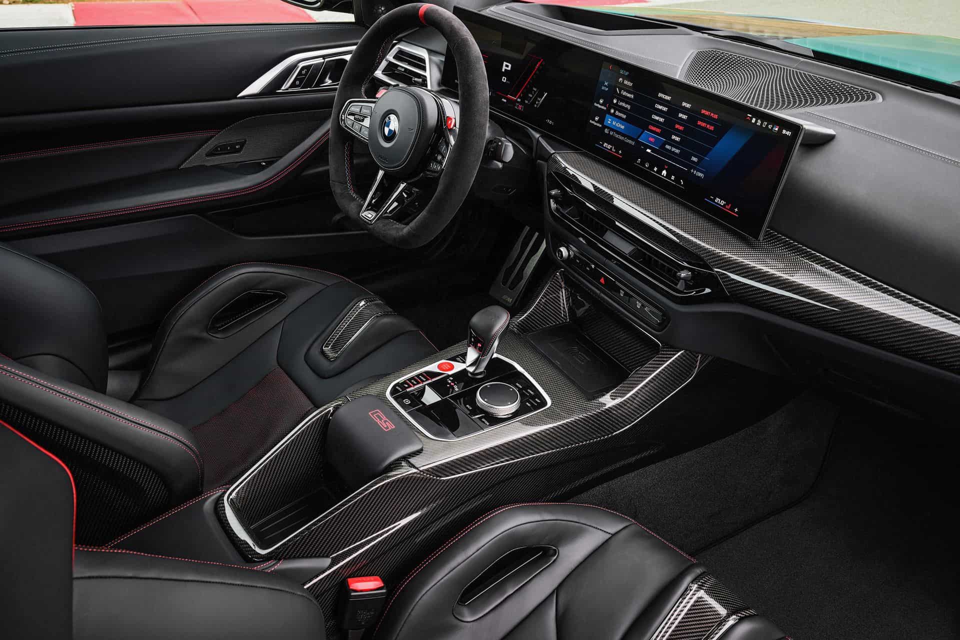 The BMW M4 CS features a 3-spoke M Alcantara steering wheel with a flat bottom and a red center stripe. It includes CFRP shift paddles for a racing feel. Of course, the heated M Carbon bucket seats also come with illuminated M4 CS badges. These seats are clad in Black/Red Merino leather with distinct stitching, extending the bi-color theme to the rear. The interior is further enhanced with Black leather door panels, red “CS” lettering on the console, M seat belts in BMW tricolor, an Anthracite headliner, carbon fiber trim strips, and “M4 CS” inscribed door sill plates, creating an exclusive atmosphere. The latest version of the BMW iDrive 8.5 is standard as well.