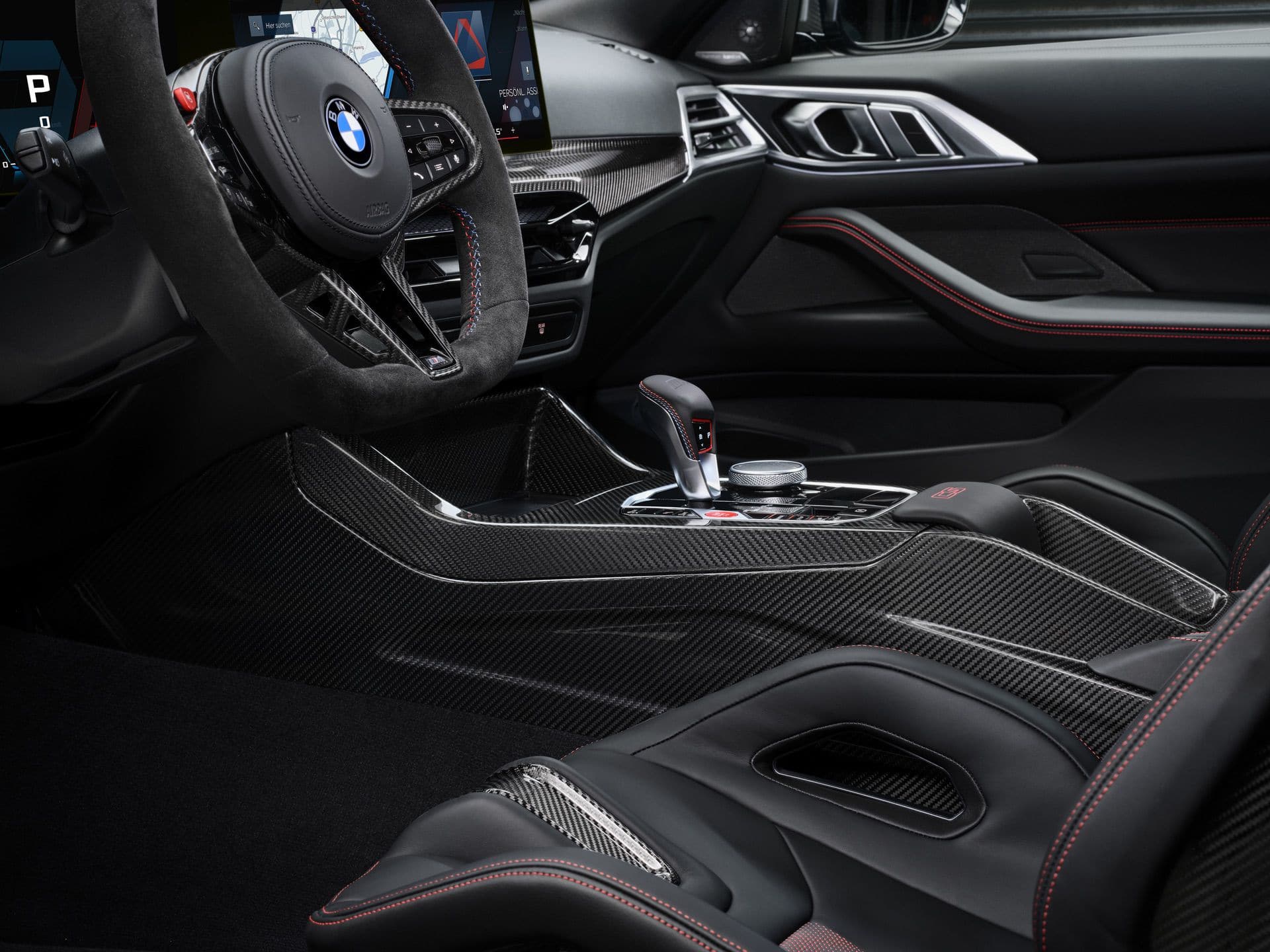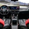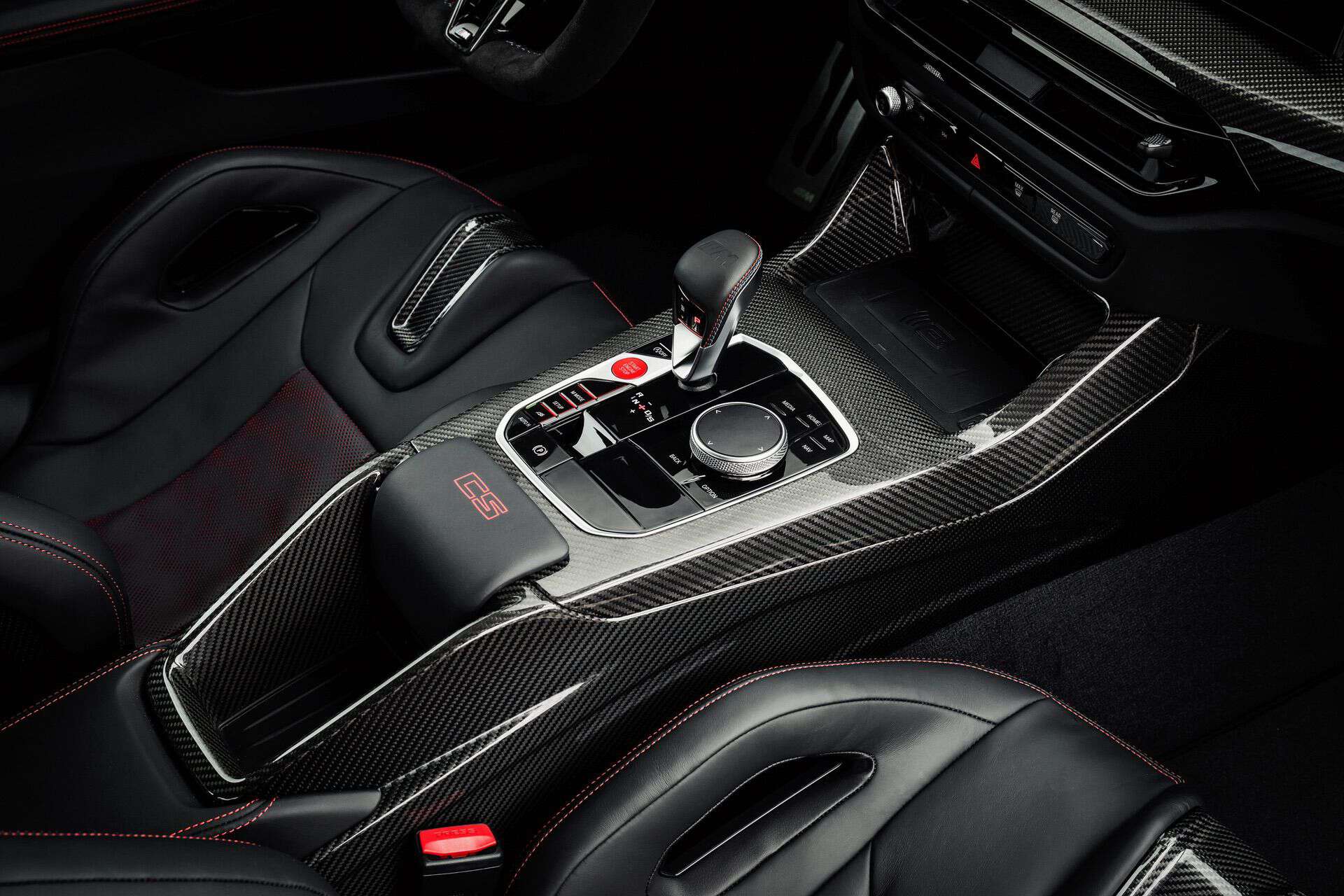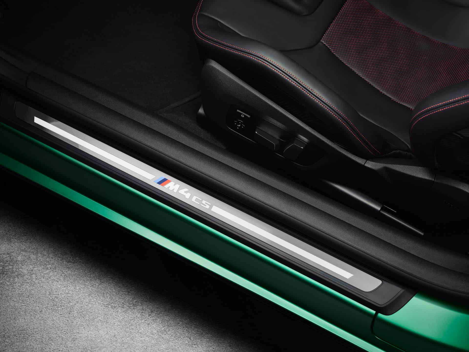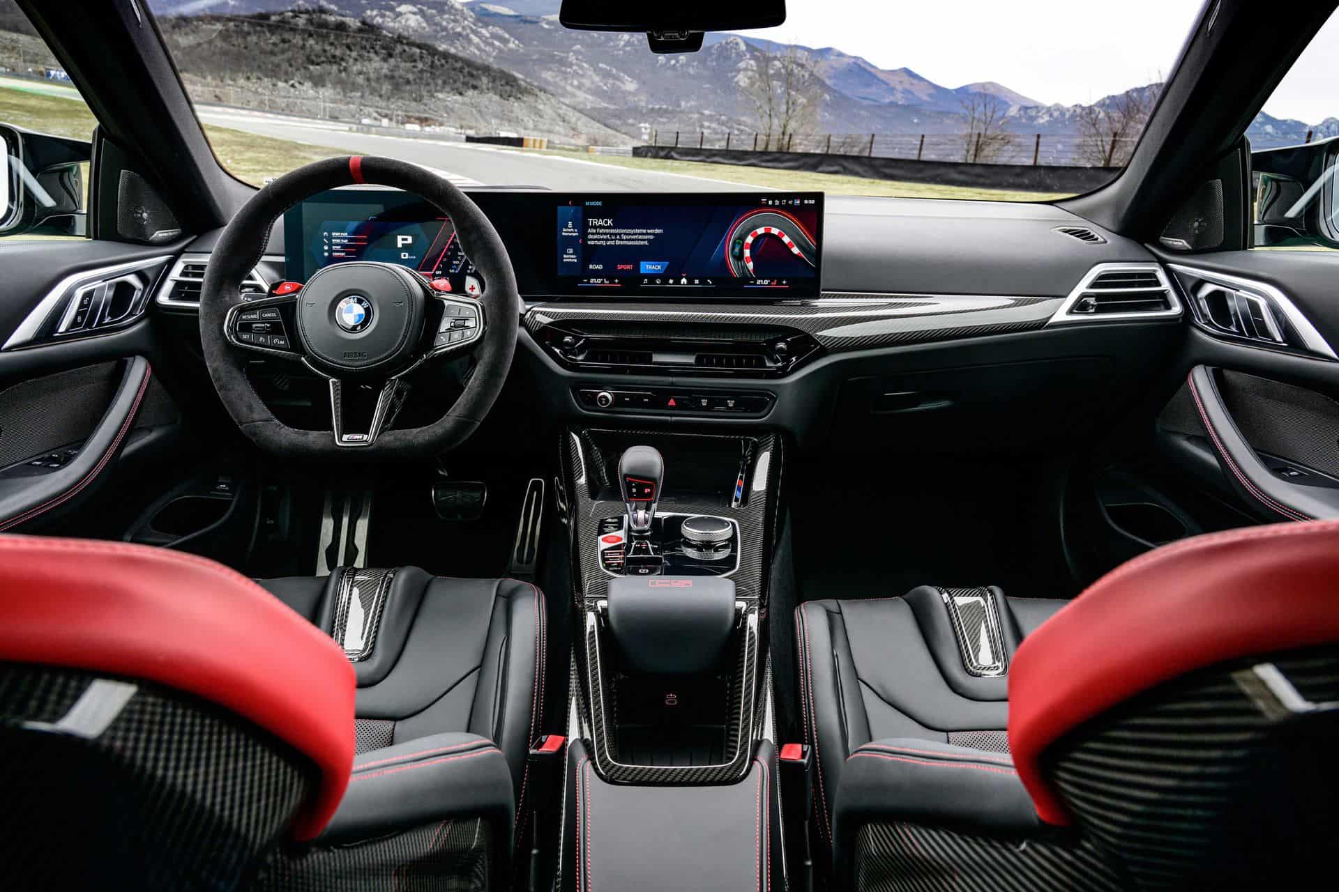 The BMW M4 CS features a 3-spoke M Alcantara steering wheel with a flat bottom and a red center stripe. It includes CFRP shift paddles for a racing feel. Of course, the heated M Carbon bucket seats also come with illuminated M4 CS badges. These seats are clad in Black/Red Merino leather with distinct stitching, extending the bi-color theme to the rear. The interior is further enhanced with Black leather door panels, red “CS” lettering on the console, M seat belts in BMW tricolor, an Anthracite headliner, carbon fiber trim strips, and “M4 CS” inscribed door sill plates, creating an exclusive atmosphere. The latest version of the BMW iDrive 8.5 is standard as well.