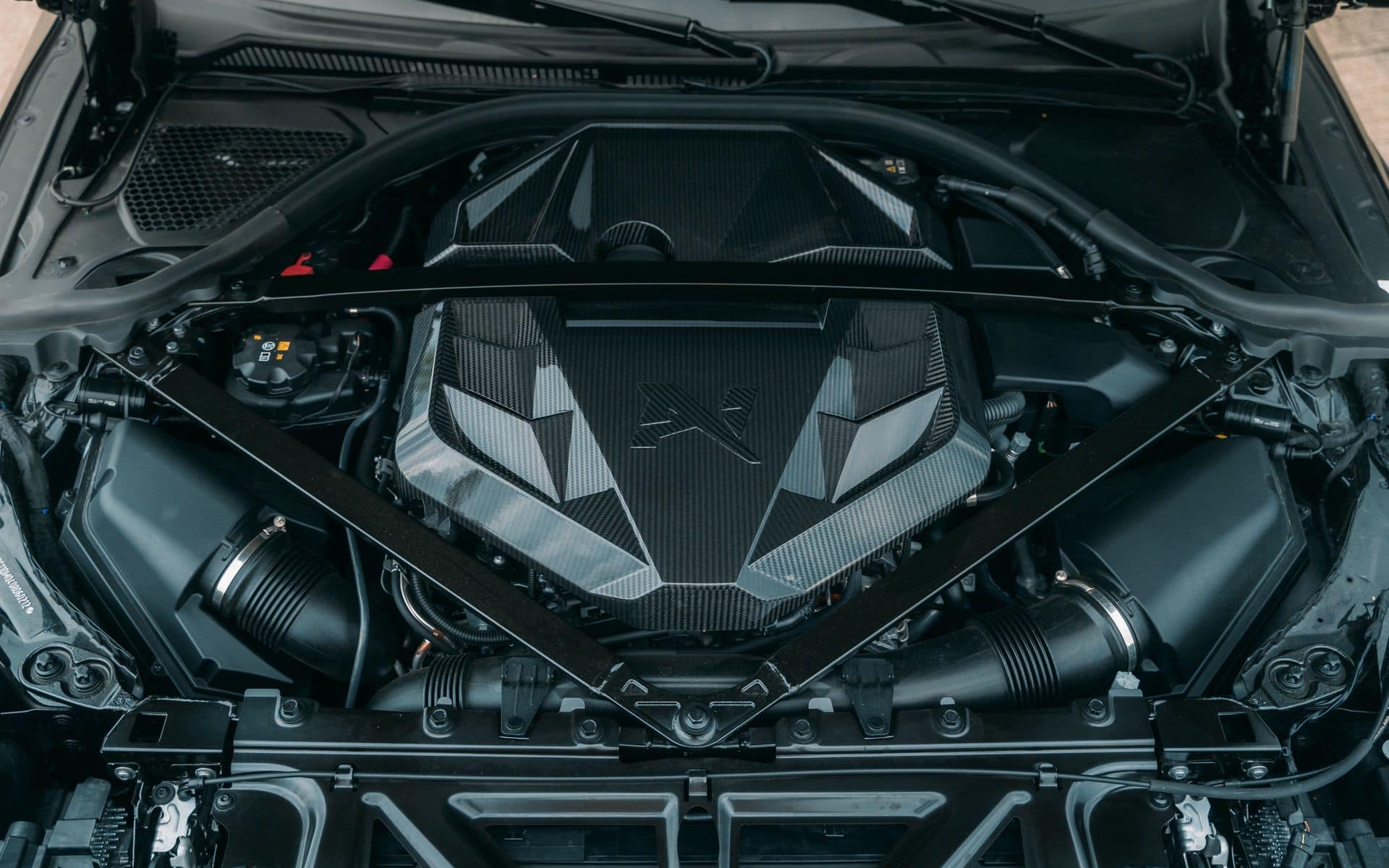 The manual G87 shown here is outfitted with a great selection of parts from the Alpha-N product list. You will spot a front spoiler, front grille, bonnet, and fenders with louvers at the front, all made out of the composite material. At the rear, there is a carbon wing, carbon diffuser, and underbody floor also made out of the same fibers. The finishing touch is found under the bonnet in the form of a carbon engine cover. The fit and finish of all are at a high quality. The parts sit flush and fit wonderfully to the standard bodywork of the M2. They also offer TĂśV-certification, which is vital.
