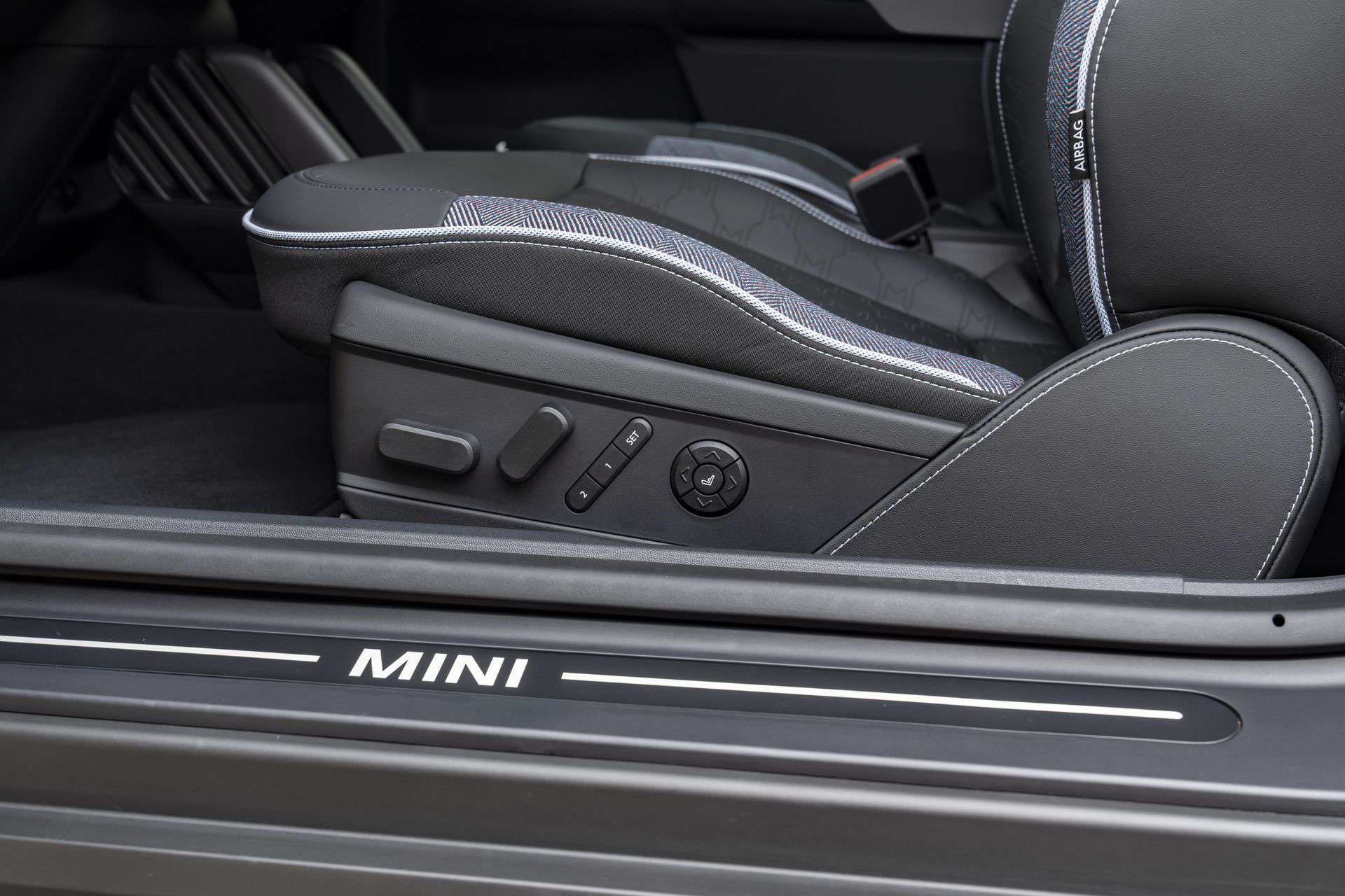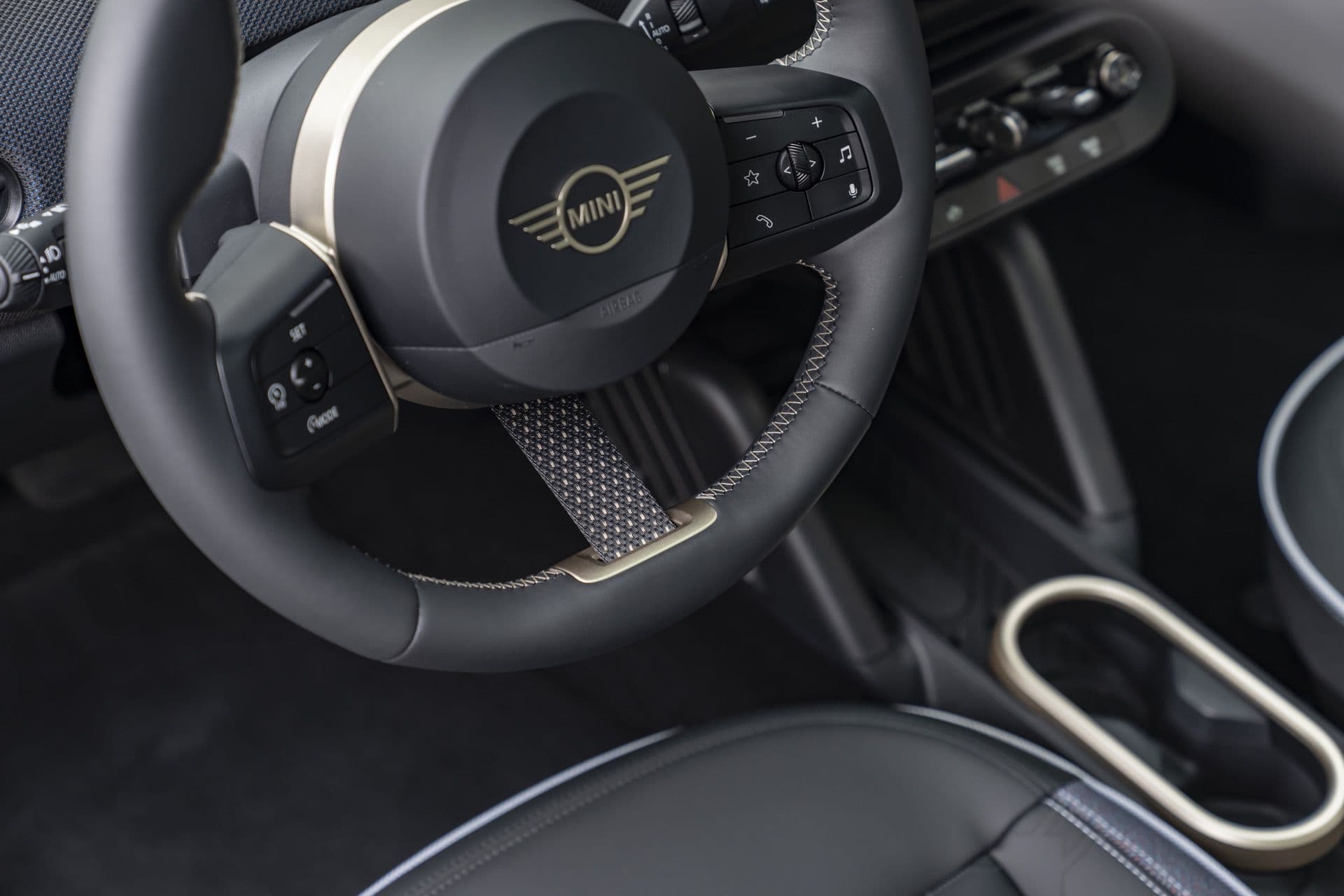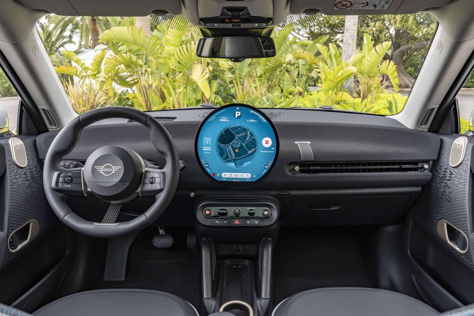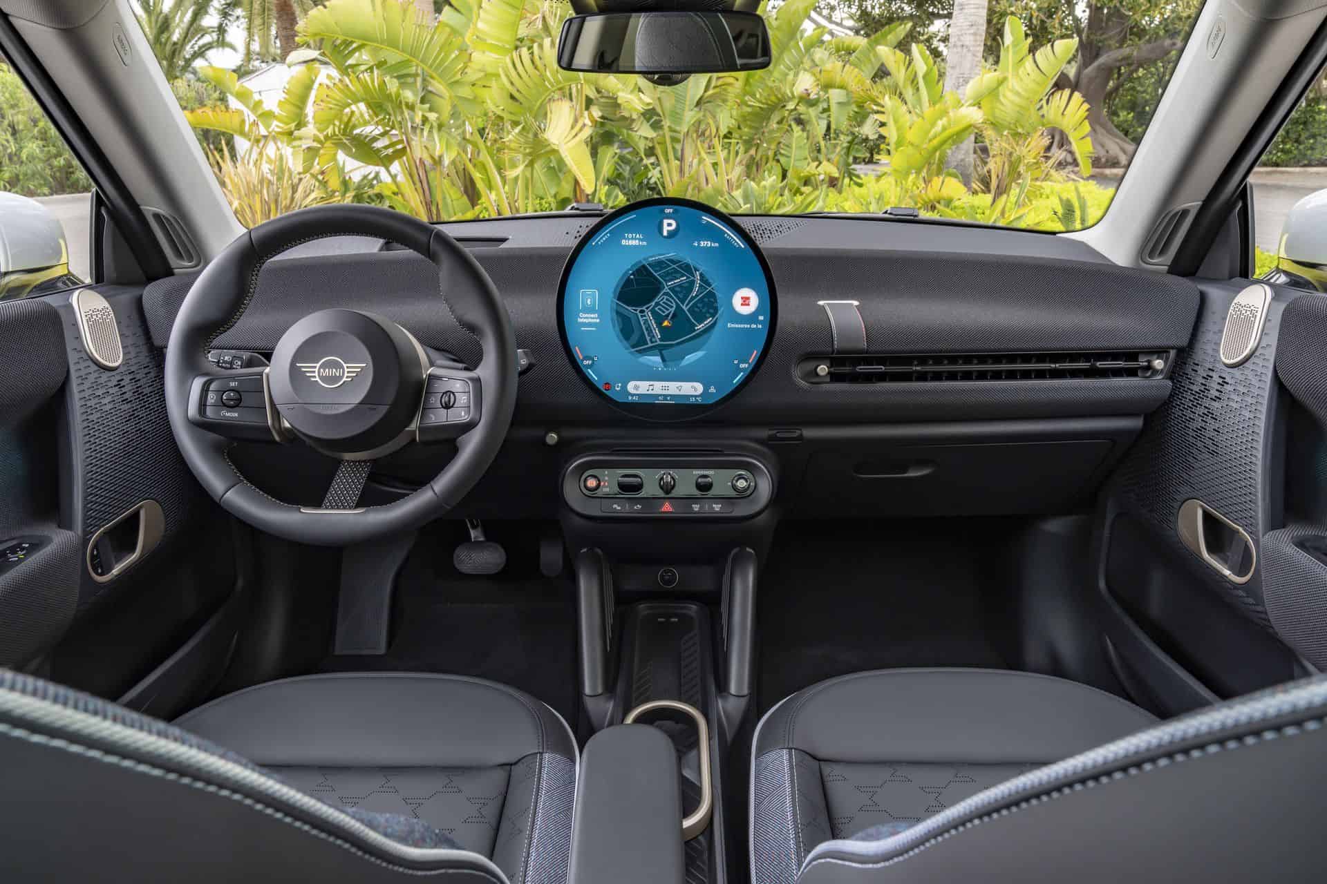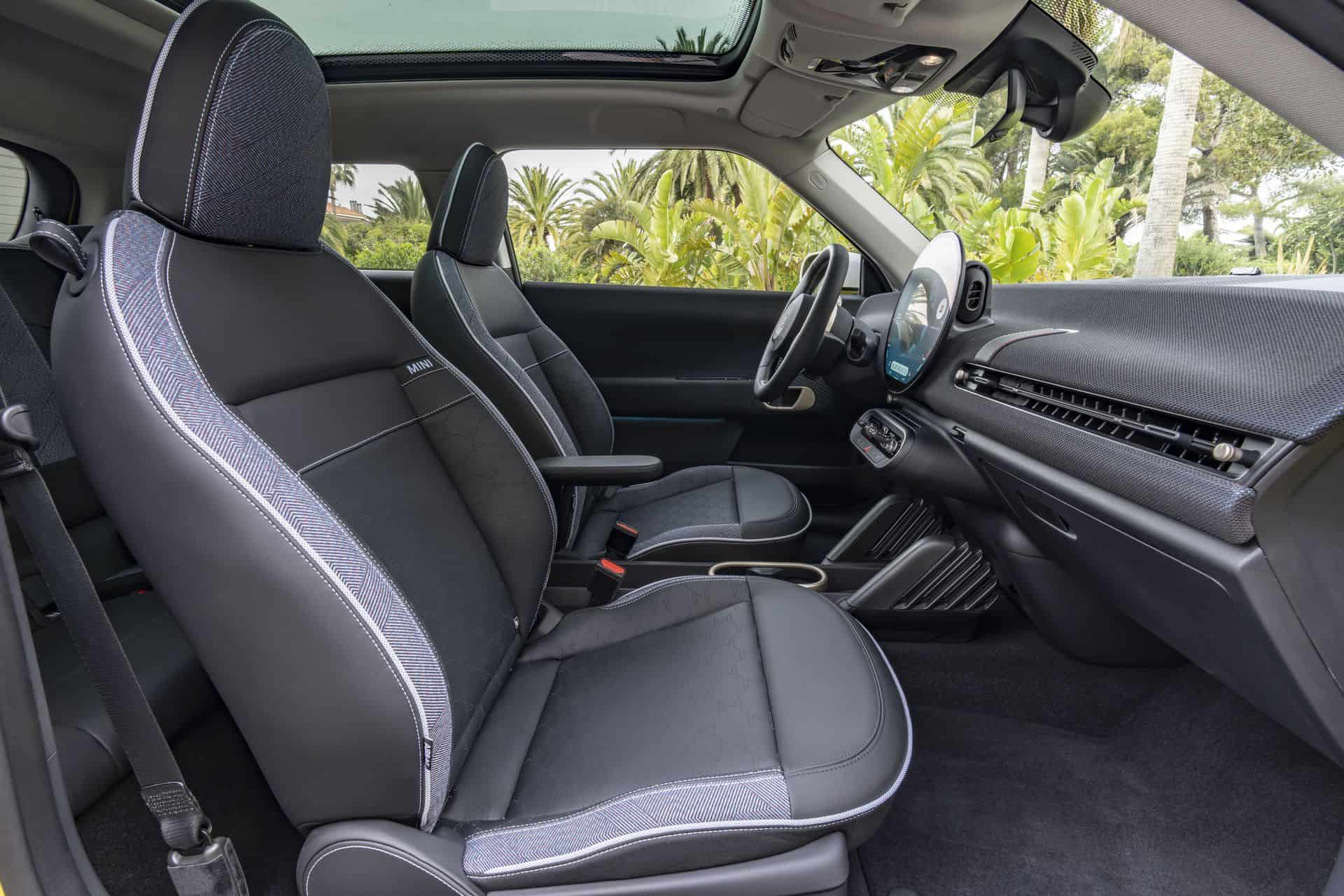 Next, the new MINI Cooper SE features all-vegan upholstery, complemented by knitted fabric on the dashboard and door panels. For those seeking detailed customization, the strap that functions as a spoke on the steering wheel and the dashboard strap can be personalized with various color and stitching options. Some might call these details statements of style and choice.