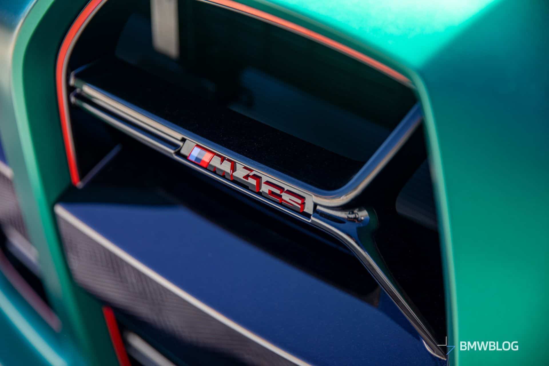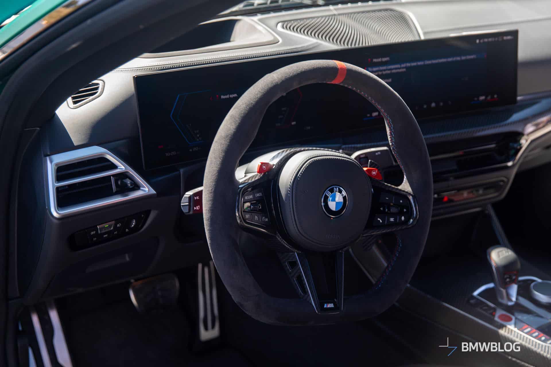 We hopped inside the M4 CS on those carbon bucket seats offered as standard equipment. While the cabin looks instantly familiar, there are a couple of changes compared to the M3 CS. The coupe has a flat-bottomed steering wheel and discreetly updated air vents. Unlike the M4 CSL we mentioned earlier, the CS keeps the rear seats.