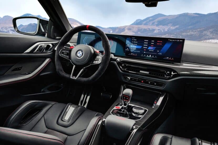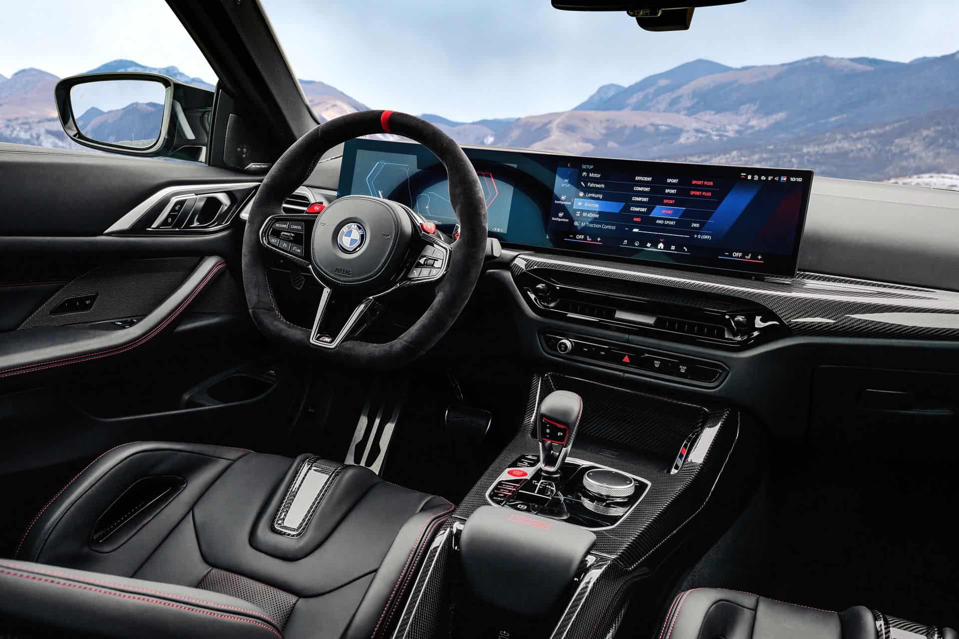 Inside, the BMW M4 CS features a distinctive 3-spoke M Alcantara steering wheel with a flat bottom and a red center stripe, along with CFRP shift paddles for an authentic racing feel. The heated M Carbon bucket seats, adorned with illuminated M4 CS badges, are upholstered in Black/Red Merino leather with unique stitching, extending this bi-color theme to the rear seats.