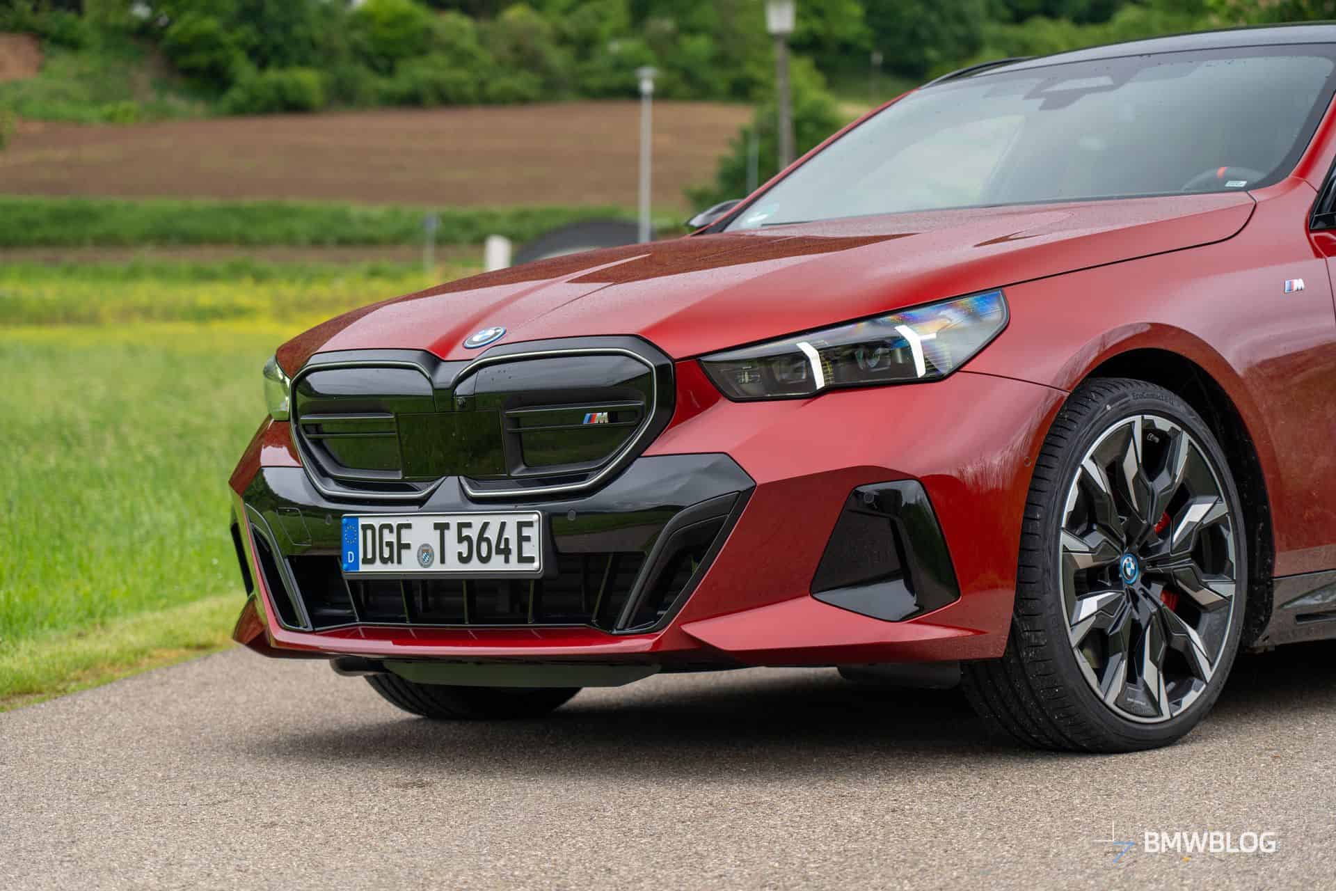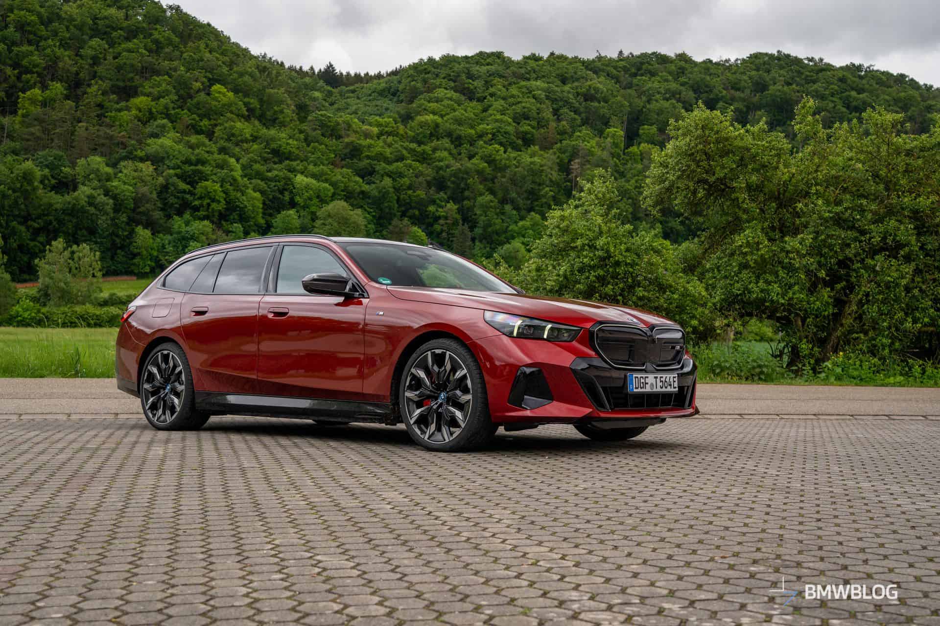 This i5 M60 xDrive Touring is painted in Fire Red, which is identical to the Vegas Red hue offered in the United States where the G61 is sadly not offered. The car we photographed has the largest wheels available for the sixth-generation 5er wagon. It’s a 21-inch aerodynamic set with a two-tone finish and carrying the “954i” codename. While the brake calipers are finished in red, customers can also have them in blue at no extra charge.